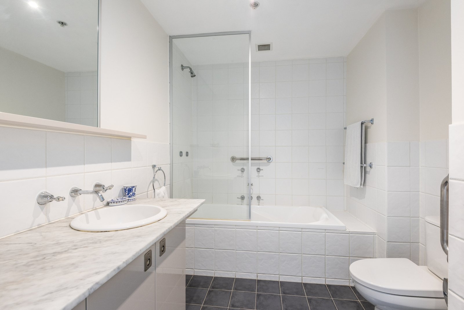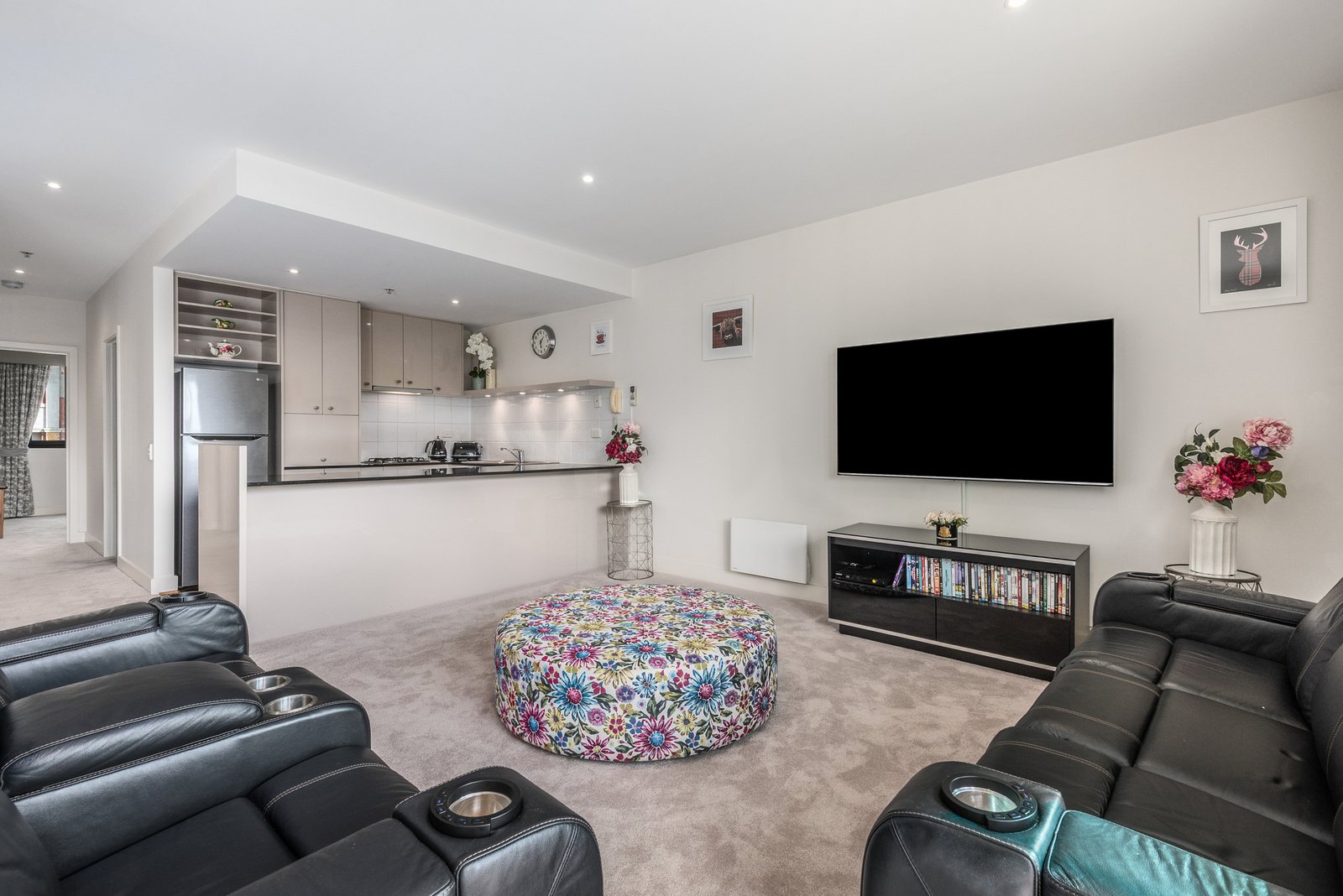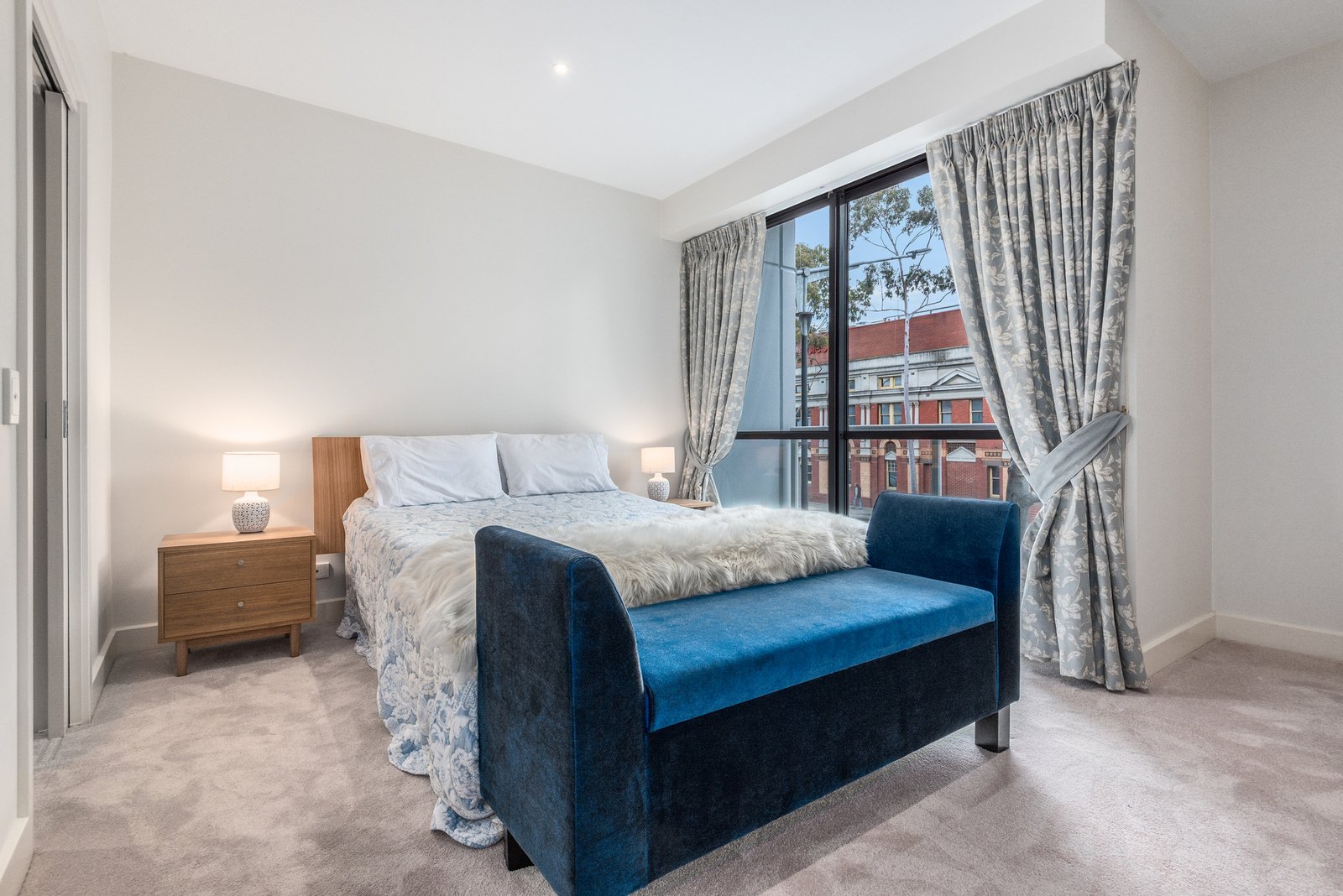 Comprising two bedrooms, the main suite includes walk-in robes, a tastefully presented ensuite with marble vanity, and direct access to a second balcony with city views. Bedroom two includes built-in robes, serviced by the stylish main bathroom, which includes a shower over bath, continuing in quality finishes. Panel heating throughout, split system heating and cooling, a separate laundry, and generous storage accommodate optimum comfort and functionality.