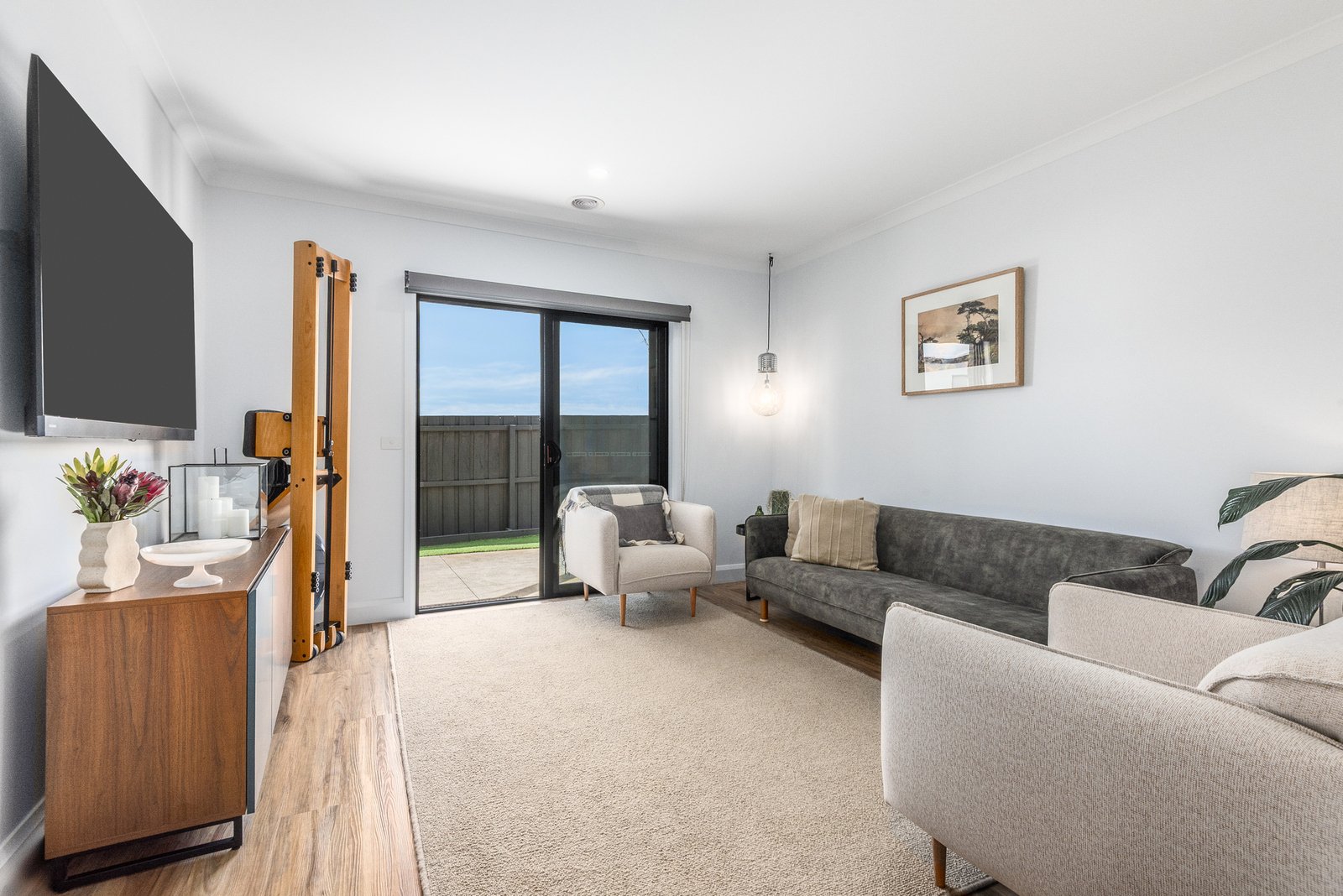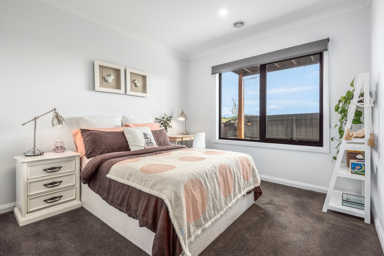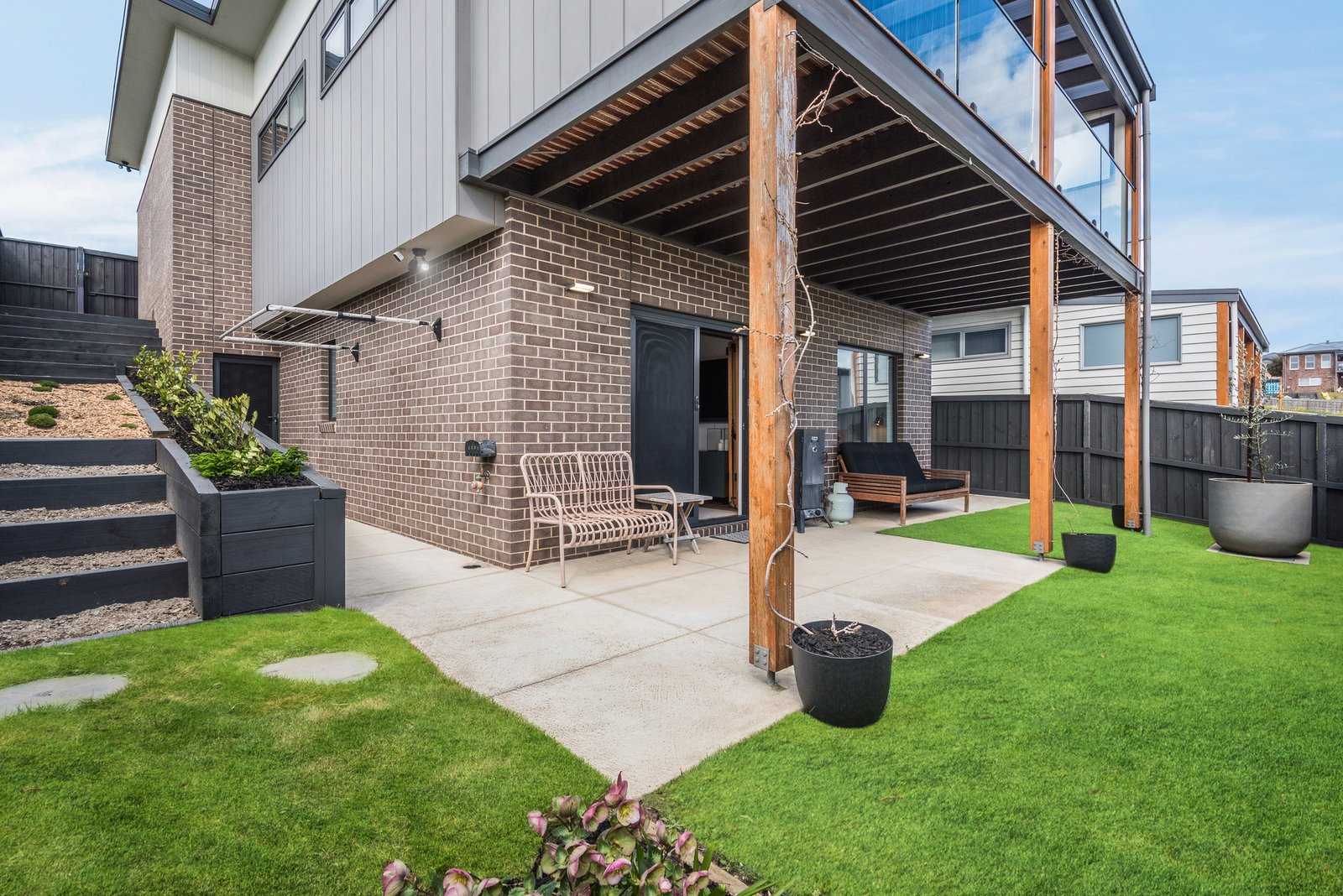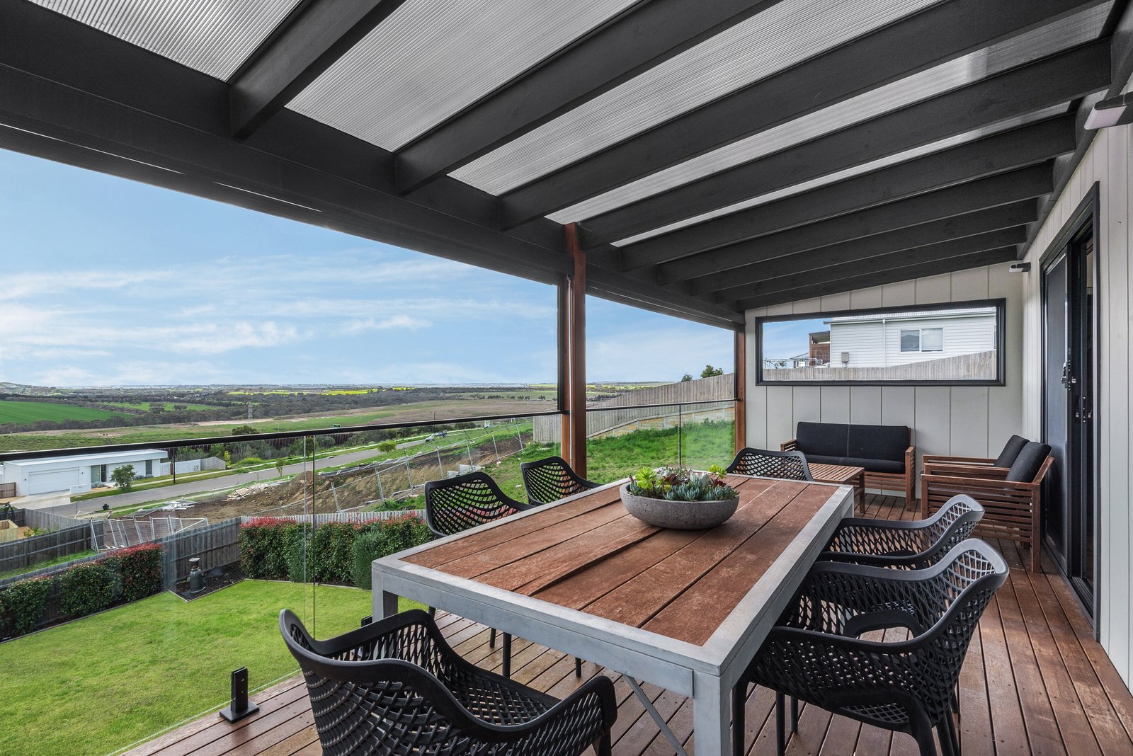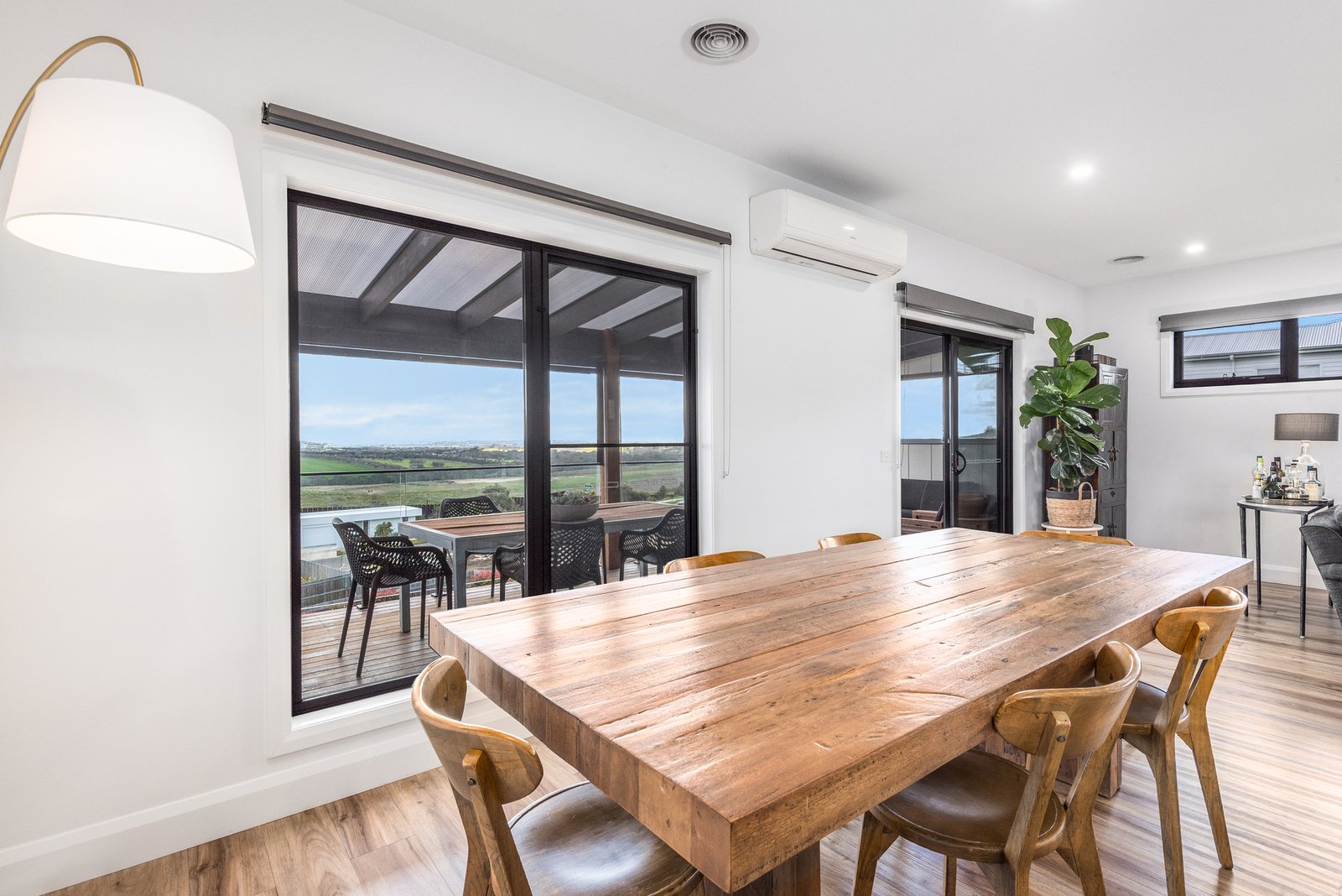 Neatly presented gardens and a sleek contemporary façade offer instant appeal on arrival. Inside, a central hallway takes your eye through the length of the home, showcasing modern flooring, light interiors, and square set ceilings. The rear of the home reveals a spacious open plan kitchen, dining and living area with a cosy gas log fireplace, connecting with a large entertaining balcony with magnificent views of the Barrabool Hills. The elegant kitchen features stone benchtops, Smeg appliances including 900mm oven and cooktop, dishwasher, marble inspired tile splashback, and endless storage with a large walk-in pantry. Thoughtfully positioned to capture the views over the dining area and balcony, this space makes every day cooking a joy, and entertaining a pleasure. The undercover balcony allows ample space for dining and lounging zones, providing the perfect platform to relax and take in your scenic surrounds.