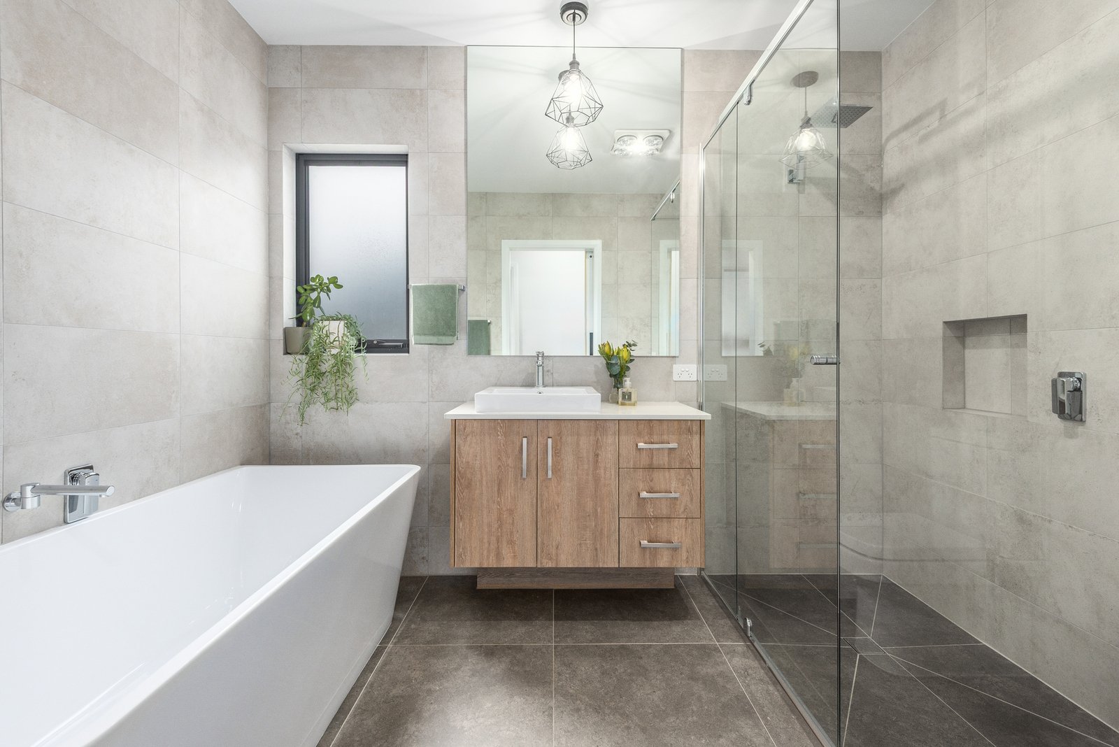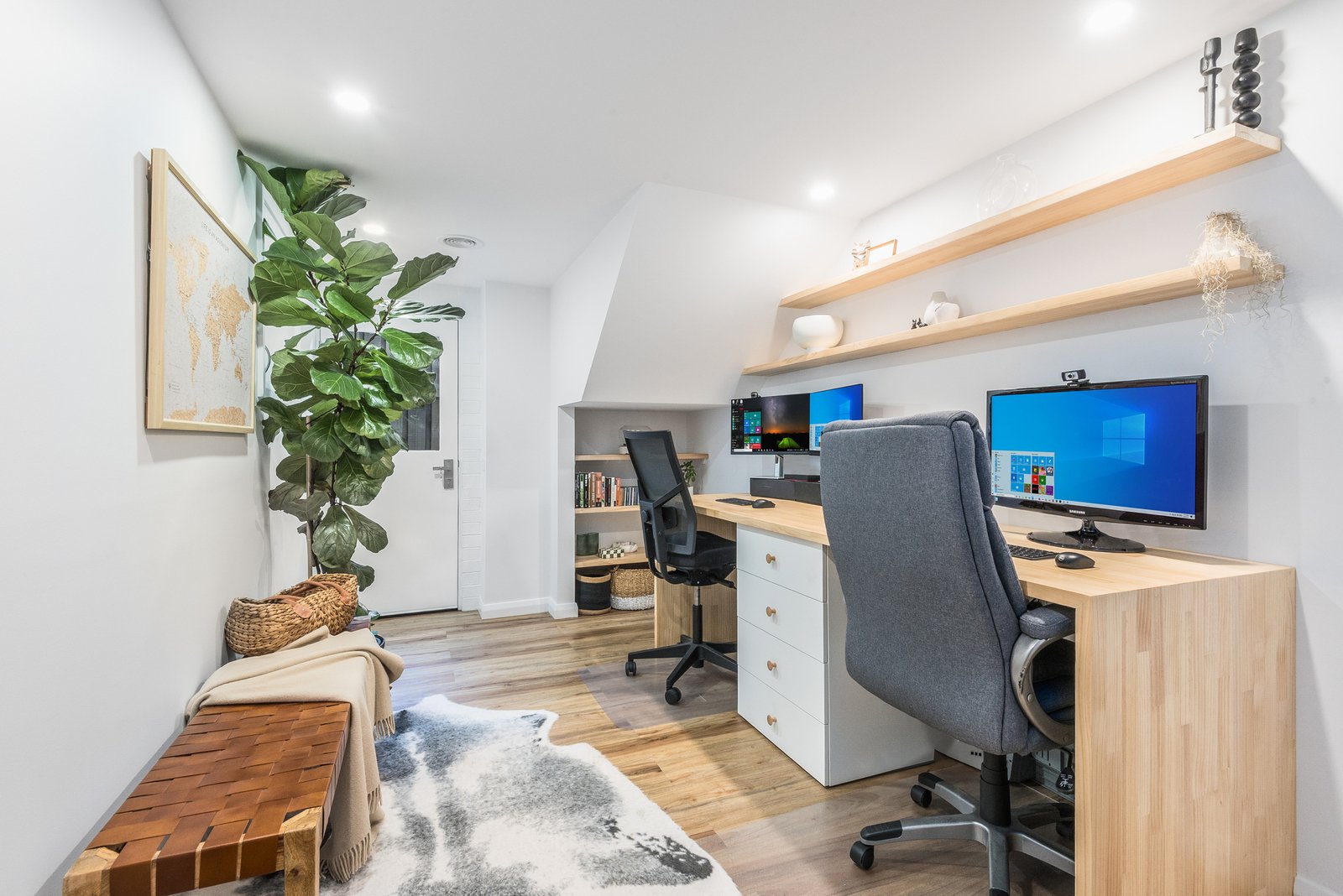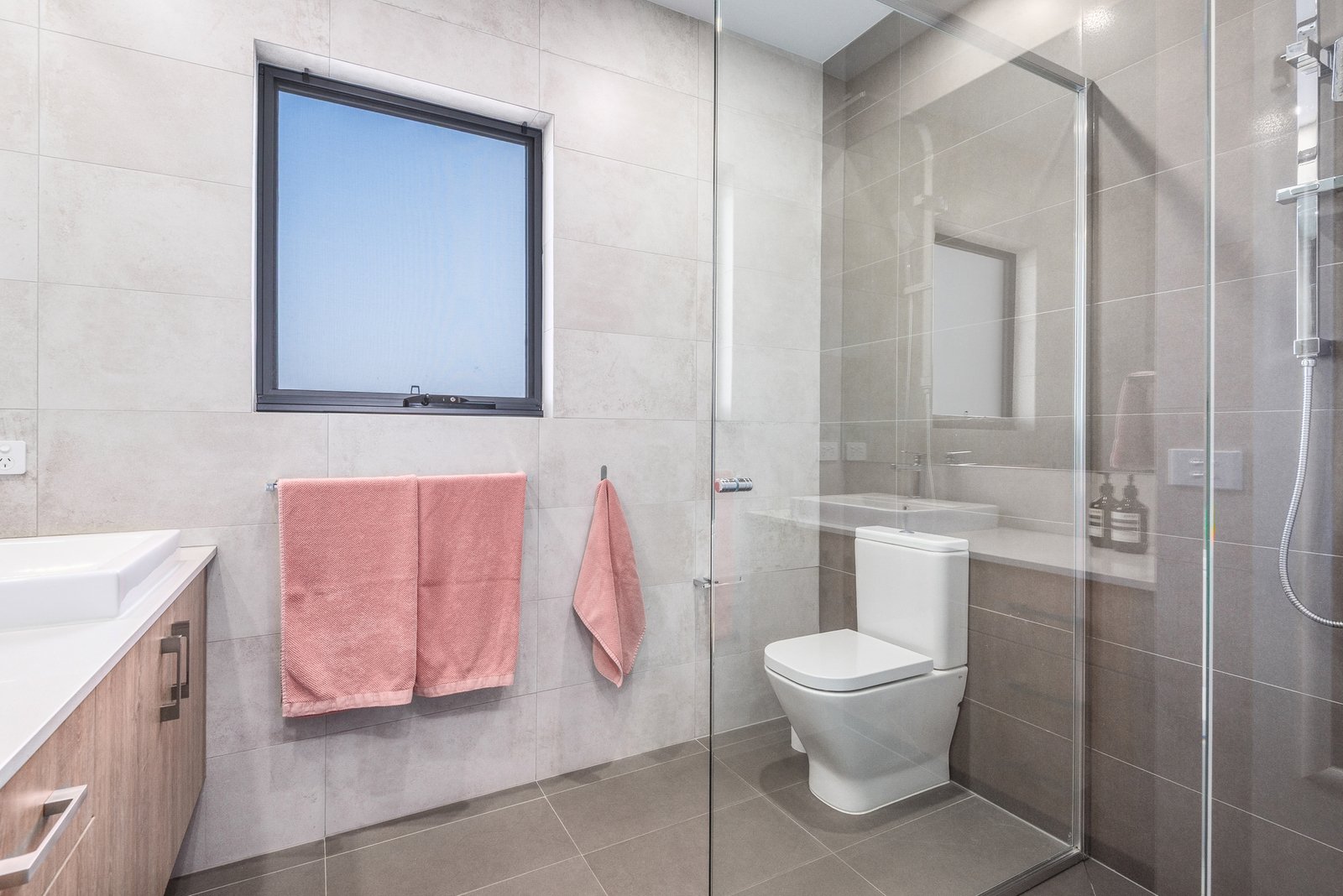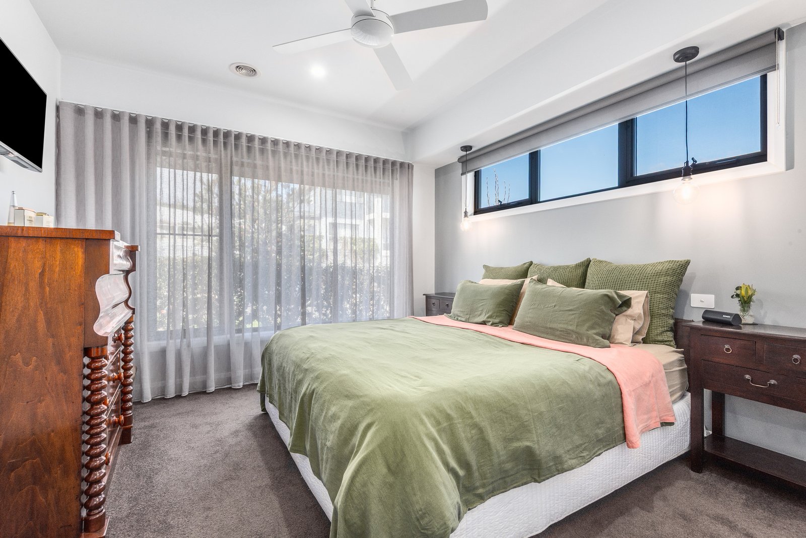 The main bedroom is privately zoned at the front of the home, offering a luxurious retreat with soft sheers, bedside pendants, split system heating and cooling, ceiling fan, walk-in robes, and a tastefully presented ensuite finished in floor to ceiling tiles. Two additional bedrooms are positioned on the lower level, both include built-in robes, serviced by a stylish main bathroom with back-to-wall freestanding bath. A second living area on this level provides a quiet space to escape, or send the kids to play, and a home office with built-in desk is the perfect spot to work or study at home.