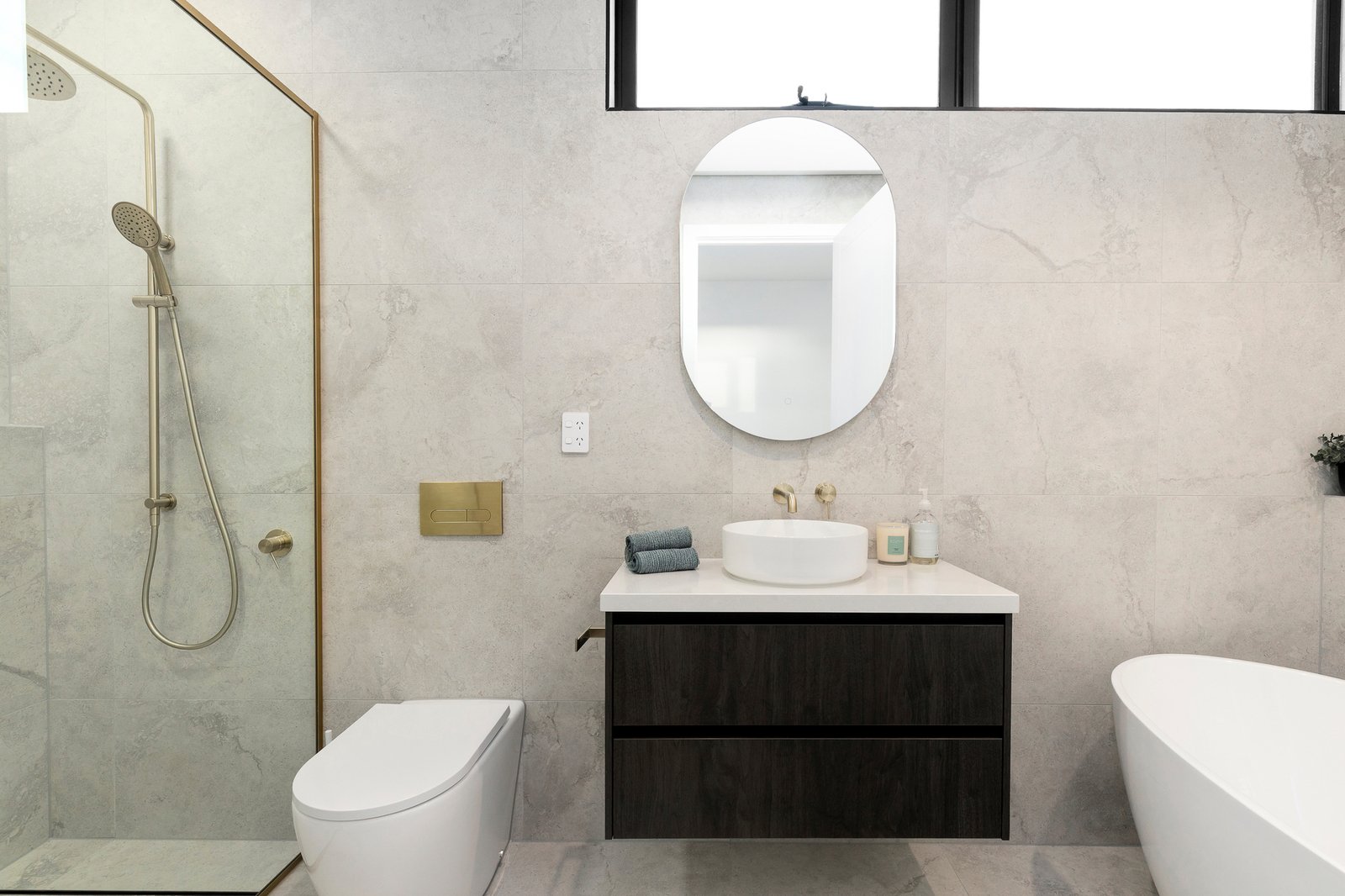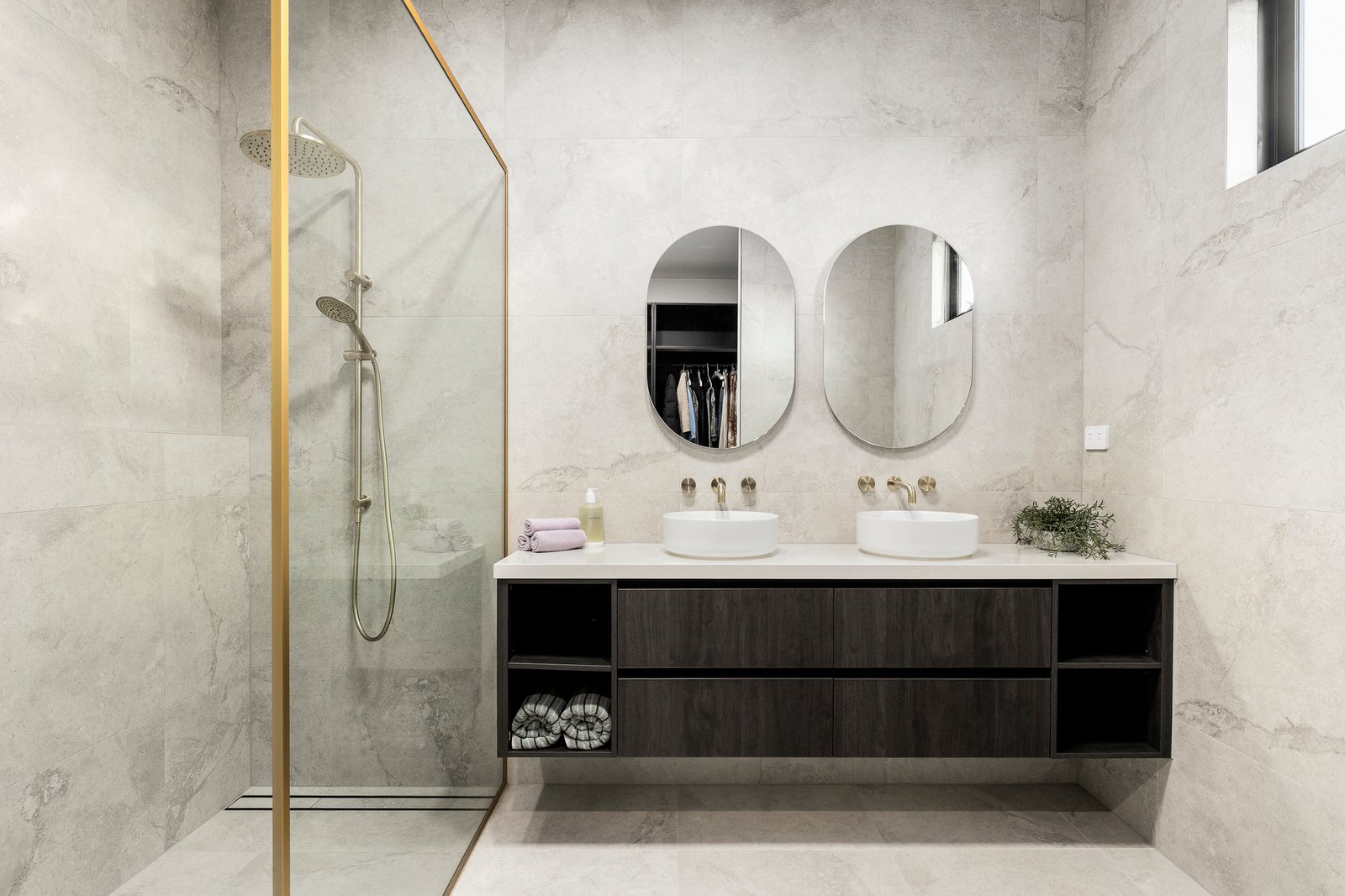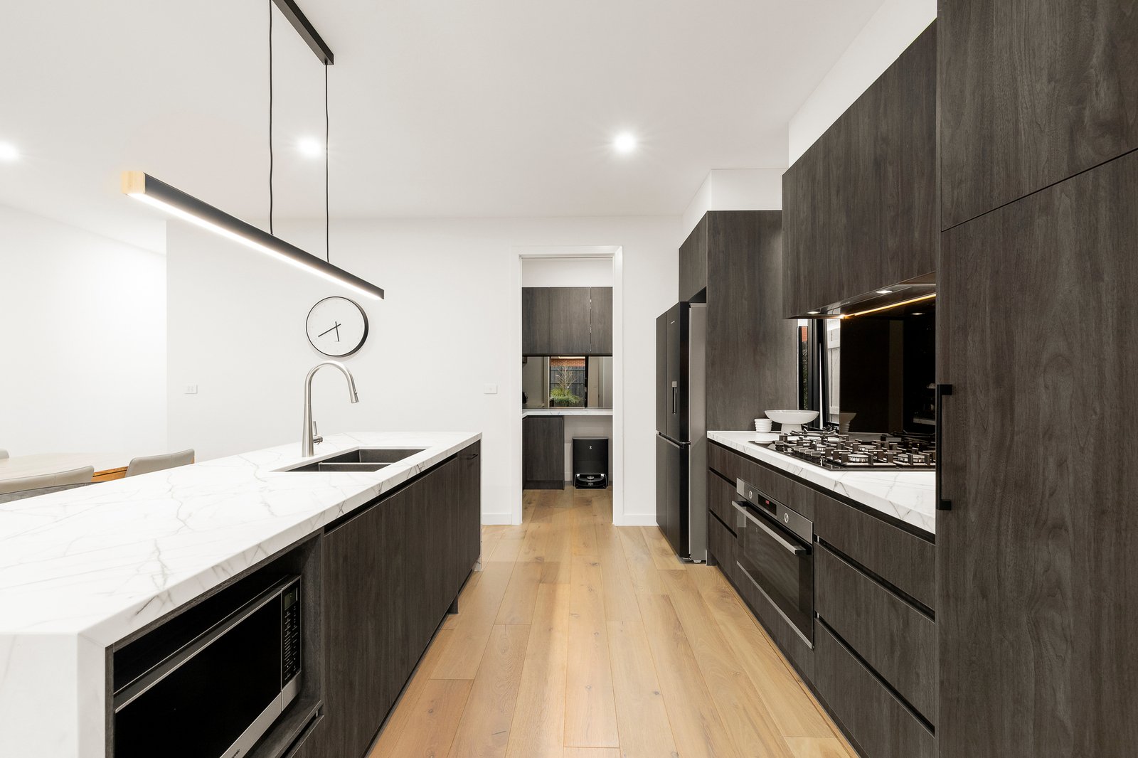Cleverly crafted with a true butler’s pantry for the sophisticated Bosch appliance kitchen, and a second walk-in robe and private ensuite for the ground-floor in-law or guest suite, this high-impact home is curated with an eye to dramatic design with New York-style stone benchtops, Scandi-style Oak floors, brushed-brass fittings (even for the concealed cistern WCs) and soft linen sheers on walls of double-glazing.