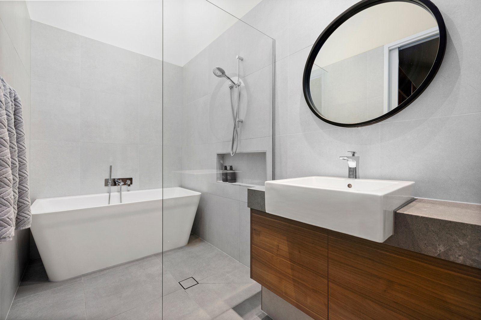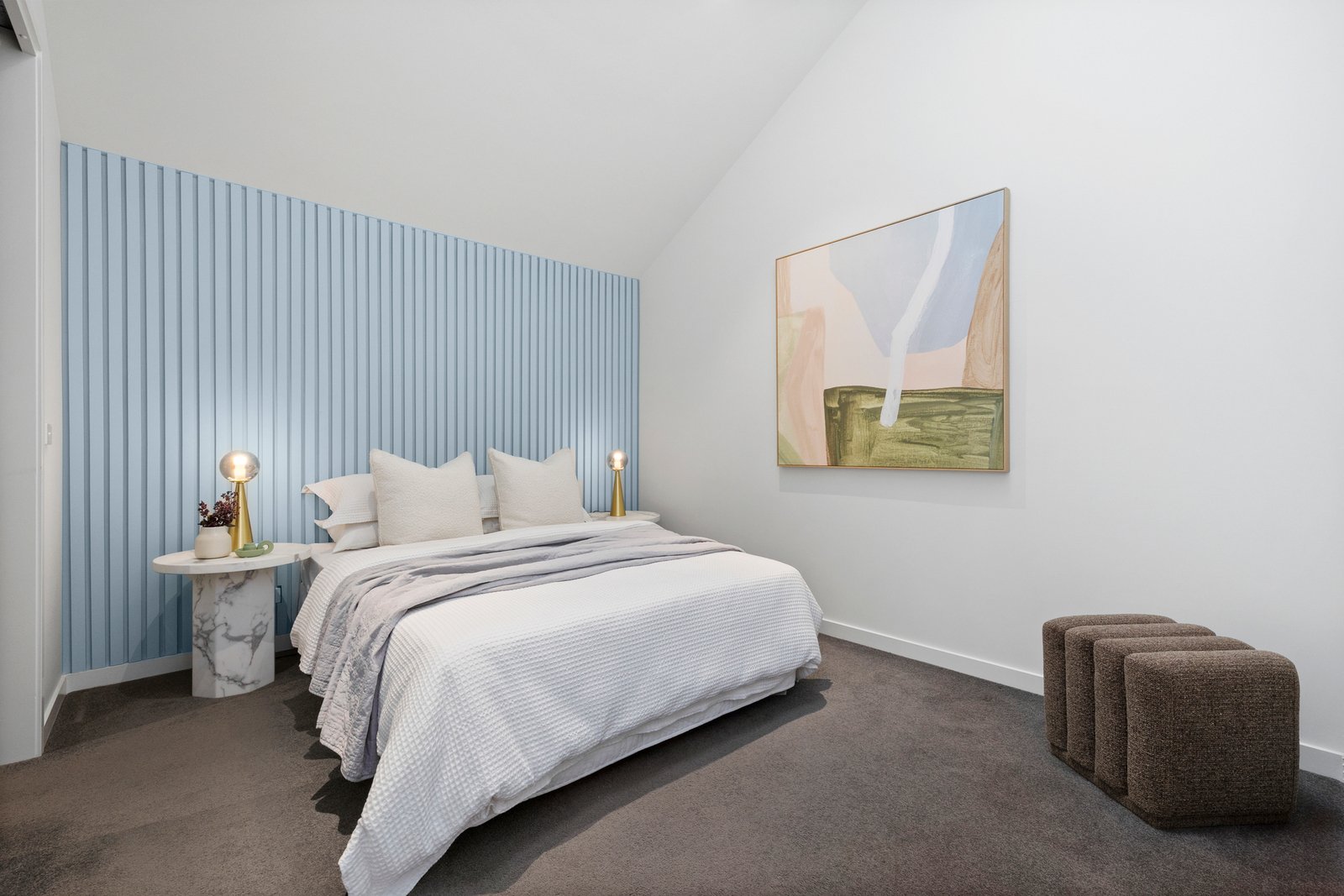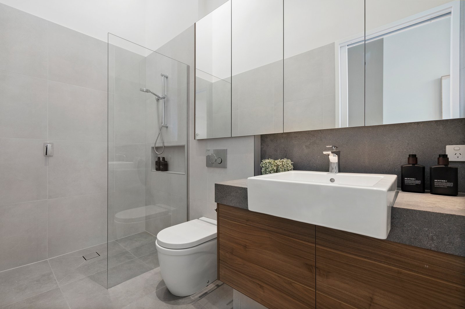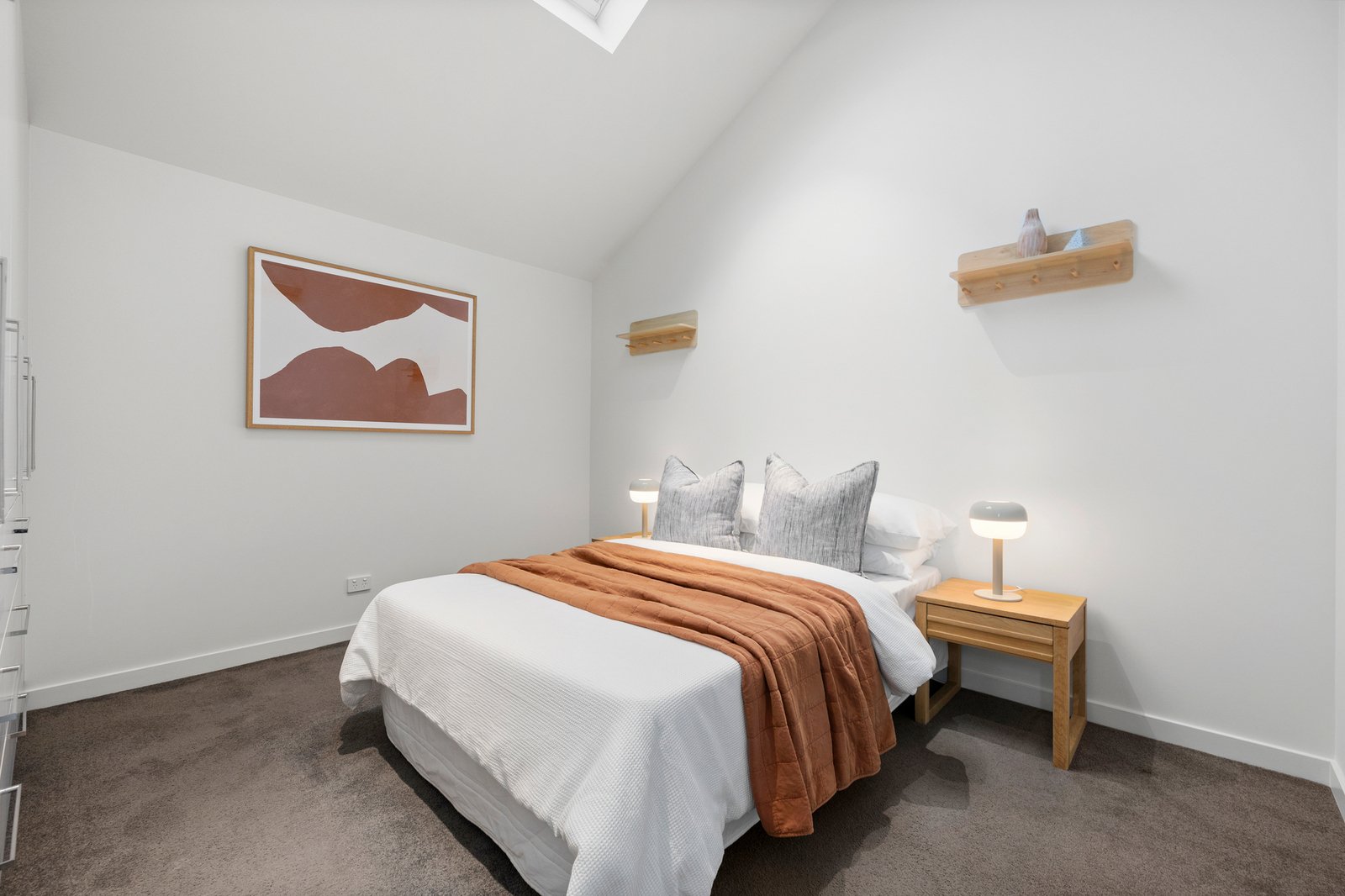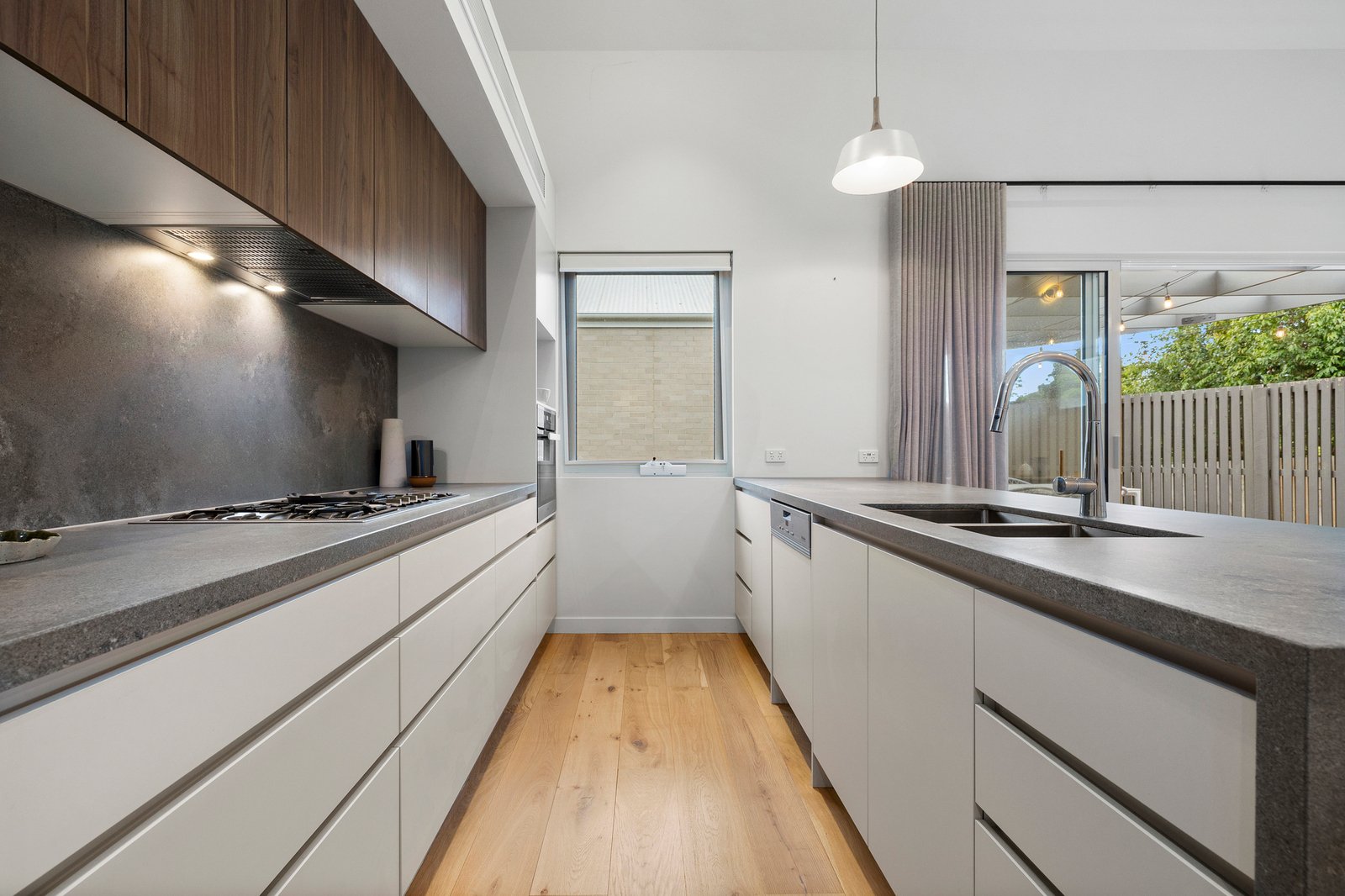 The luxurious master suite includes a beautifully paneled bedroom, a bespoke walk-in robe, and a sleek, designer ensuite. Premium finishes feature throughout—wideboard oak floors, concrete-style stone benchtops, full-height tiling (even in the powder room), and spectacular skylights that fill the home with natural light.