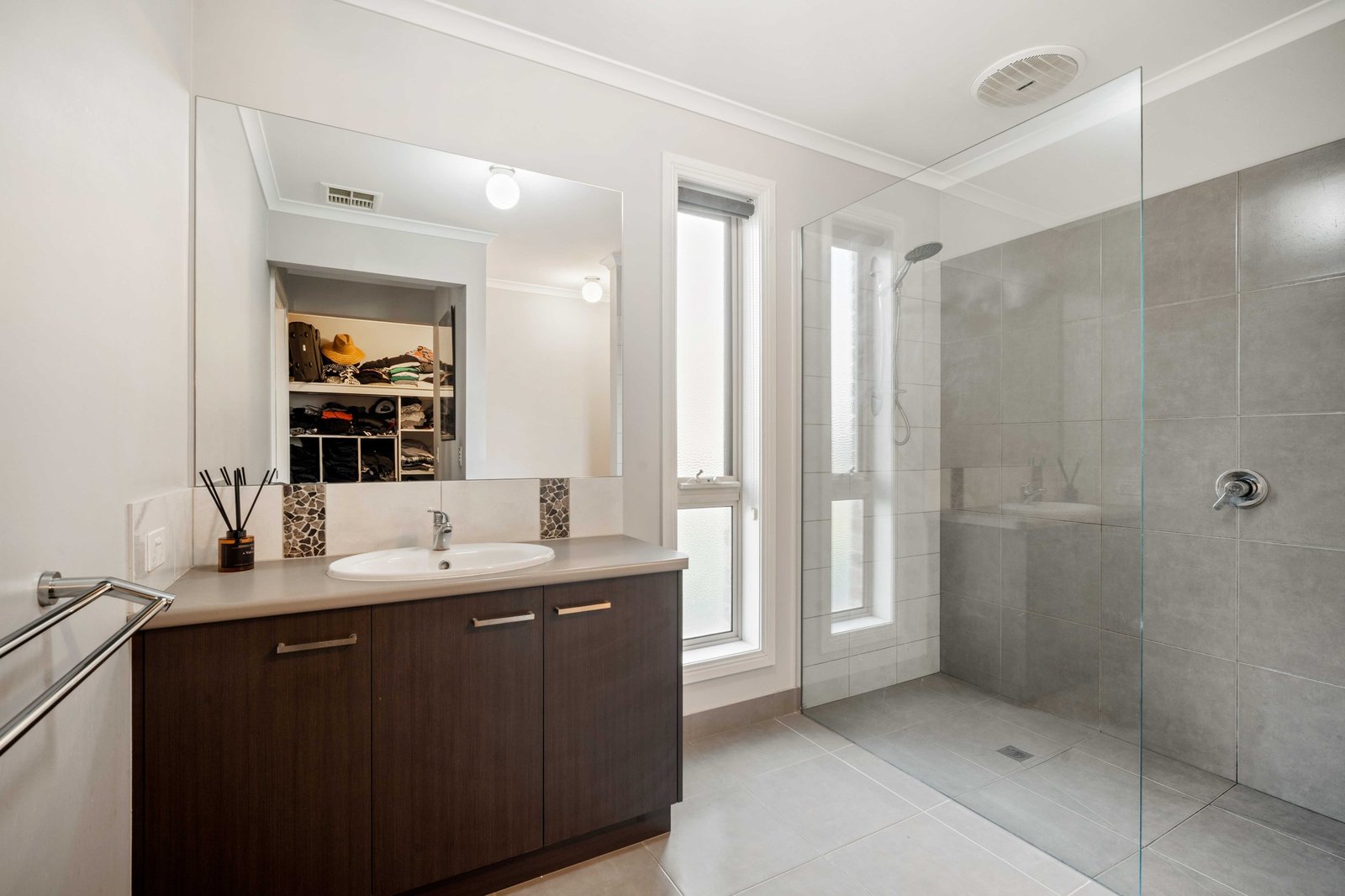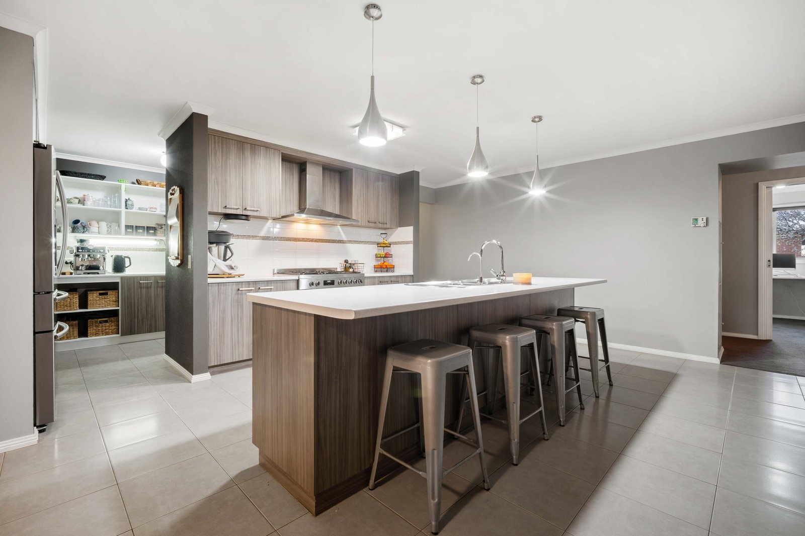 The heart of the home is the well-appointed kitchen featuring a 900mm oven and cooktop, dishwasher, and walk-in butler’s pantry with fridge space and extra storage. The central family bathroom includes a shower, bath, and vanity with a separate toilet, and the laundry is cleverly designed with two drying cupboards.