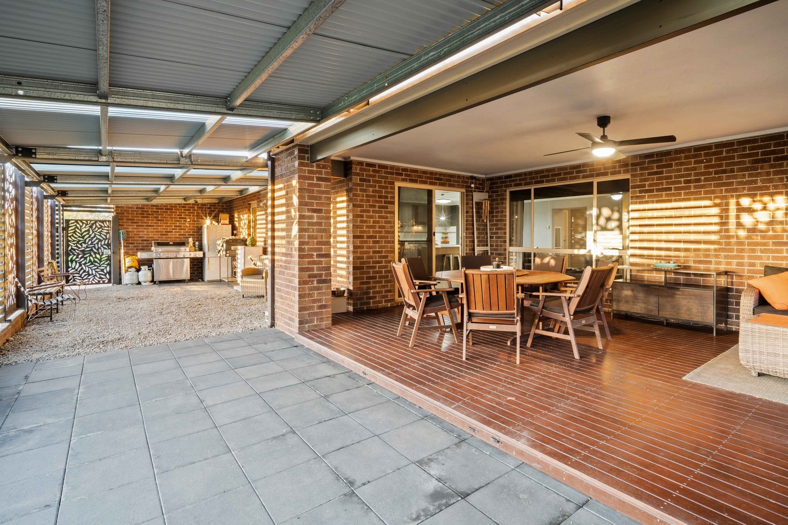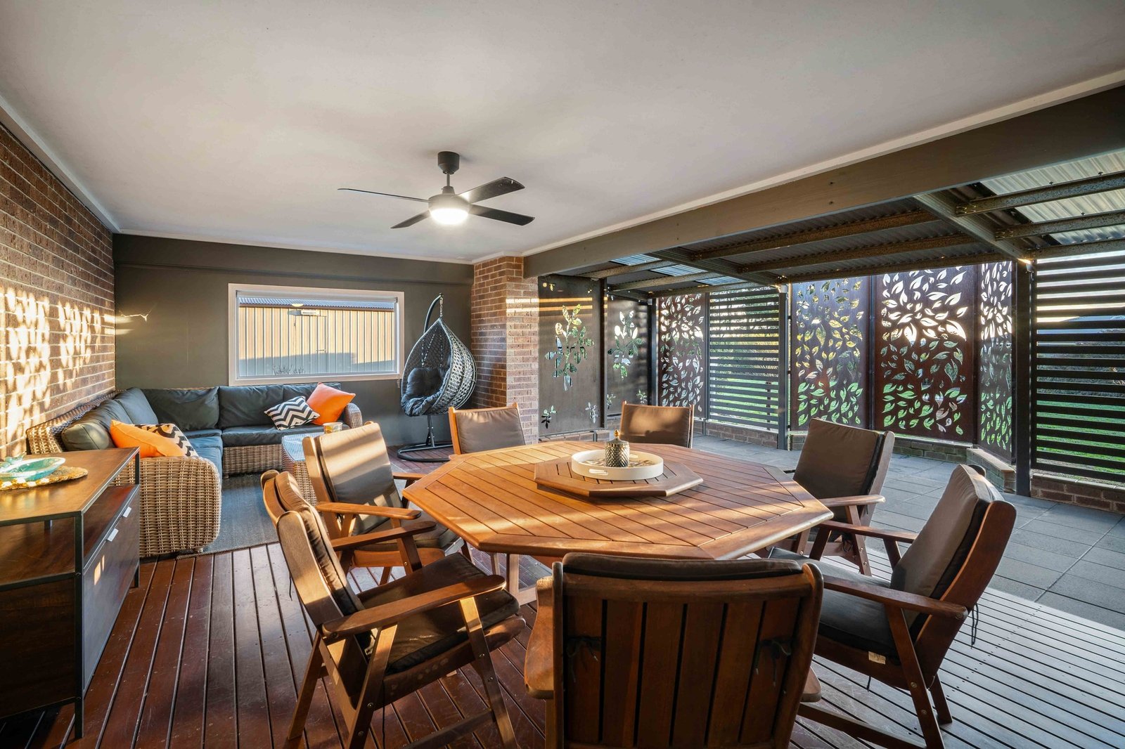 Outdoor living is a standout with a partially enclosed alfresco, an additional undercover area with decorative laser-cut steel partition walls, and a spacious backyard dotted with fruit trees including nectarine, fig, and quince, plus a water tank.