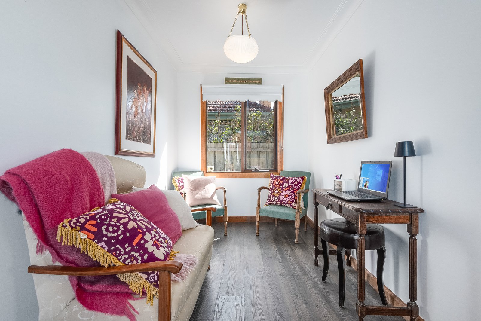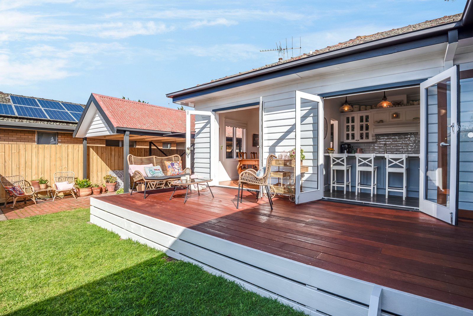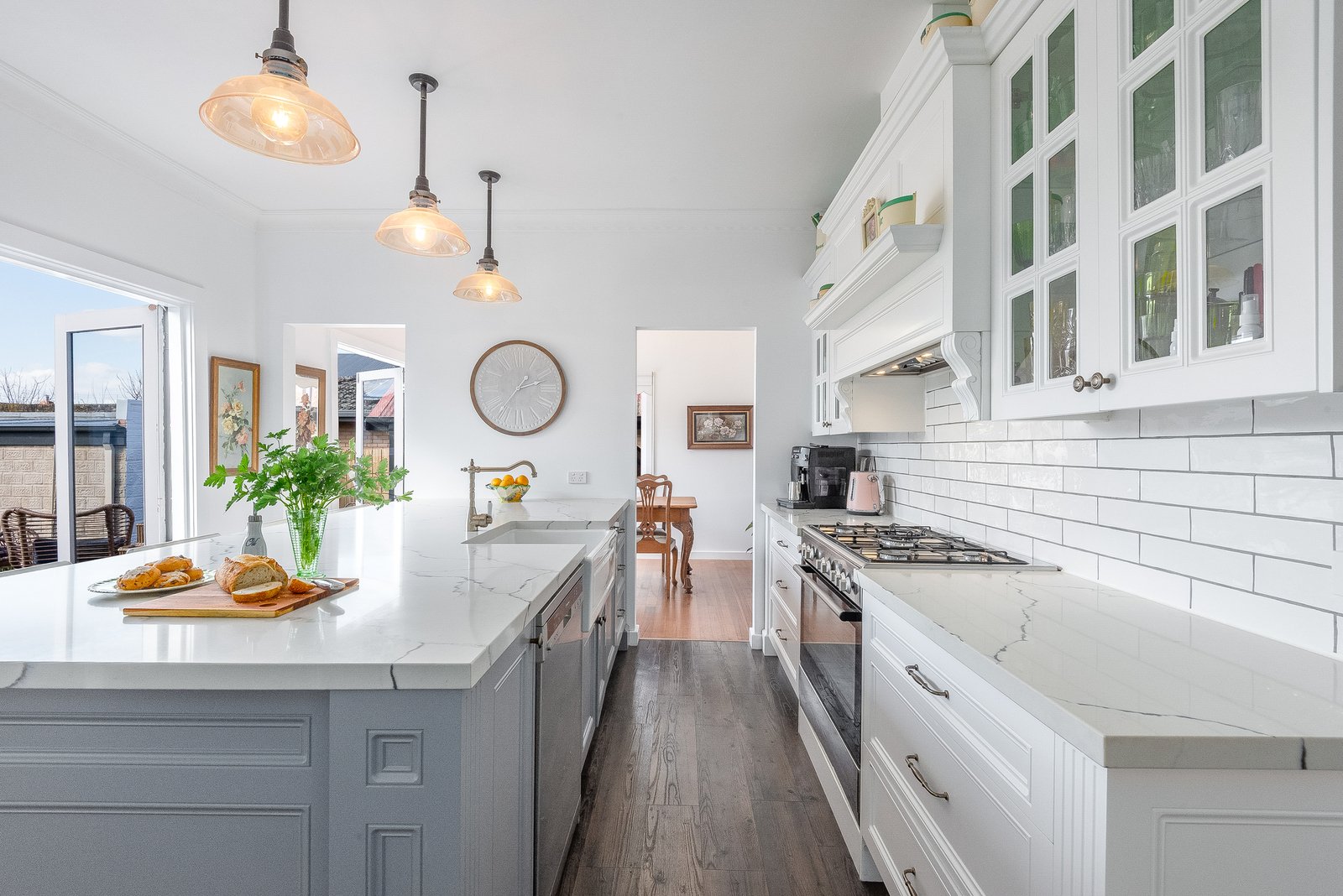 Nestled amongst stunning established gardens, the charming home enjoys a private and tranquil setting, the front veranda offering the perfect spot to take in your picturesque surrounds. A wide entry hall leads into the welcoming living area, showcasing original features including polished timber floors, ornate cornice, beautiful timber windows, brick mantel and bookshelves, along with split system heating and cooling for modern comfort. The adjoining dining room connects with an elegantly updated kitchen featuring stone benchtops, shaker style cabinetry, 900mm oven and cooktop, dishwasher, classic subway splashback, stunning inset butler’s sink, and sophisticated pendant lighting. A sitting nook off the kitchen provides a quiet space to retreat. A series of French doors in the dining area, kitchen, and sitting nook open out to the rear deck, creating an impressive indoor-outdoor entertaining zone.