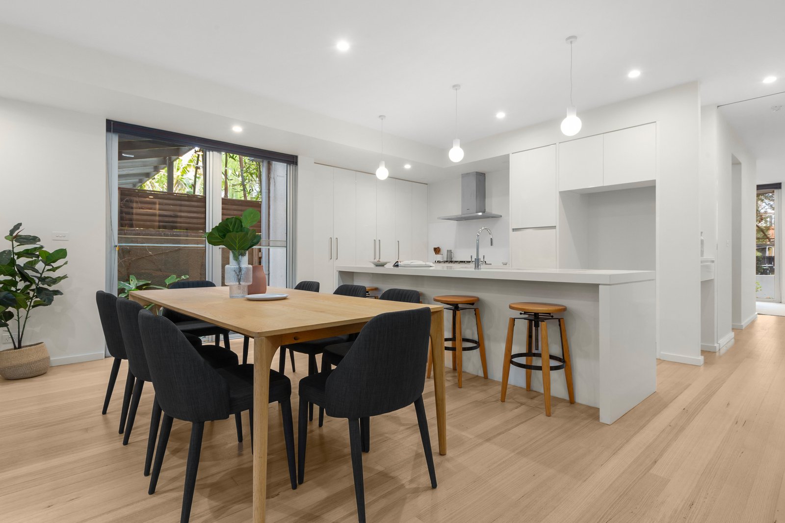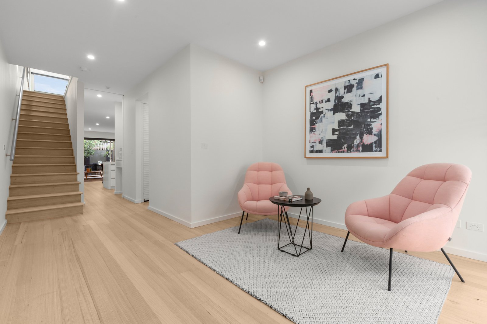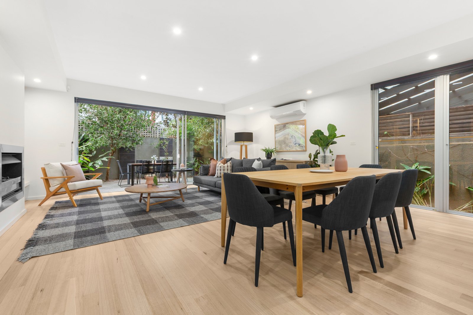 Step inside to a welcoming front sitting room and powder room before the home opens into an expansive light-filled living and dining domain, complete with a striking gas log fire and floor-to-ceiling windows that bring the outdoors in.
