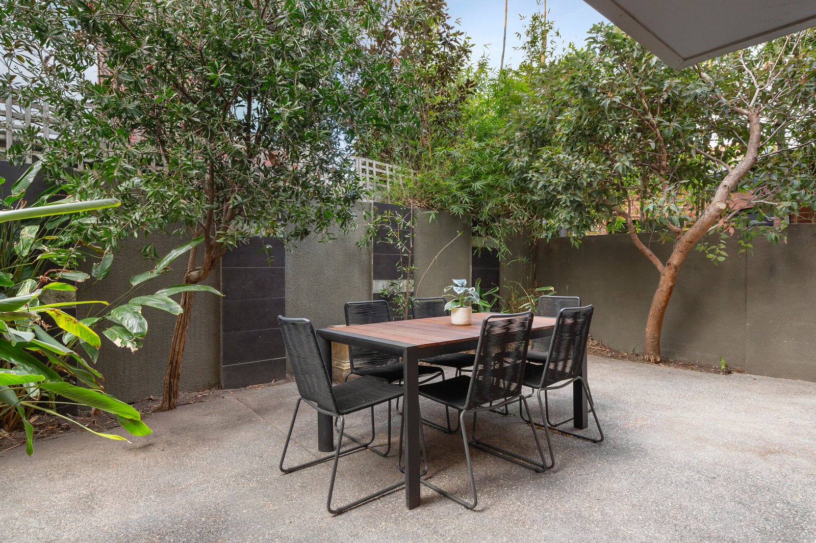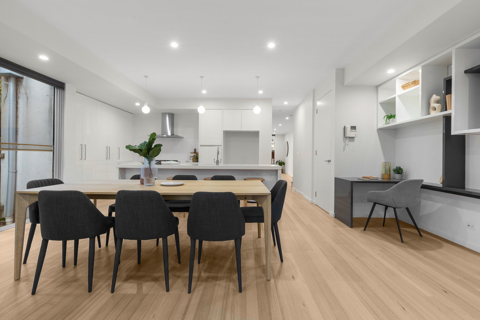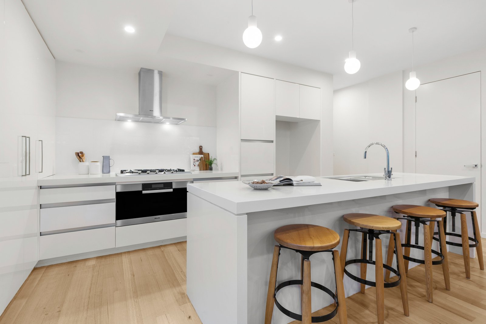 The chef’s kitchen is a showpiece in style and function, boasting Miele appliances including a 900mm oven, fridge plumbing, oversized island bench and abundant storage, while sliding doors reveal a private courtyard designed for effortless entertaining.