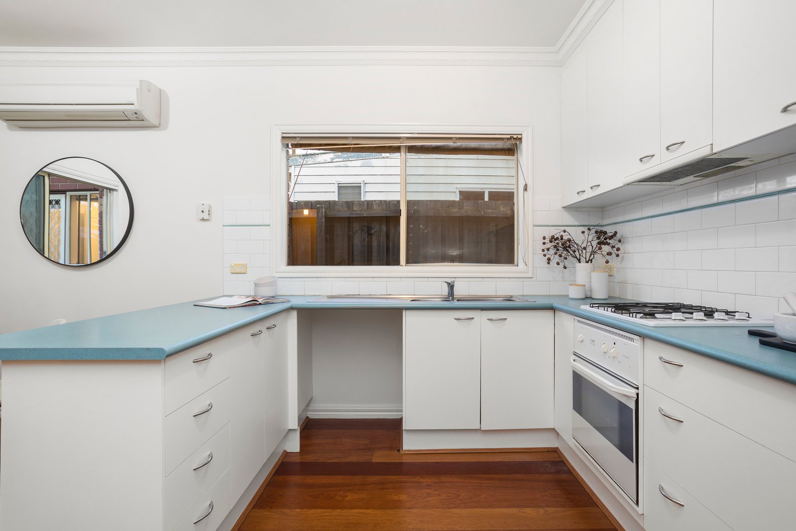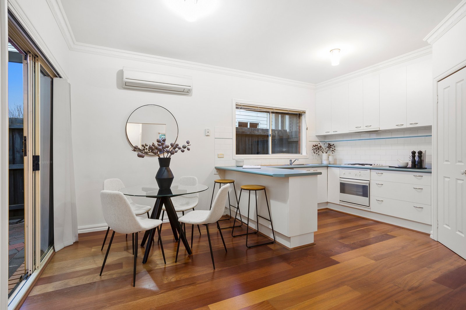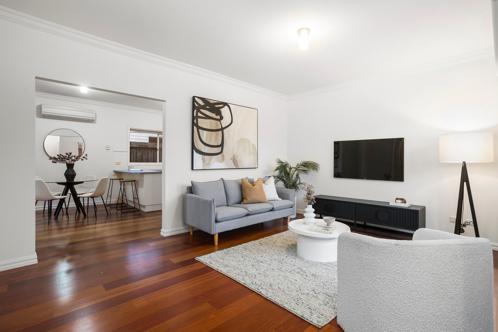 Step inside to find a spacious front lounge room with gas heating and split system, creating a welcoming retreat for year-round comfort. The home flows beautifully into a large open plan kitchen and dining area where polished floorboards add warmth and character throughout, creating an inviting space for both everyday living and entertaining. Two good-sized bedrooms feature built-in robes for excellent storage solutions, with the main bedroom enjoying split system comfort. A central bathroom offers both separate shower and bath, complemented by a separate laundry for excellent functionality.