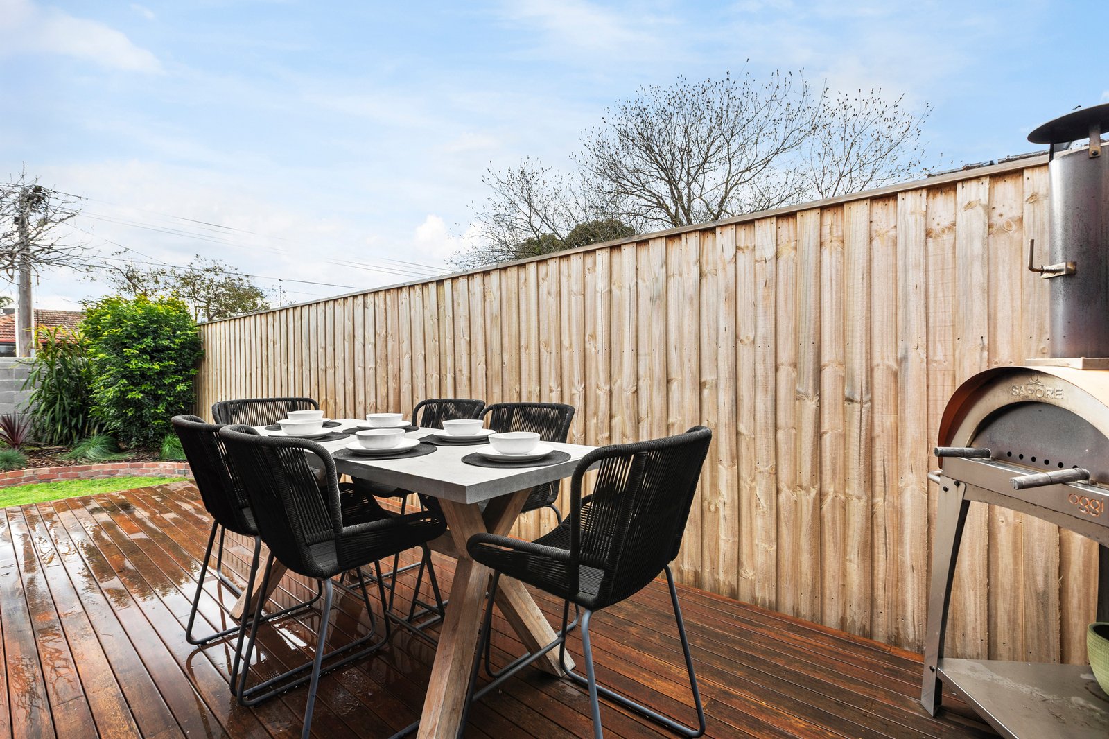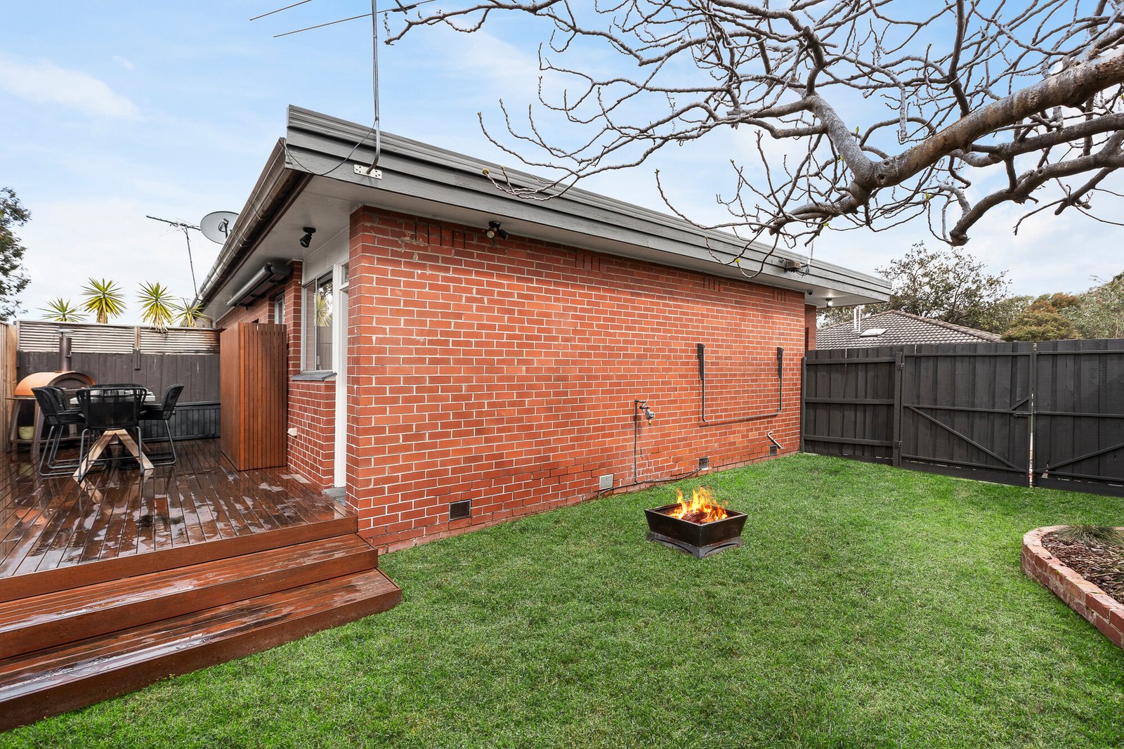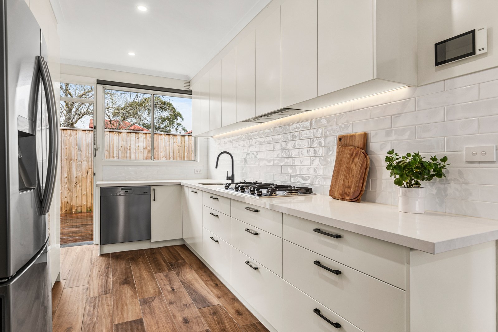 Two generous bedrooms with built-in robes are complemented by a luxurious, fully tiled bathroom, contemporary kitchen features stone benchtops, a gas stove, and ample storage, flowing seamlessly into a relaxed meals area. Outdoors you have a sunny garden oasis with decking, creating the perfect space for entertaining or enjoying quiet outdoor moments.