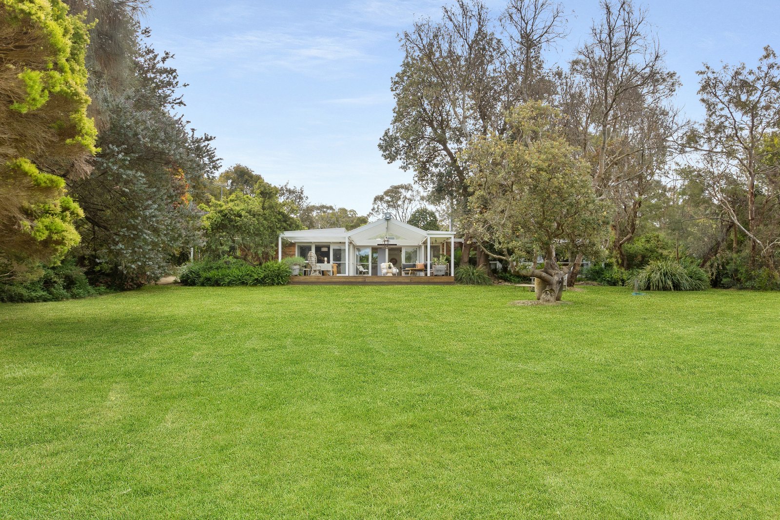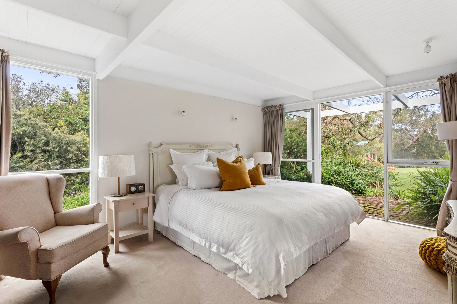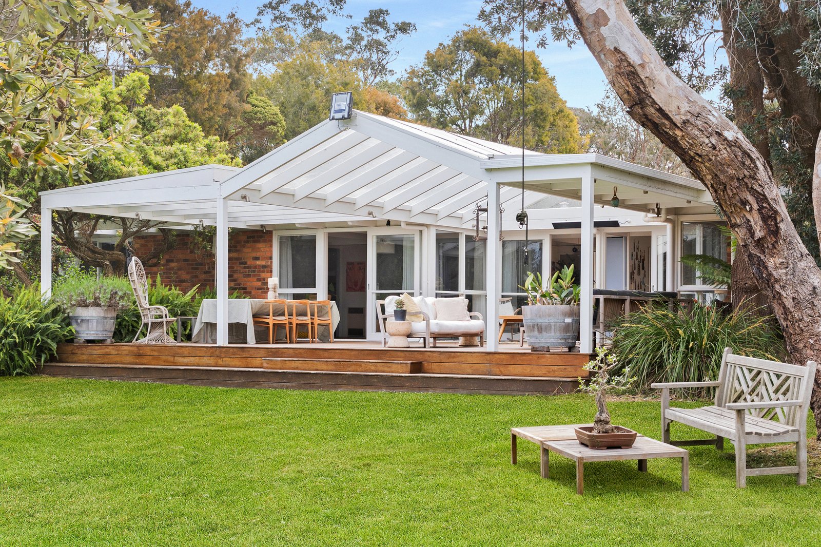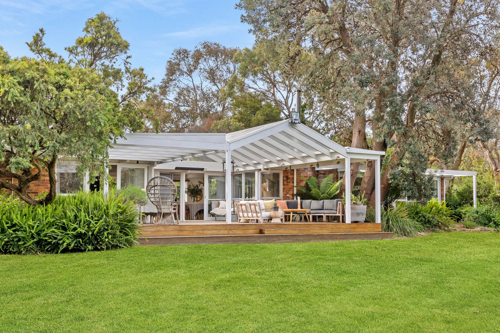 A brick facade accentuates character-rich interiors bathed in natural light, unfolding subtle reflections of mid-century origins through bright white finishes, panelled rooflines, and exposed beams over a graceful single level floorplan. An expansive pitched-roof deck extends from the main residence, crafting an all-season entertaining domain. Elevated views span across lush lawns and gardens, where a sea breeze weaves an invitingly airy ambiance.