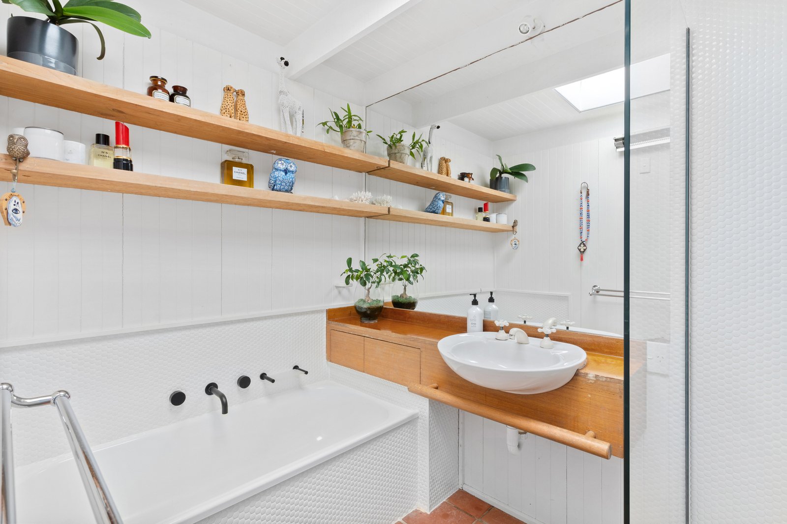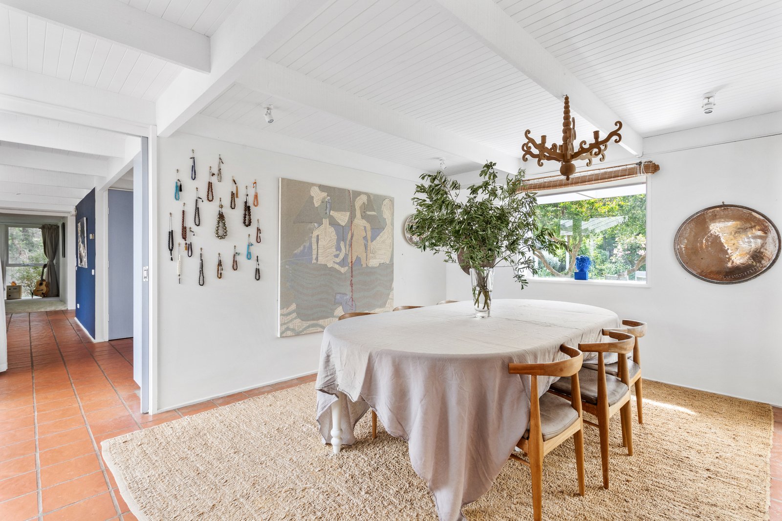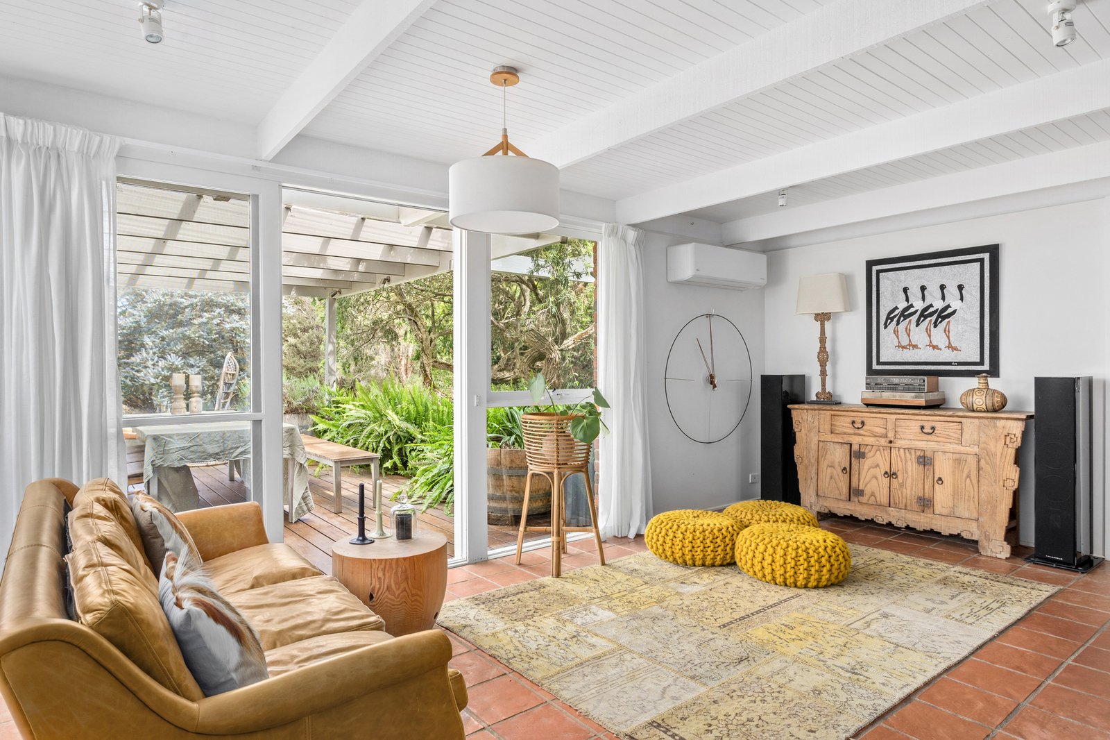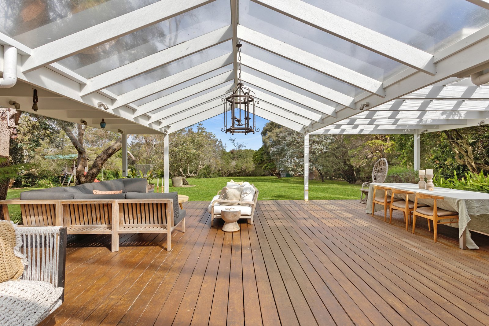 A brick facade accentuates character-rich interiors bathed in natural light, unfolding subtle reflections of mid-century origins through bright white finishes, panelled rooflines, and exposed beams over a graceful single level floorplan. An expansive pitched-roof deck extends from the main residence, crafting an all-season entertaining domain. Elevated views span across lush lawns and gardens, where a sea breeze weaves an invitingly airy ambiance.