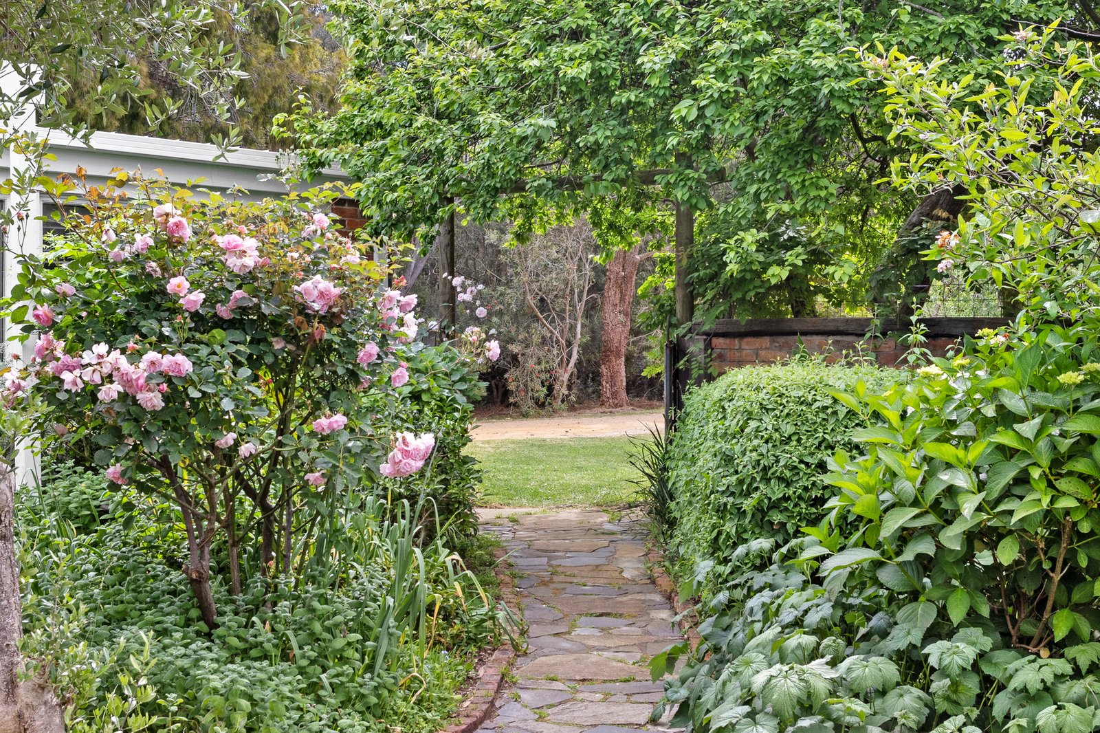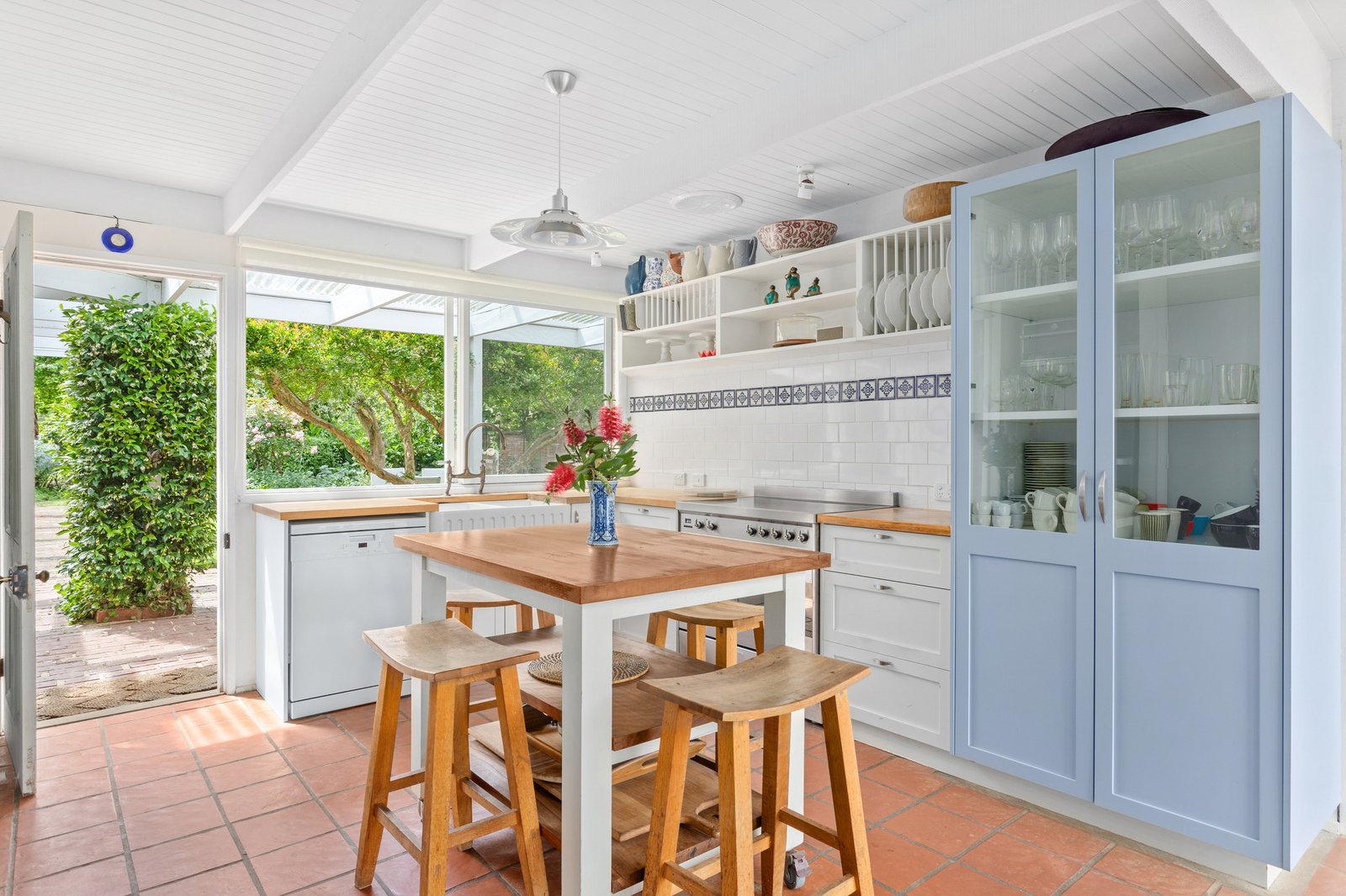 The formal living area is warmed by an open fire complemented by split system heating and cooling for added comfort. Nearby, the country-inspired kitchen showcases a 900mm freestanding stove, timber benchtops, a subway-tiled splashback and farmhouse sink with vegetable garden access.