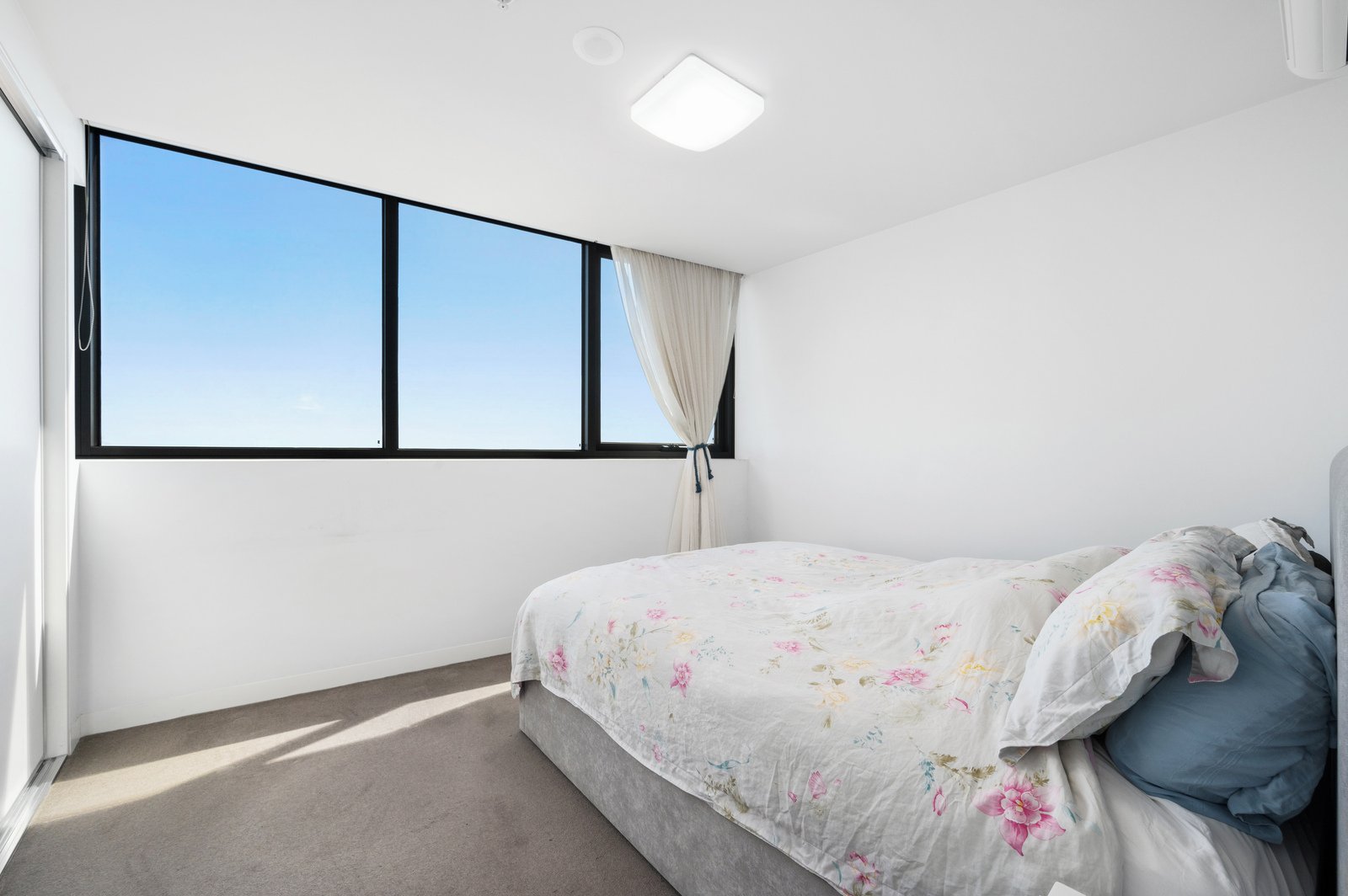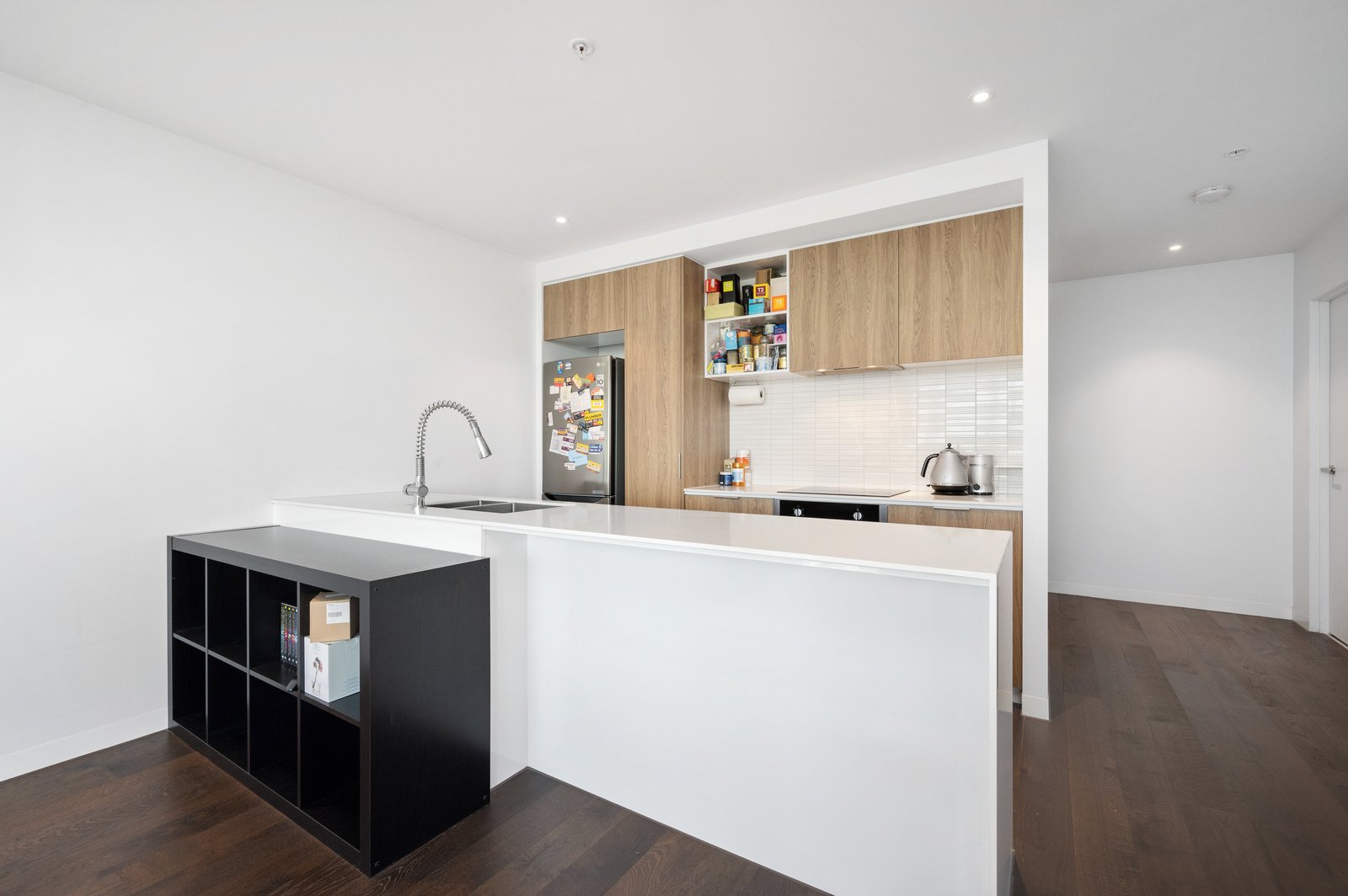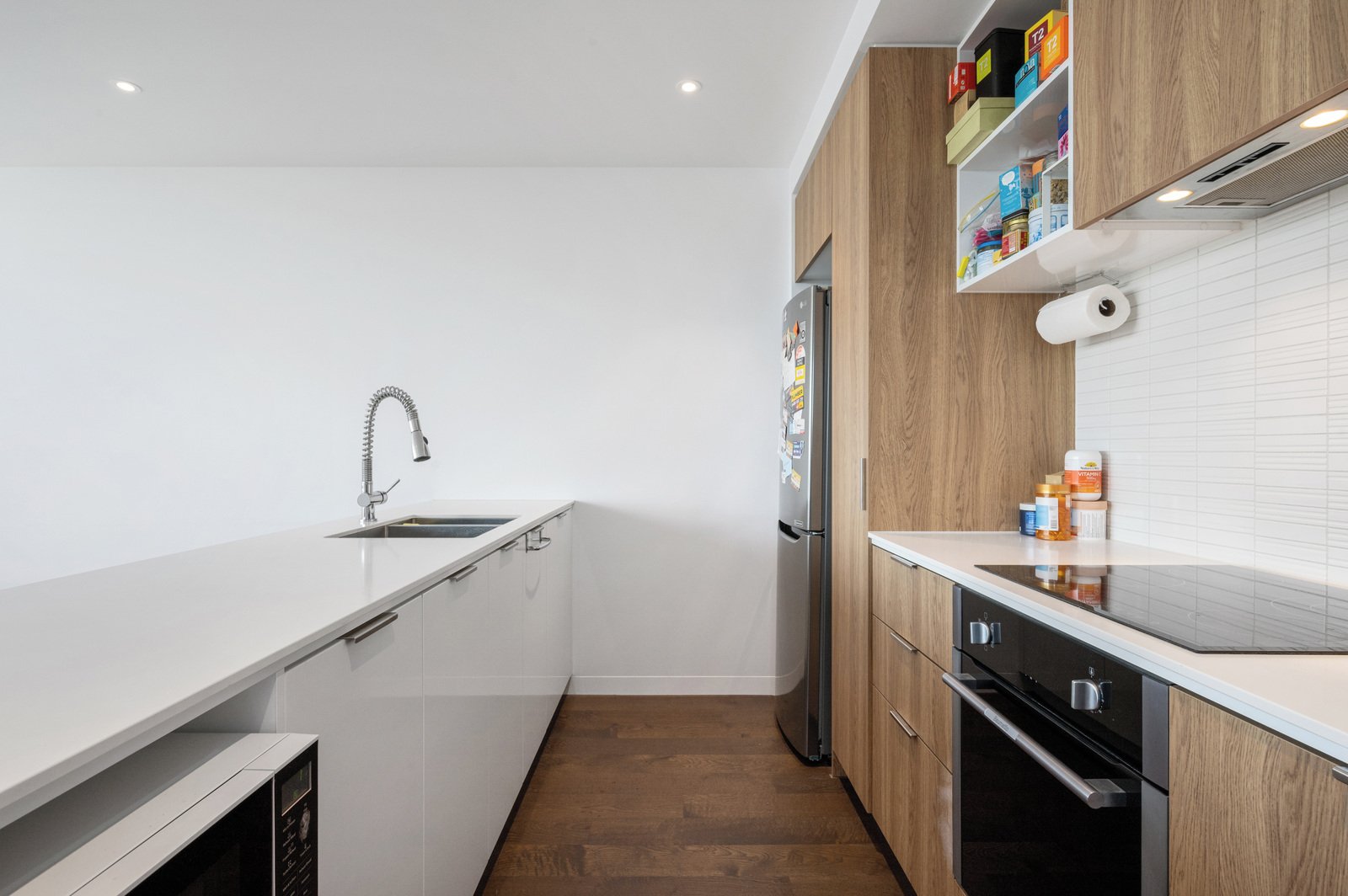 Light-filled and beautifully finished, the open-plan living and dining zone features oak timber flooring and a sleek kitchen appointed with quality stainless steel appliances, electric cooktop, and dish-drawer dishwasher. Floor-to-ceiling glass opens onto a private undercover balcony, framing sweeping views across the lake to the glittering city skyline.