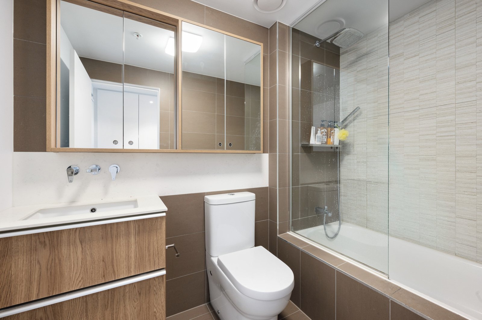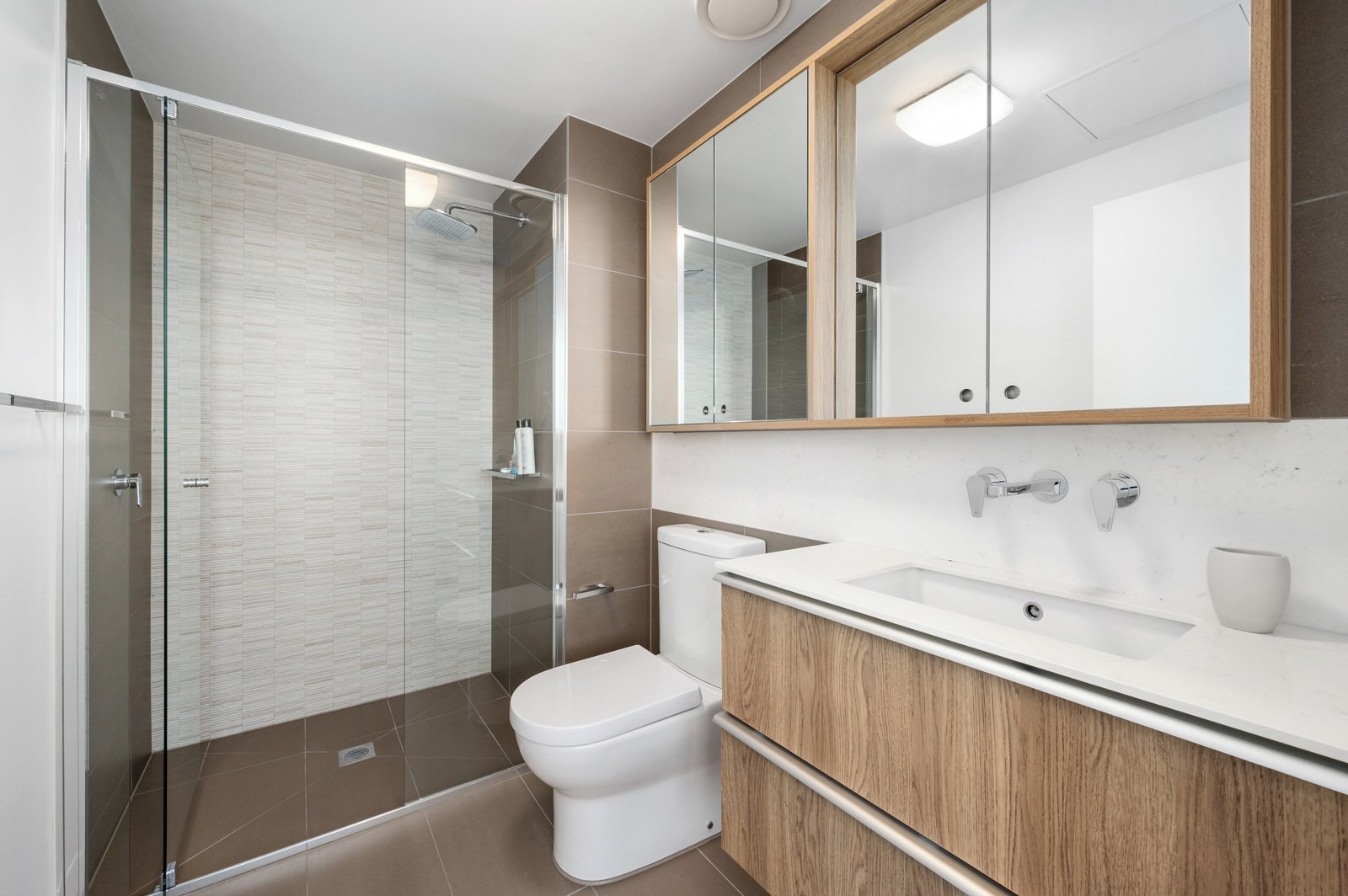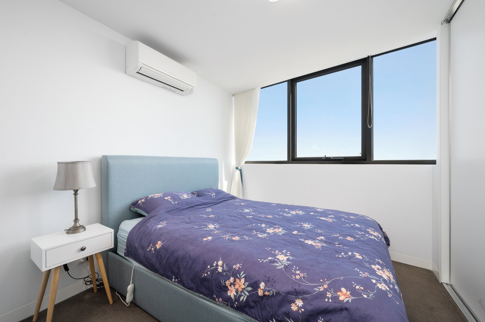 Light-filled and beautifully finished, the open-plan living and dining zone features oak timber flooring and a sleek kitchen appointed with quality stainless steel appliances, electric cooktop, and dish-drawer dishwasher. Floor-to-ceiling glass opens onto a private undercover balcony, framing sweeping views across the lake to the glittering city skyline.