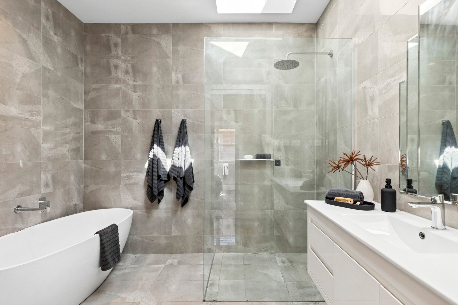 Comprising three bedrooms, the main is spacious and bright, all include built in robes, serviced by a stunning central bathroom, finished in floor-to-ceiling tiles, with freestanding bath, frameless glass walk-in shower, contemporary vanity, and skylight for bright natural light. A rear laundry and additional WC offer fantastic functionality.
