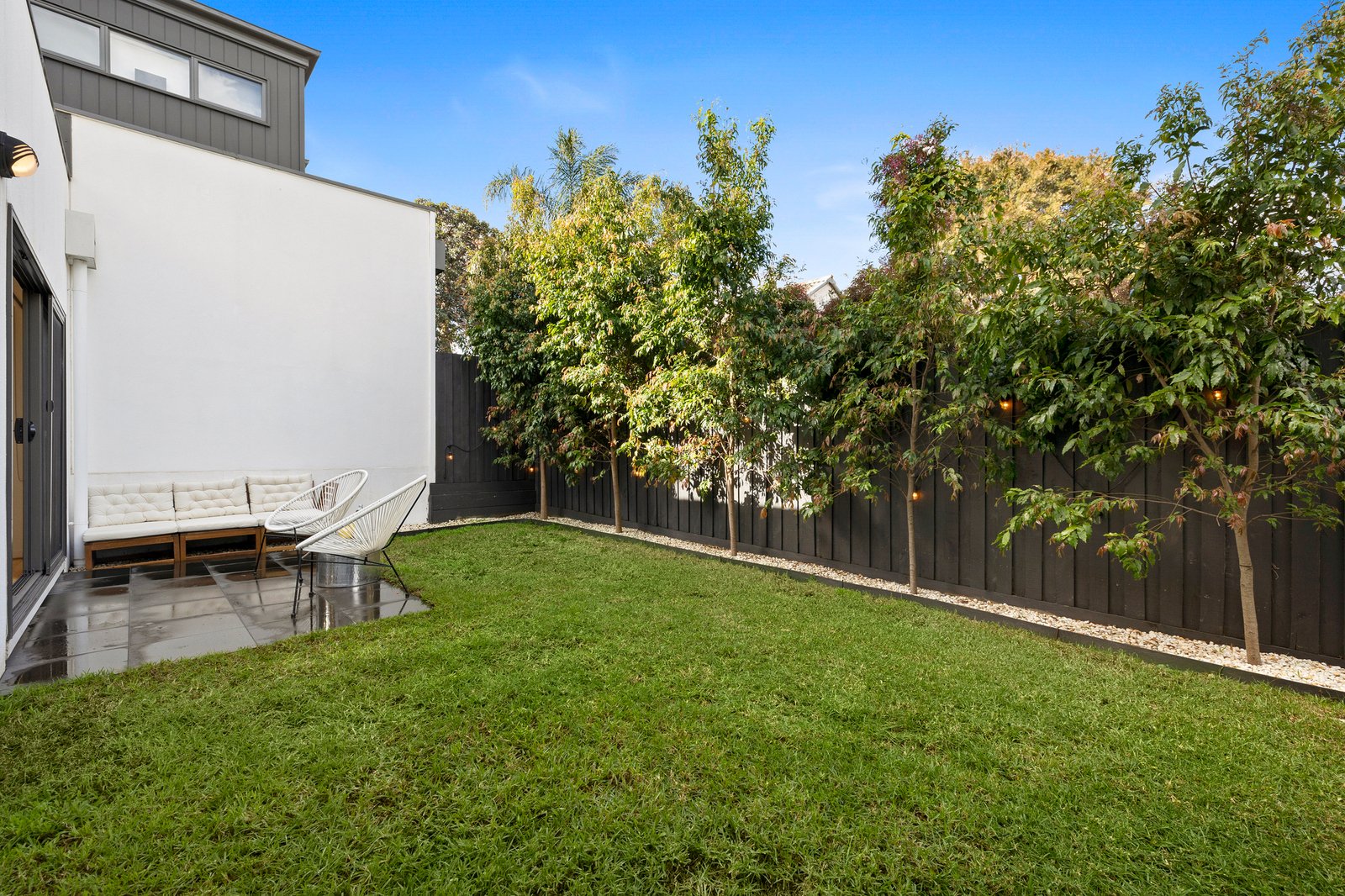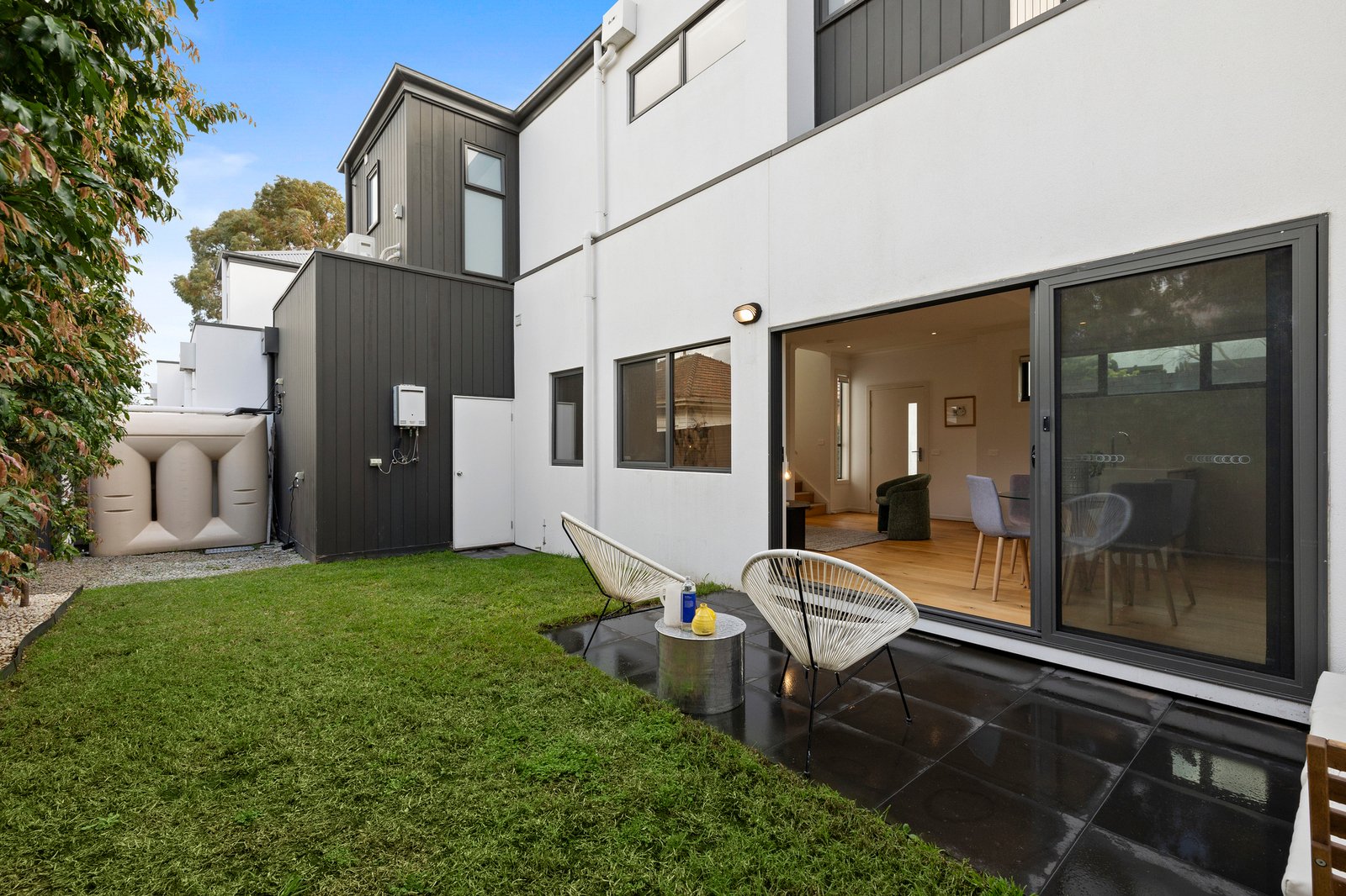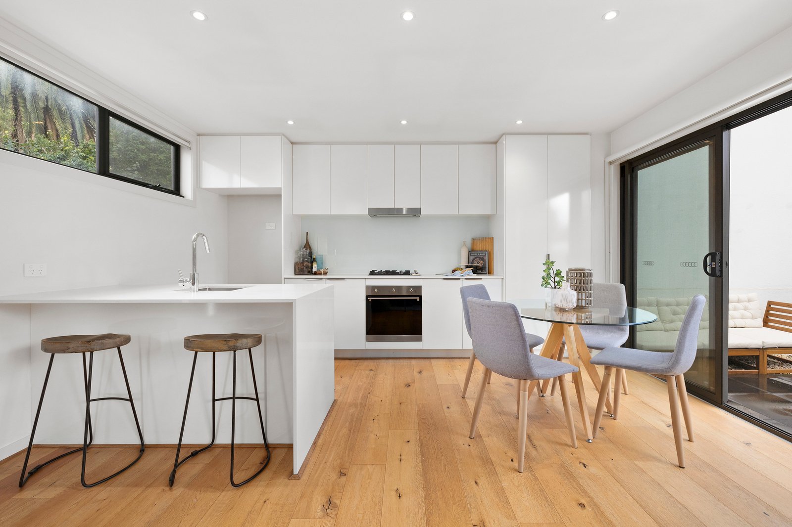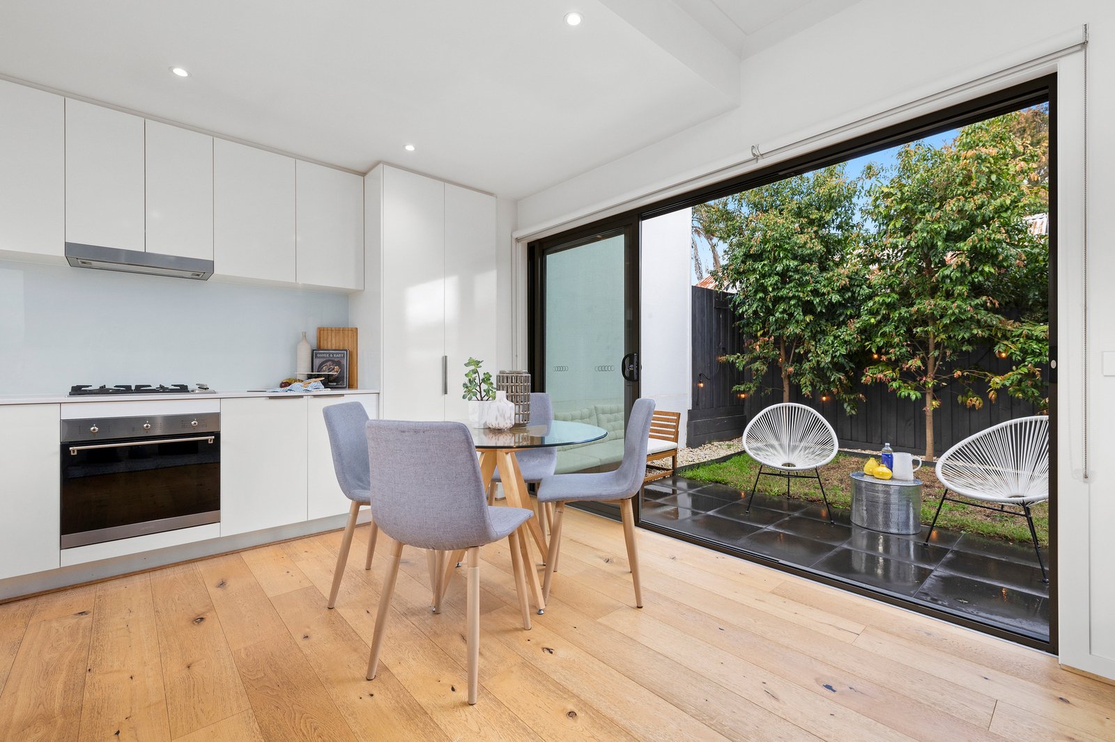 Downstairs, the heart of the home reveals a light-filled open-plan living and dining area, seamlessly connected to a modern kitchen equipped with stainless steel appliances, gas cooktop, dishwasher, and a central island bench with ample storage and space for casual seating. Expansive glass sliding doors invite natural light in and open out to a sun-drenched courtyard and low-maintenance backyard—perfect for alfresco dining, morning coffee, or quiet relaxation.