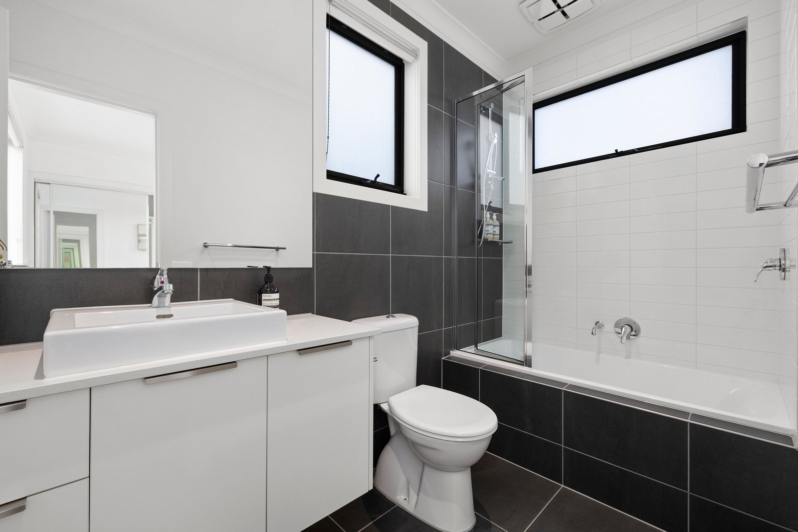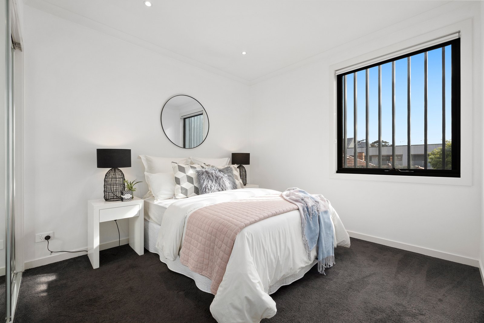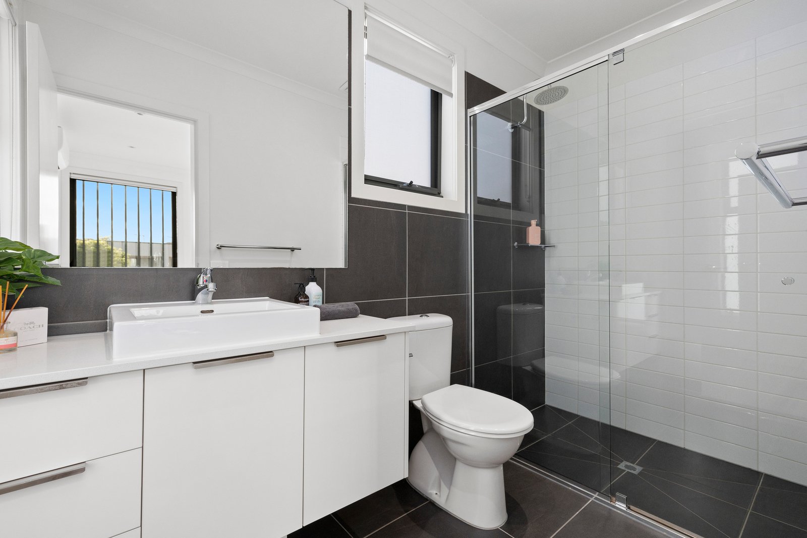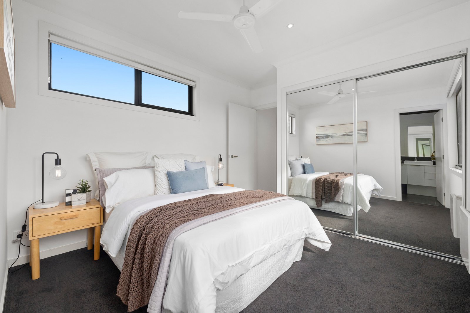 Upstairs, both bedrooms are generously proportioned and thoughtfully designed, featuring plush carpet underfoot, mirrored built-in robes, ceiling fans, and electric panel heaters for year-round comfort. Each bedroom is serviced by its own private ensuite—an ideal layout for couples, housemates, or visiting guests seeking space and privacy.