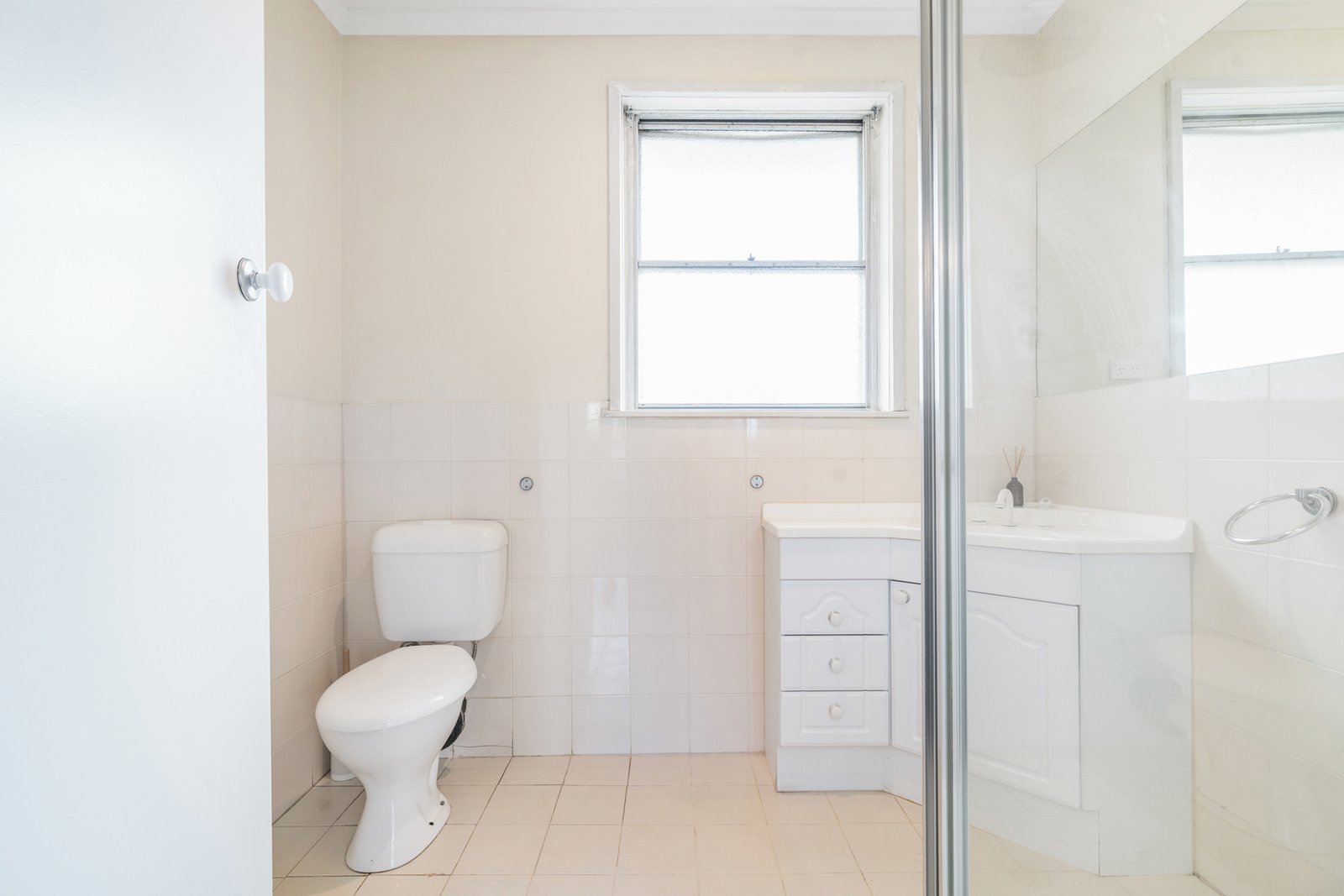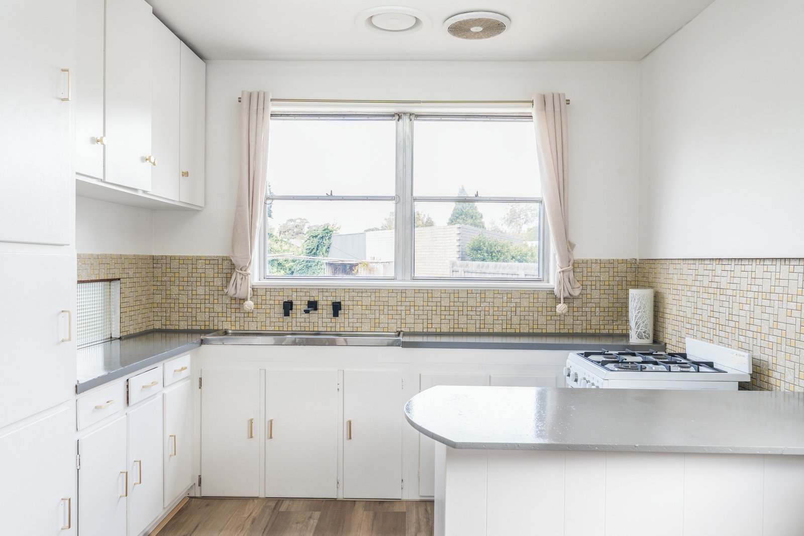 The kitchen features a gas stovetop, electric oven and plenty of cupboard space, while the central bathroom includes a shower, toilet, and vanity.