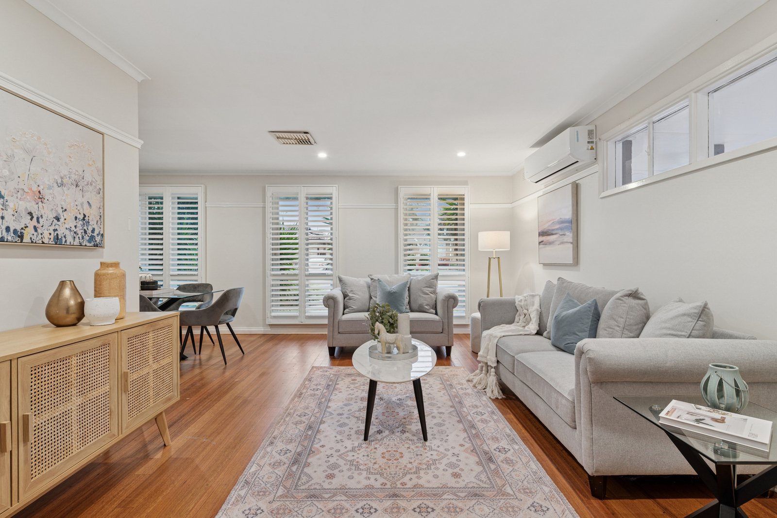 The home features beautiful wooden floors throughout and offers plenty of space. The spacious front lounge and dining area seamlessly flows into a well-equipped kitchen, featuring a dishwasher, gas cooktop, ample storage, and a cozy meals area.