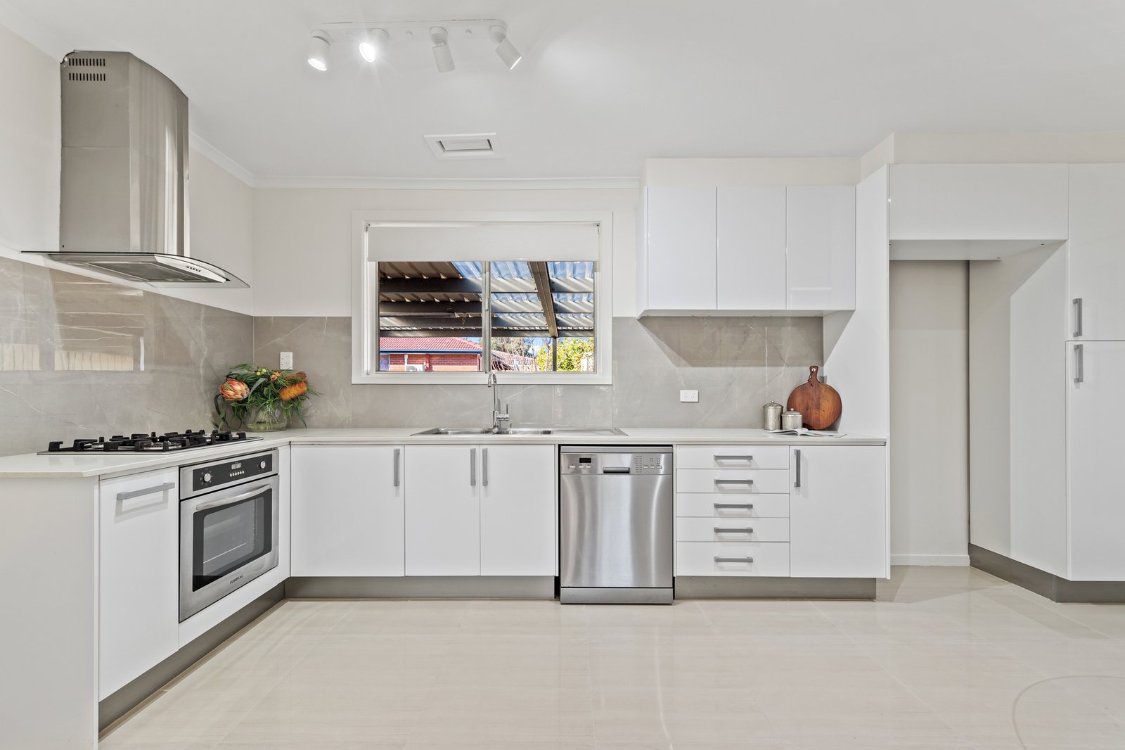 Stylishly renovated and with nothing to be done, the home opens to interiors that are warm, welcoming and filled with abundant natural light. The inviting lounge is enhanced by glossy floorboards and is a space for family relaxation as well as effortless entertaining, while the sleek stone kitchen has plenty of room for a table and nightly meals and is equipped with a porcelain splashback and quality appliances, including a gas cooktop and stainless steel dishwasher.