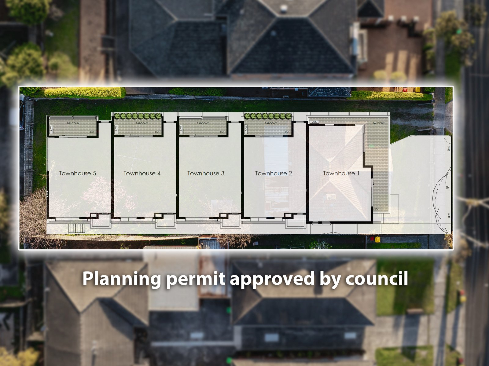 Adding to its appeal, the property benefits from a granted planning permit with endorsed plans for an architecturally designed project of five contemporary triple-storey townhouses (Class 1 dwellings). Each townhouse is thoughtfully planned with a private garage and direct access from a shared driveway, balancing modern living, privacy, and sustainability.