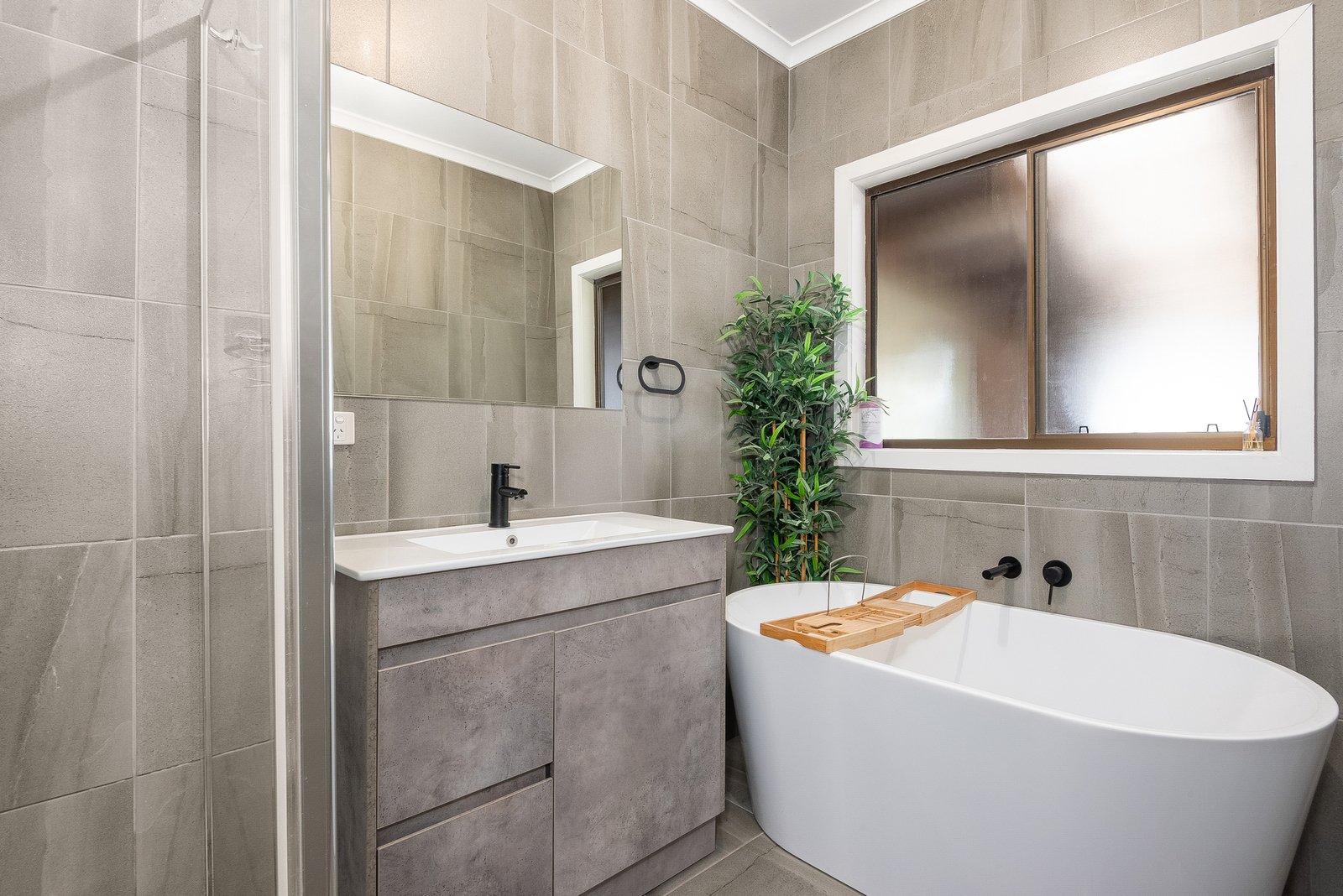 Comprising four bedrooms, all include built-in robes, serviced by a stunning contemporary bathroom finished in floor to ceiling tiles, with freestanding bath, separate shower, modern vanity, and chic black tapware. A well-appointed laundry and separate wc cater for fantastic functionality.