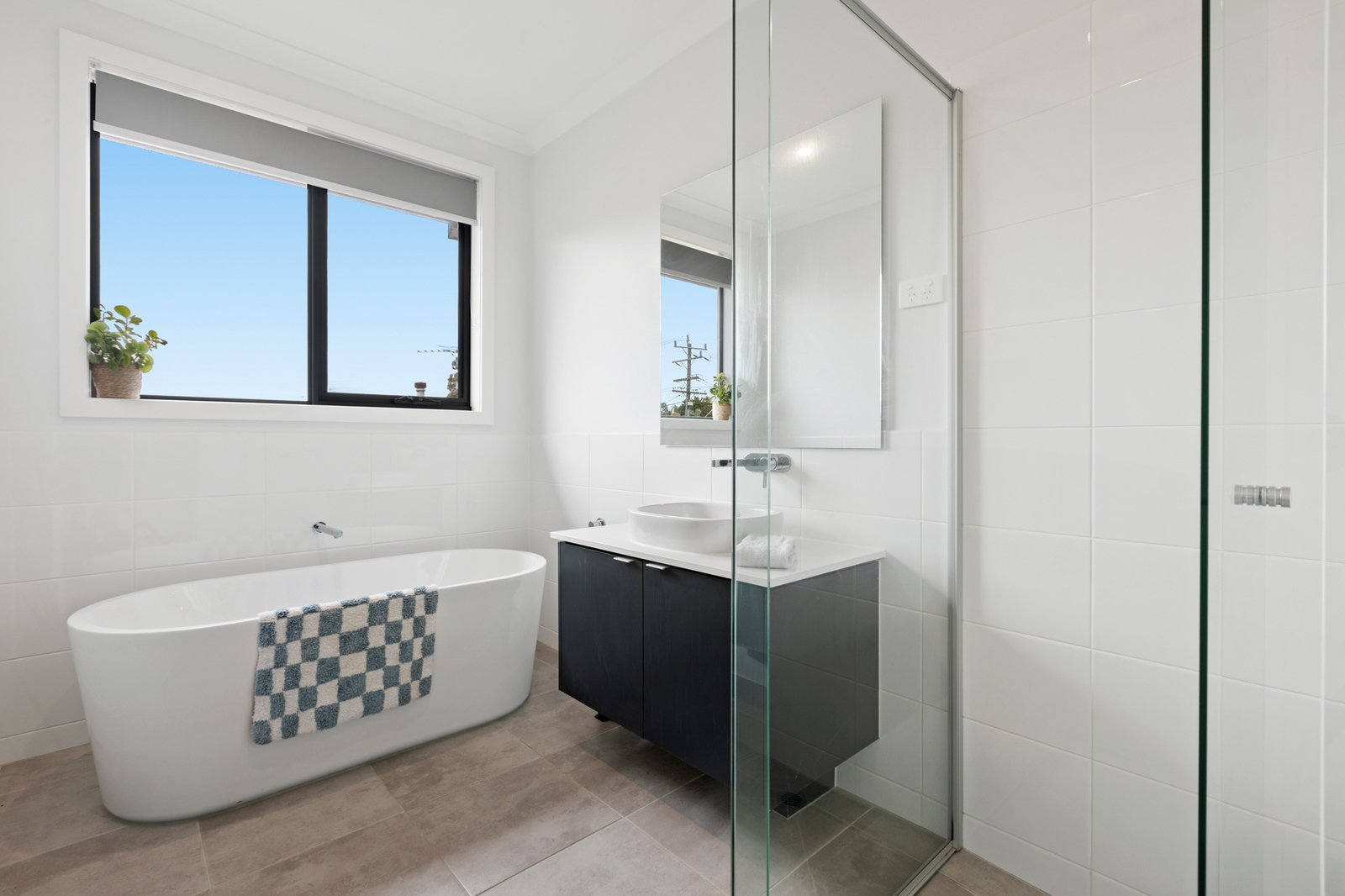 A ground-floor master with ensuite & walk-in robe broadens the home’s appeal to downsizers, while three additional bedrooms are tucked away upstairs along with a smartly-appointed bathroom, separate WC & study nook.