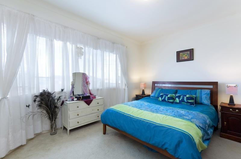 The master bedroom is a standout, featuring a large bay window, extensive built-in robes, and semi-ensuite access to a bathroom with separate bath and shower. The two additional bedrooms both fit double beds and include built-in robes.