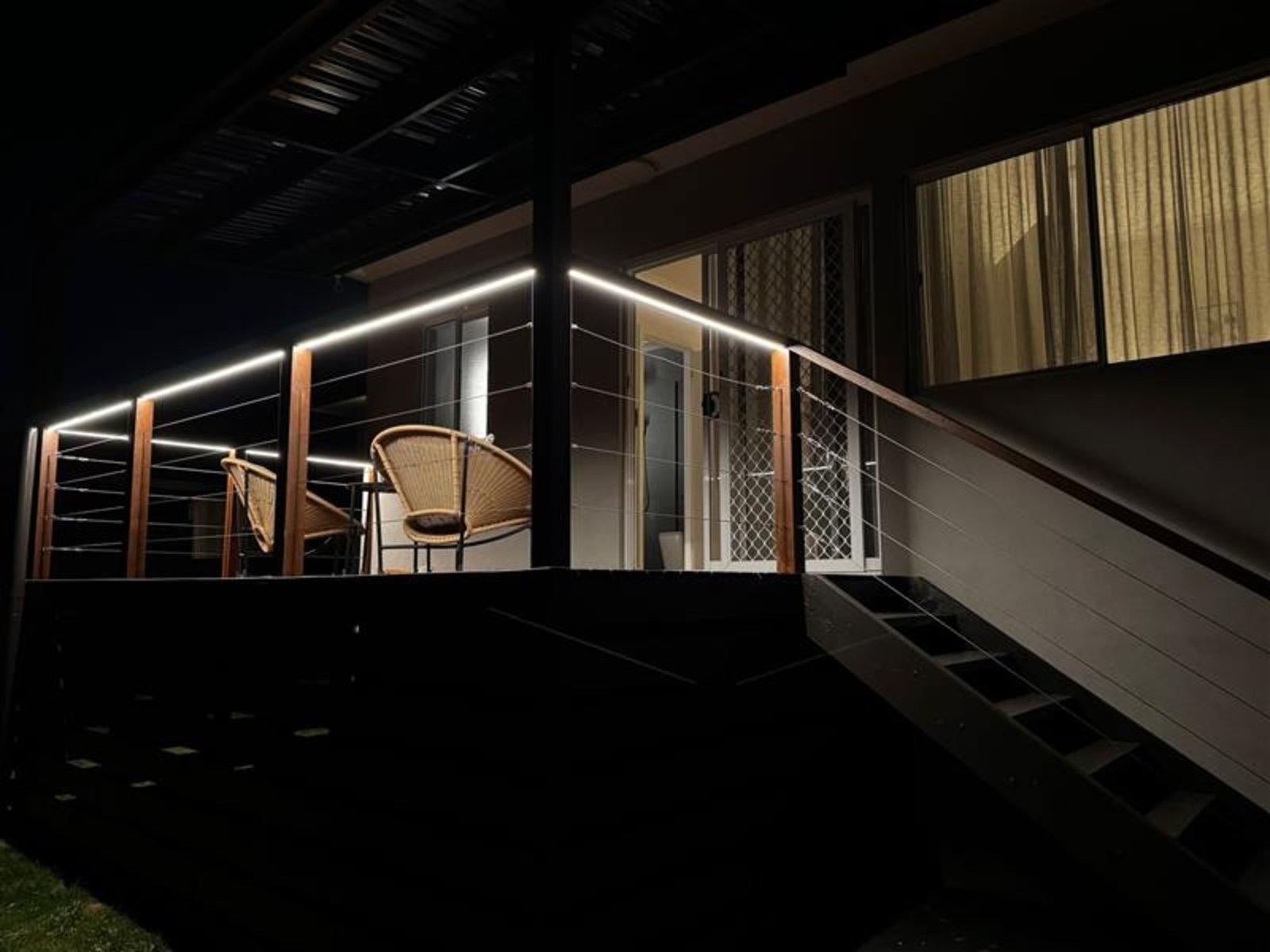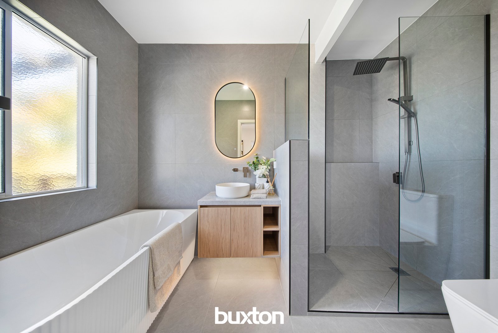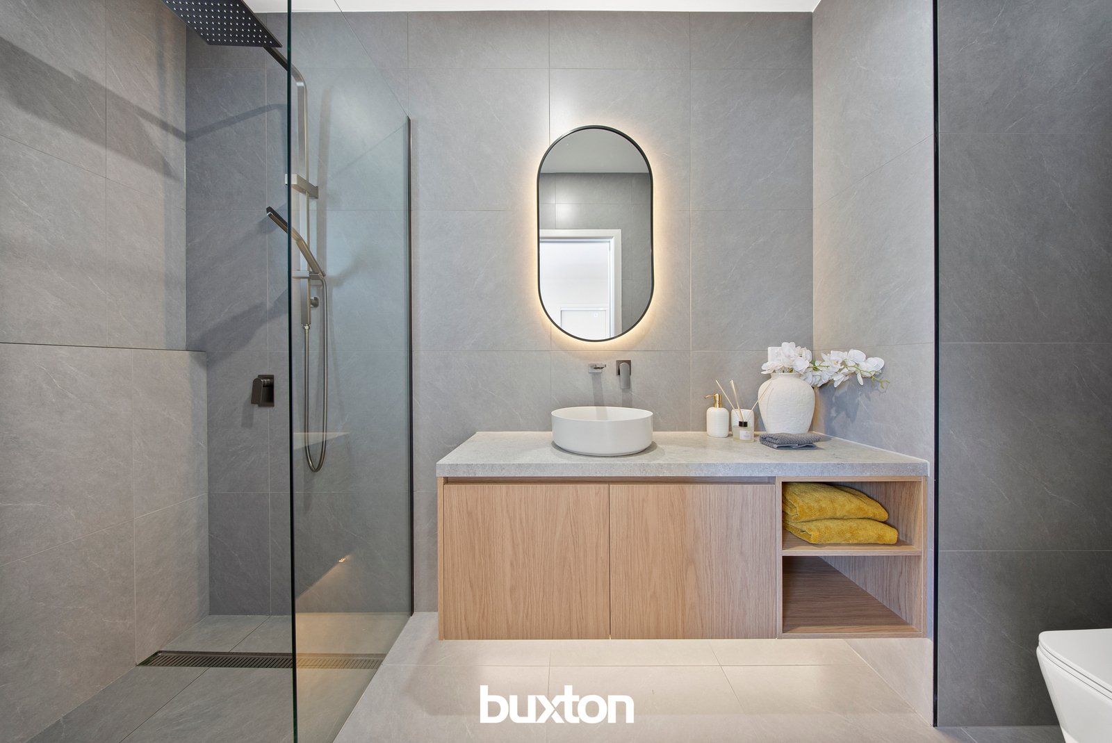 Trendy bathrooms promise total relaxation with rainfall showers, floating vanities illuminated by LED strips, gun metal tapware and a showcase fluted bath in the guest bathroom.