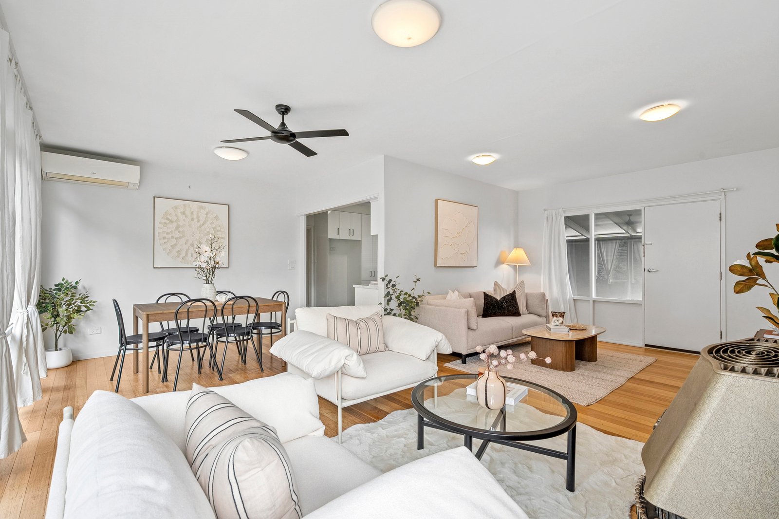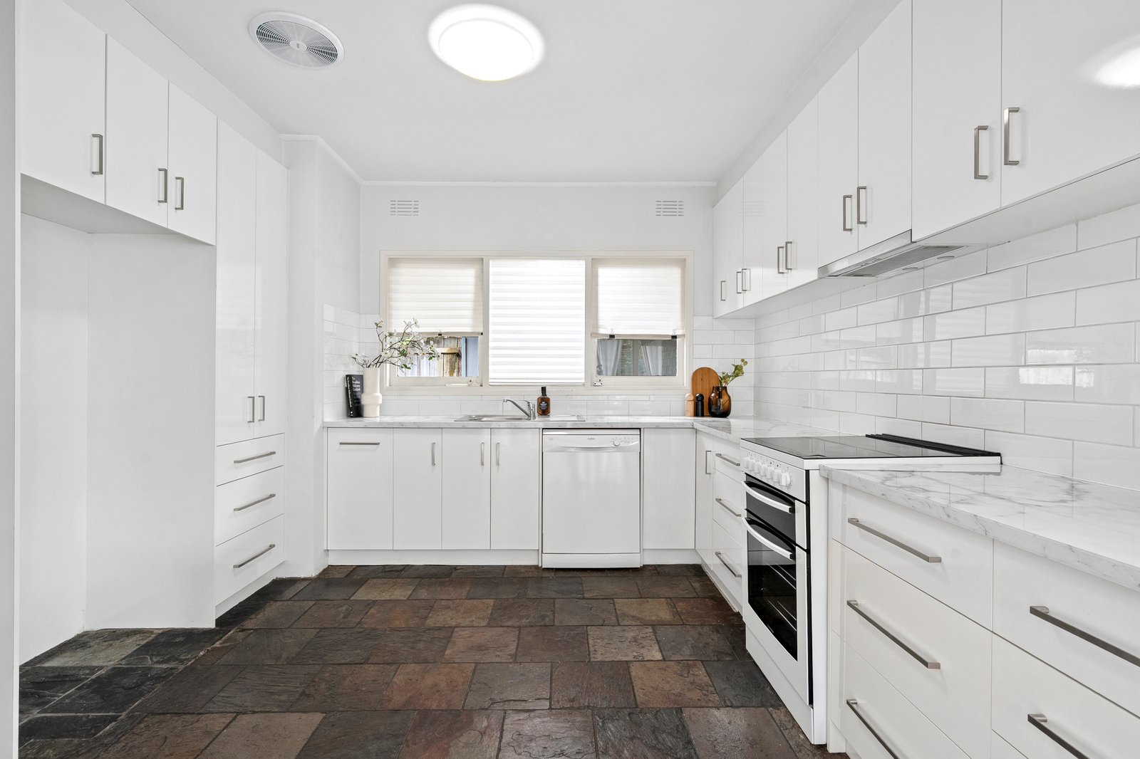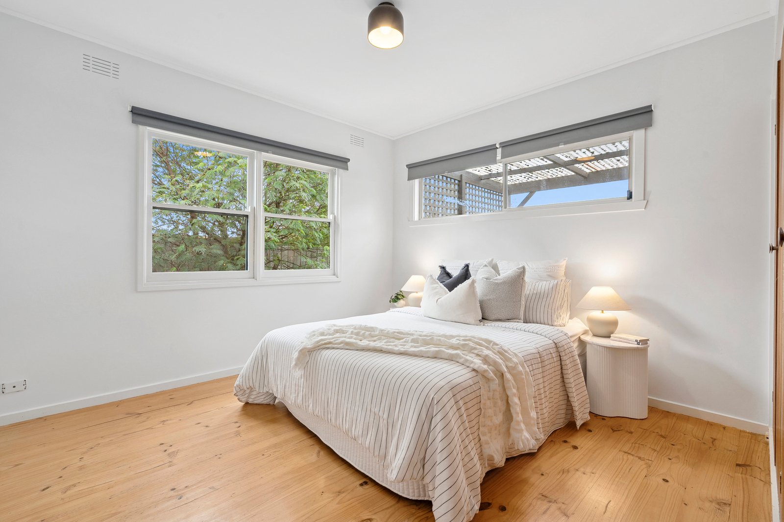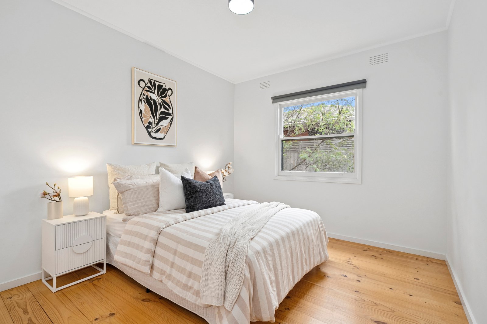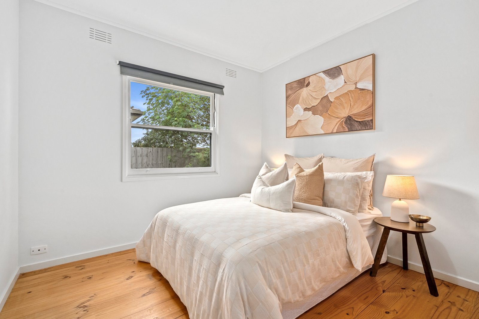 Set amongst established gardens, the mid-century façade retains all the charm of its original era. Entry into an inviting living area reveals polished timber floors, an original brick mantel and fireplace, and floor to ceiling north facing windows allowing warm natural light to flow within. Split system heating and cooling, plus a ceiling fan, take care of your modern comforts throughout the seasons. The adjoining dining area flows through to an elegant kitchen equipped with 600mm electric oven and cooktop, dishwasher, classic subway tile splashback, modern cabinetry, ample bench space and generous storage.