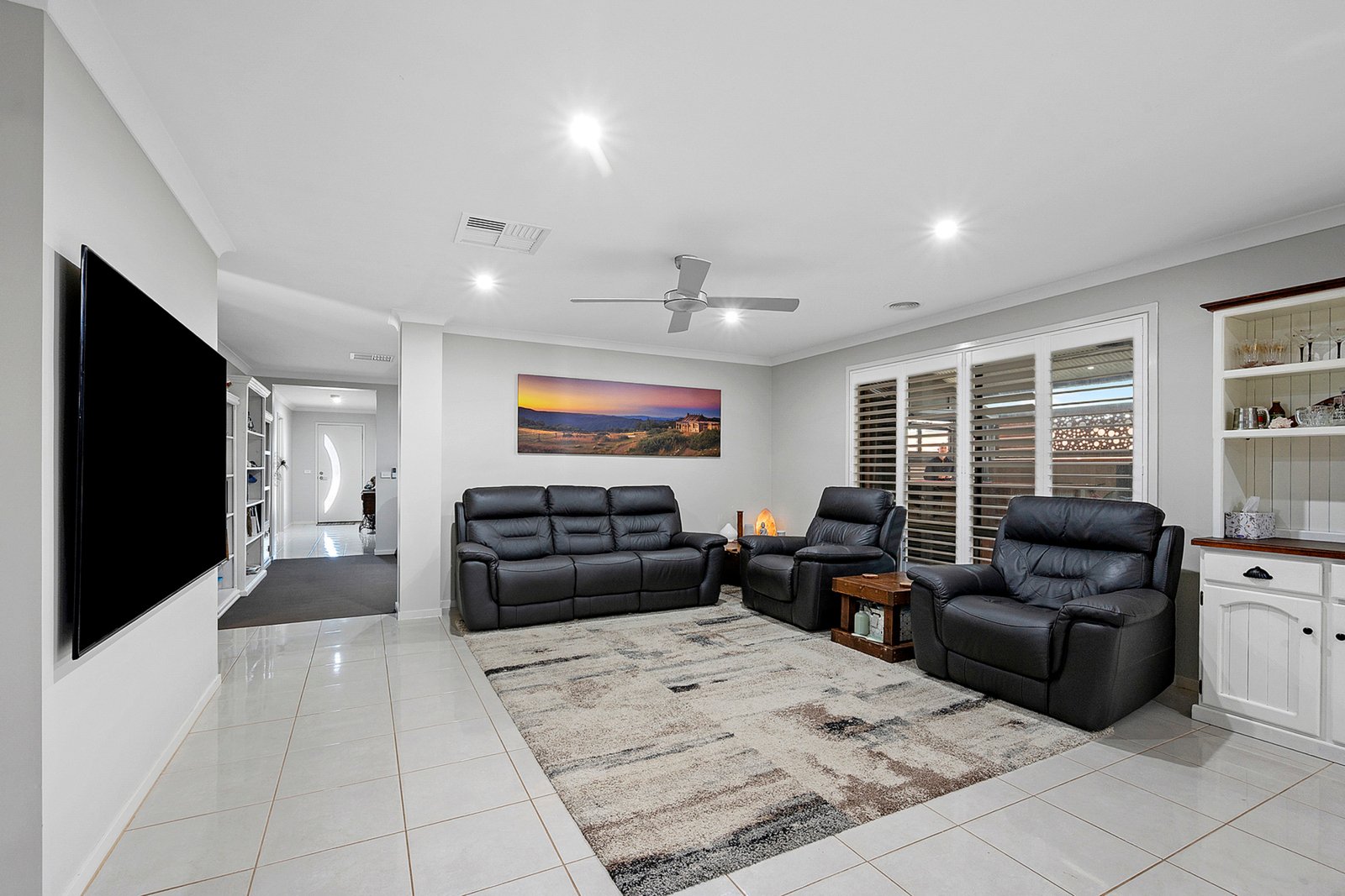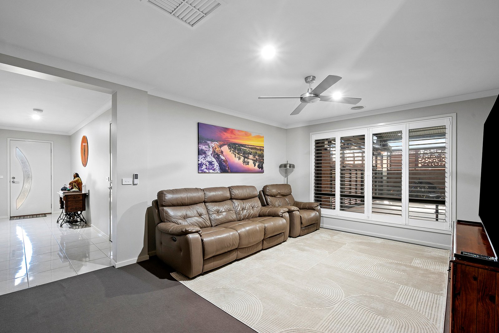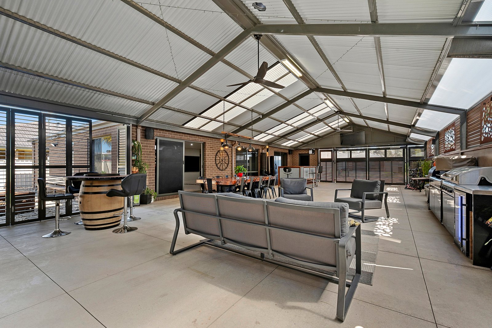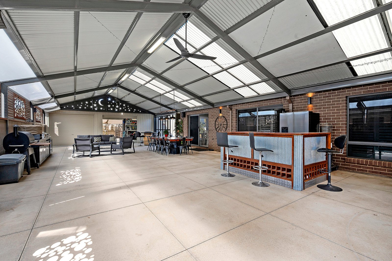 Open the sliding doors from the meals area and be amazed by the enormous covered entertaining space—measuring an impressive 18m x 8.5m. With remote gate access, ceiling fans, and a concrete floor, it’s the perfect setup for hosting parties or relaxing year-round.