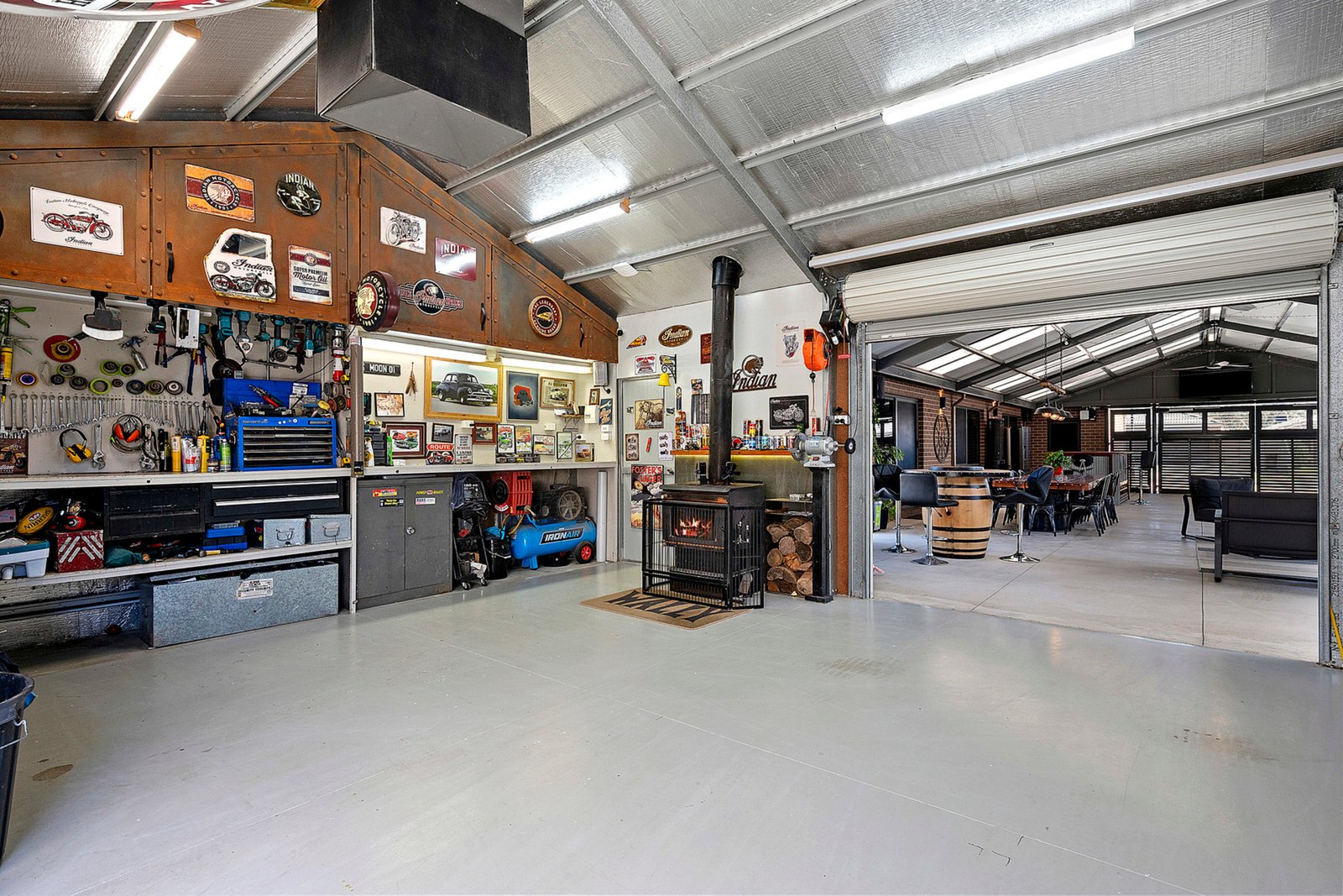 Beyond this area lies a fully equipped double garage/workshop (10m x 6m) complete with shelving, two mezzanine floors, wood heater, ceiling fan, and even ducted evaporative cooling a true “man cave” or versatile workspace.