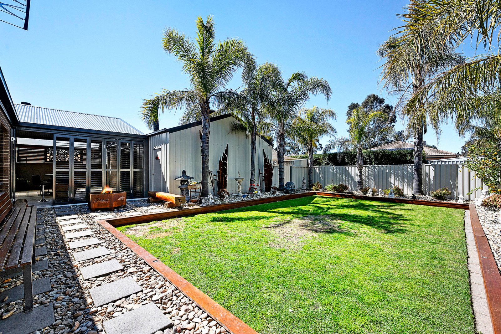- Designated firepit zone framed by floor-to-ceiling plantation shutters