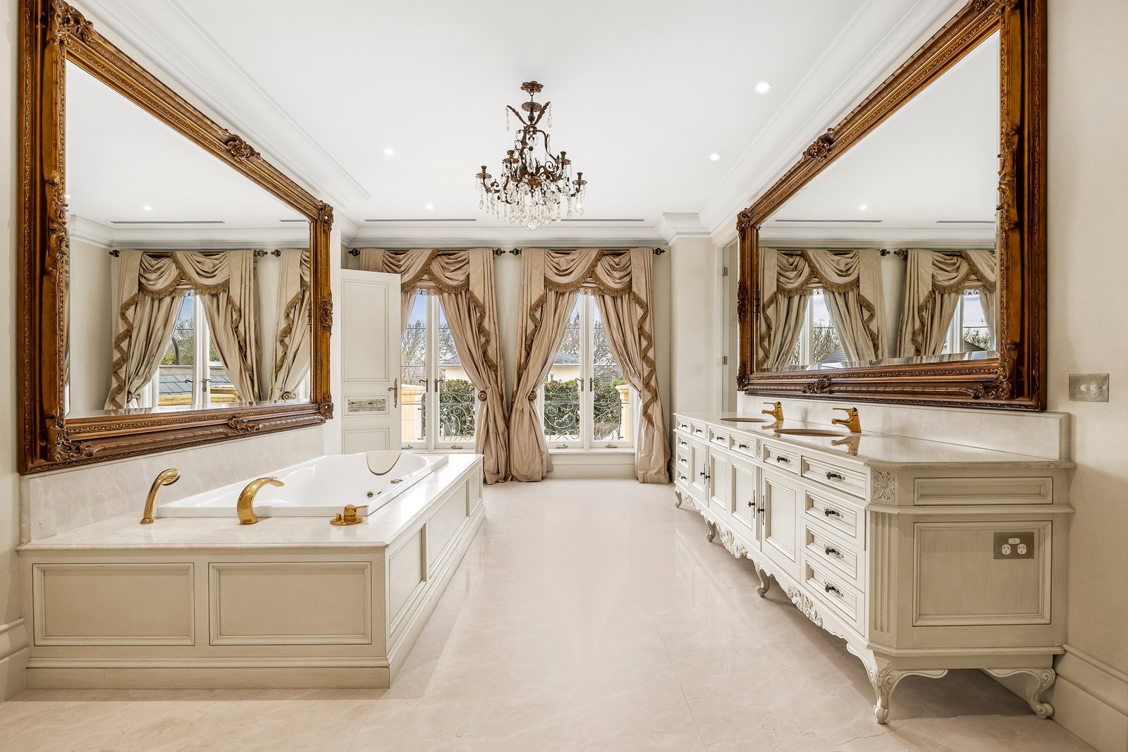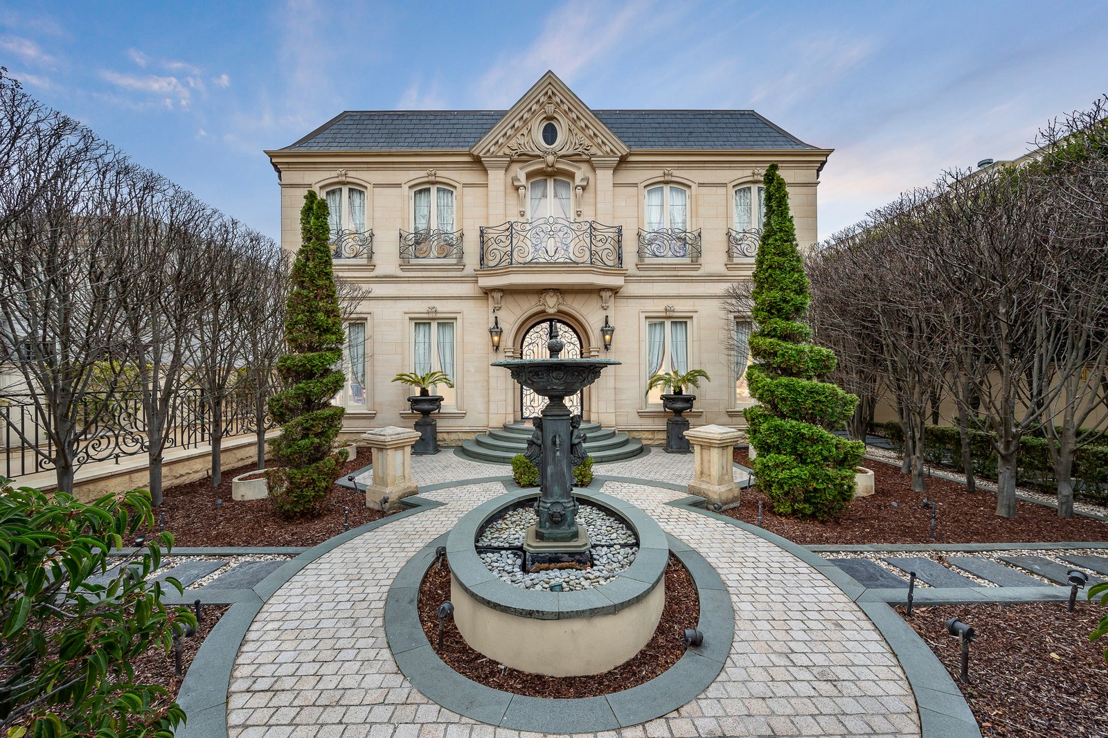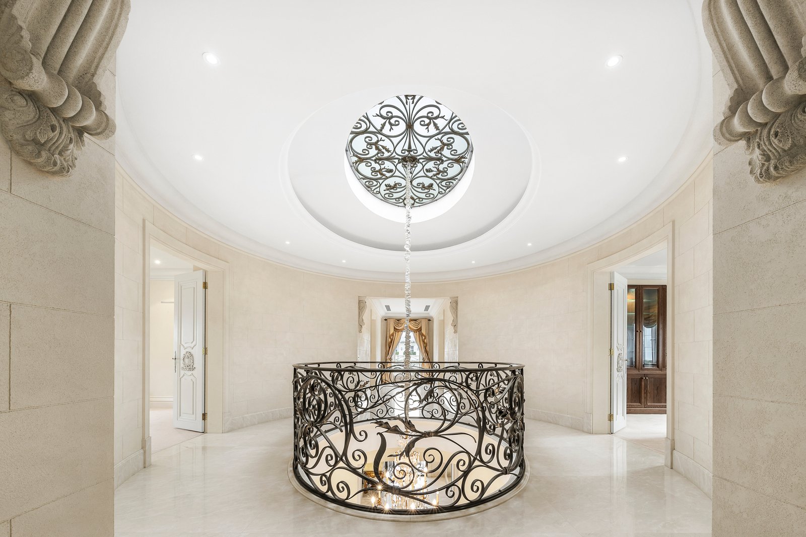 Set within a north-facing, award-winning parterre garden, the limestone façade reflects perfect symmetry and a true sense of grandeur. Inside, an imposing reception hall beneath a soaring double-height ceiling and oval skylight creates a spectacular first impression. A hand-forged wrought iron canopy crowns the space, while a Versailles-style antique chandelier lends glittering drama after dark.
