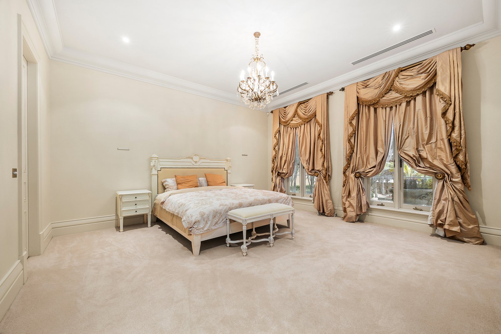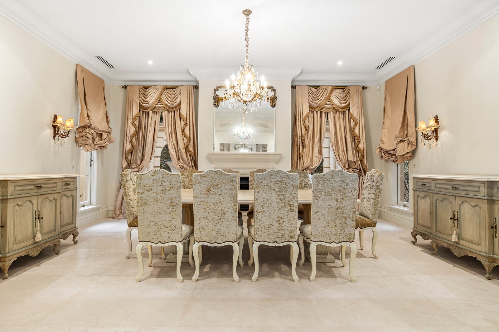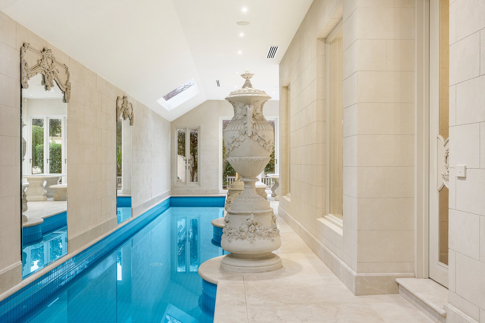 Palatial proportions and extraordinary amenity define the interiors. Marble flooring links the library, formal sitting room and grand dining room, while an expansive family domain flows to an indoor lap pool and a sunlit loggia with indoor BBQ. The entertainer’s kitchen is both statement and sanctuary, its bespoke island and mirrored detailing setting the stage for a Lacanche cooker, extensive custom cabinetry and a fully equipped scullery with integrated French door fridge/freezer and additional dishwasher.
