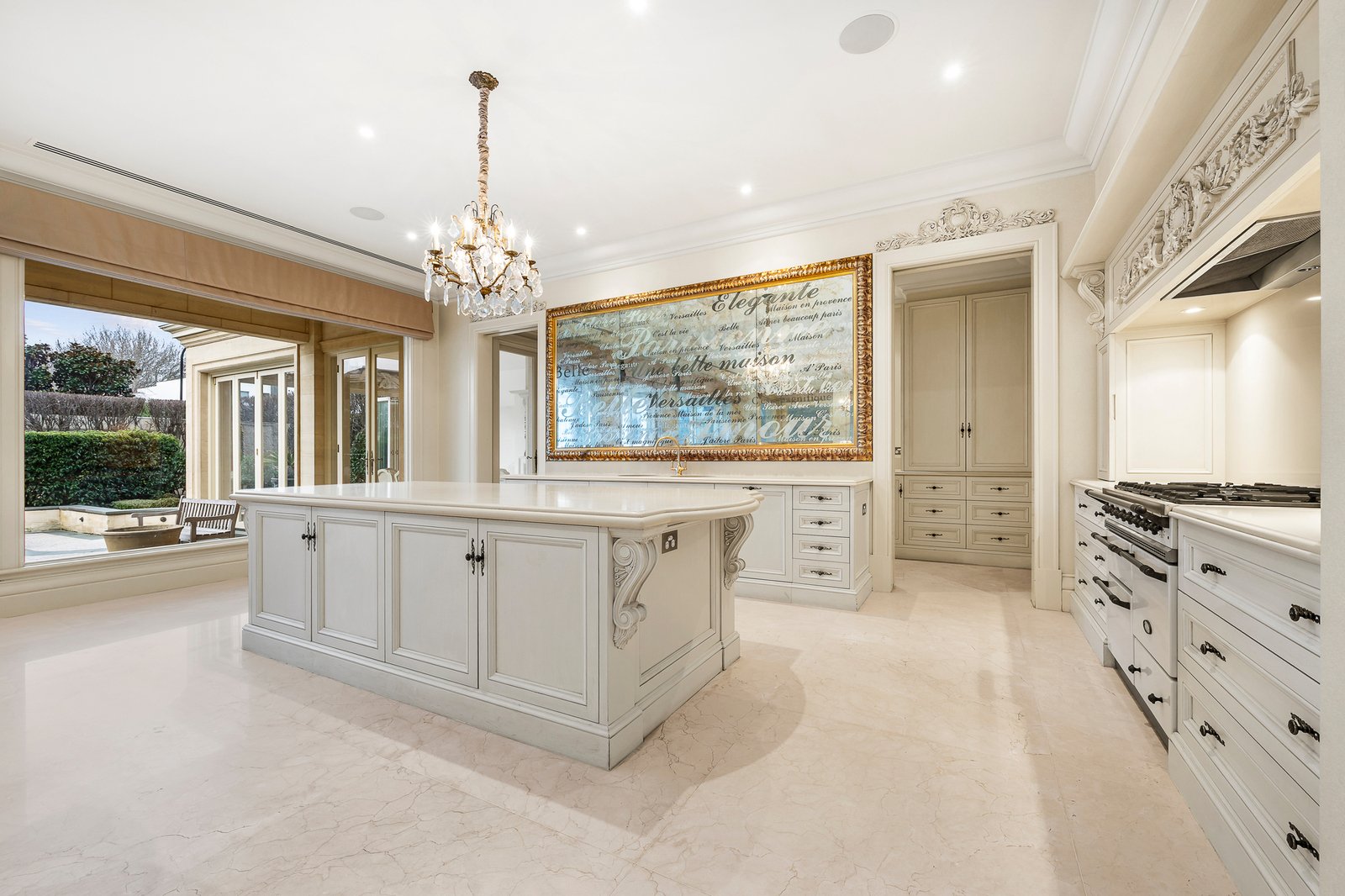 French artistry is showcased in every detail: swathes of Mount Gambier limestone sculpted into curved walls, cornices and architraves; hand-cast fireplace mantles adorning five gas fireplaces; elaborately carved French doors and ornamentation throughout; and a sculptural kitchen hood at the heart of the culinary domain. Each bespoke element affirms the craftsmanship at the core of this remarkable home.