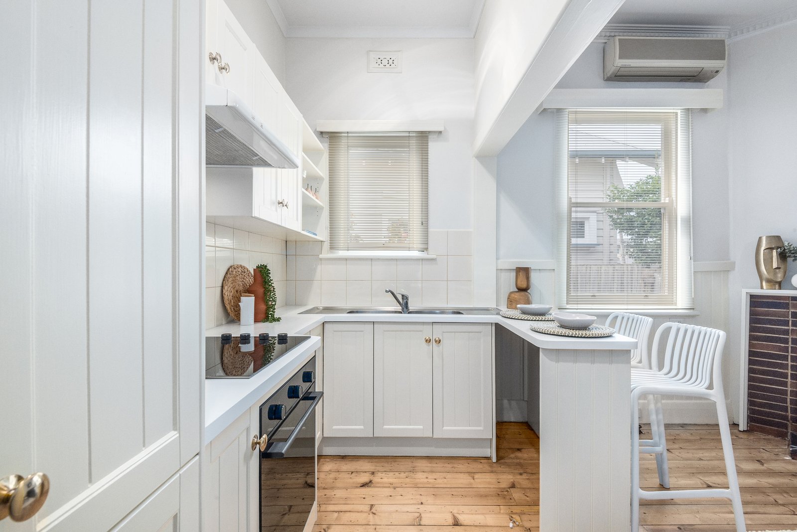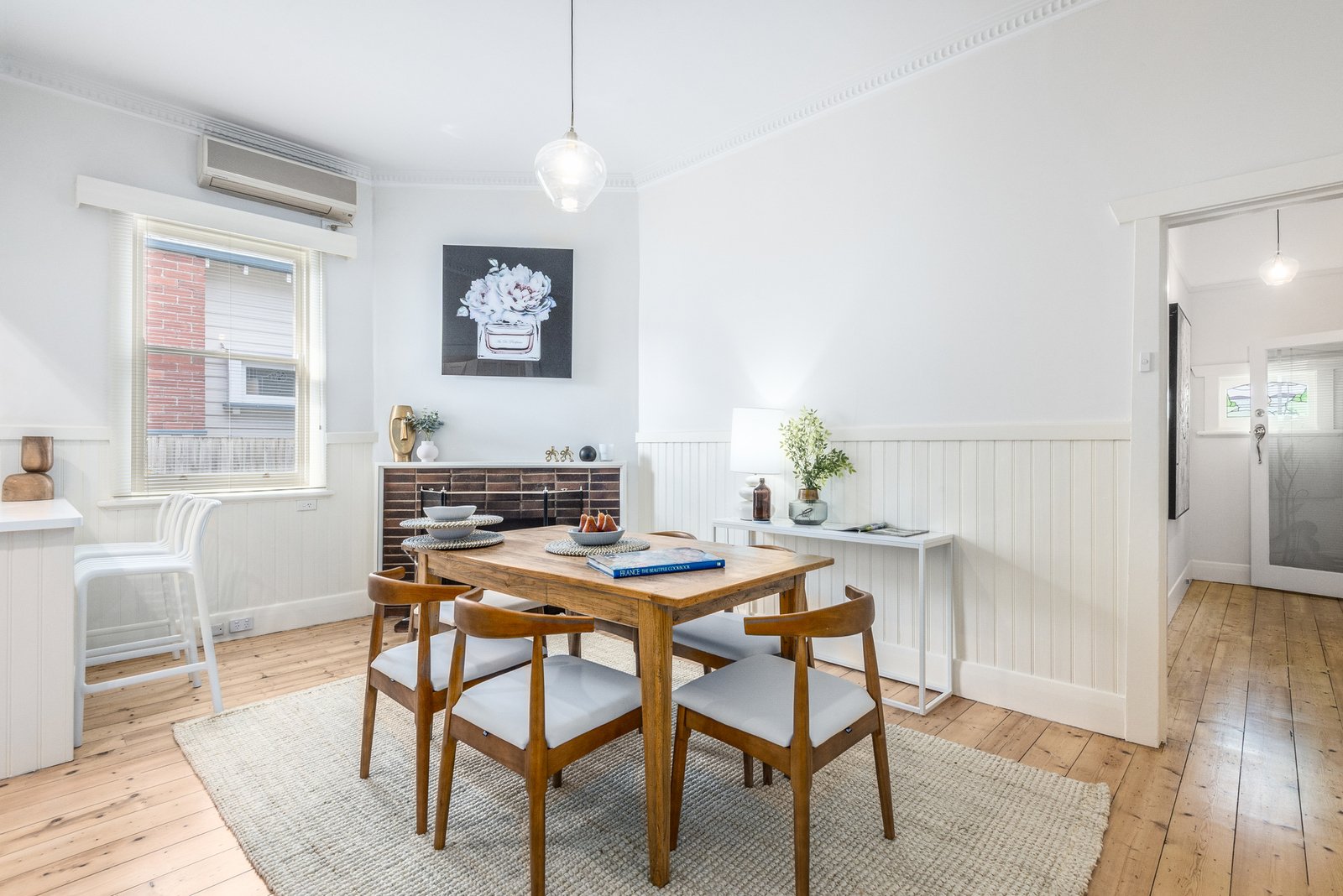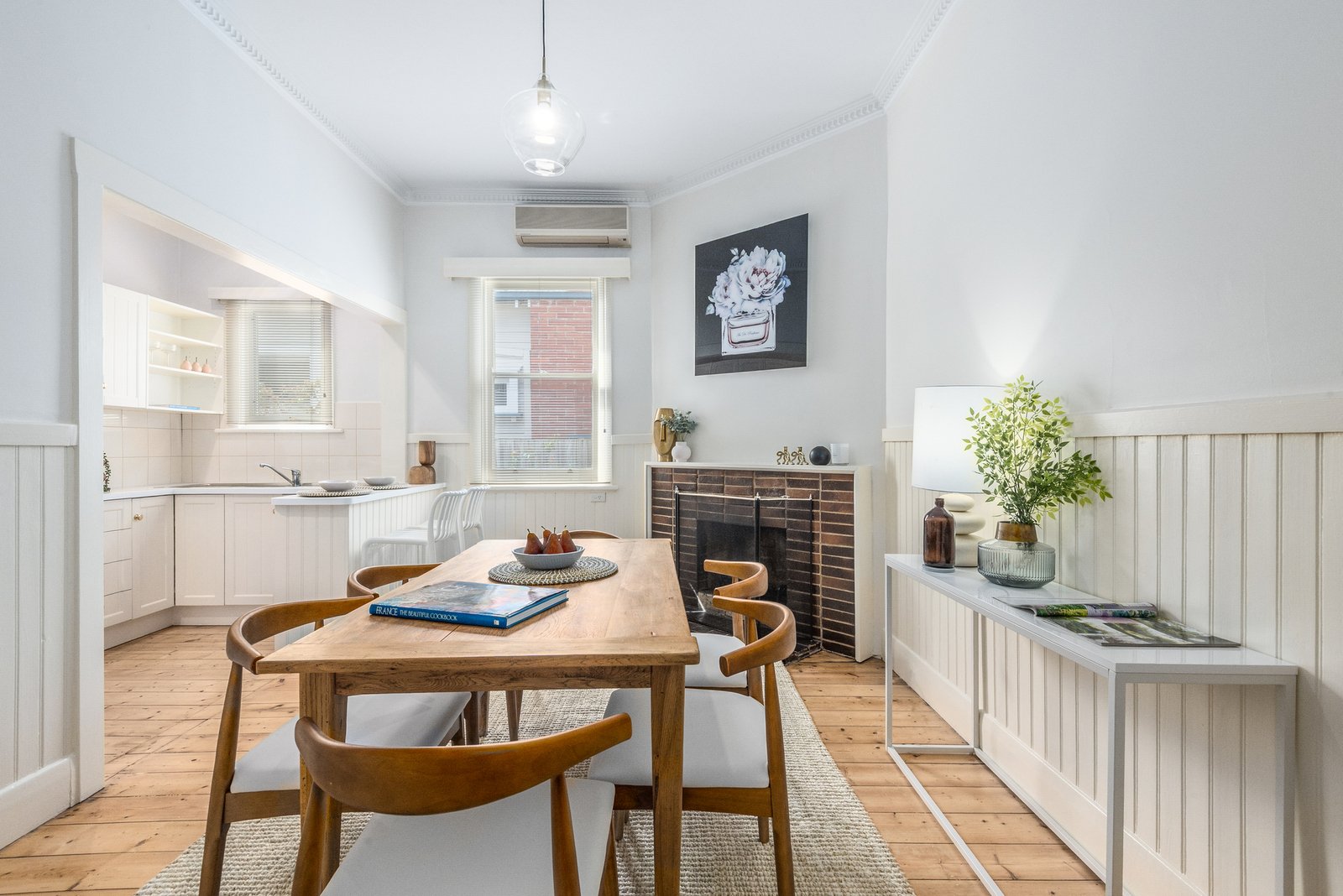 Set behind a picket fence, the character façade and grand verandah are timeless in appeal. Inside, high ceilings, picture rails and polished timber floors introduce the elegant theme of the interiors. Off the entry, a formal lounge features an original mantel and timber feature wall with sconce lighting, along with a beautiful bay window with leadlight panels, offering a sophisticated room to retreat. At the heart of the home, the dining room feature dado walls, a fireplace, and ambient pendant lighting, adjoining a well-appointed kitchen with shaker style cabinetry, modern 600mm electric oven and cooktop, and generous storage, providing a functional space for everyday living and easy entertaining.