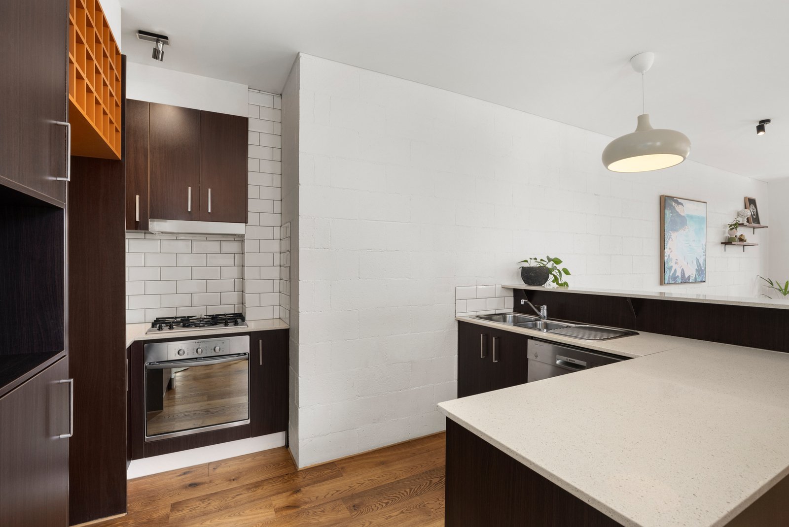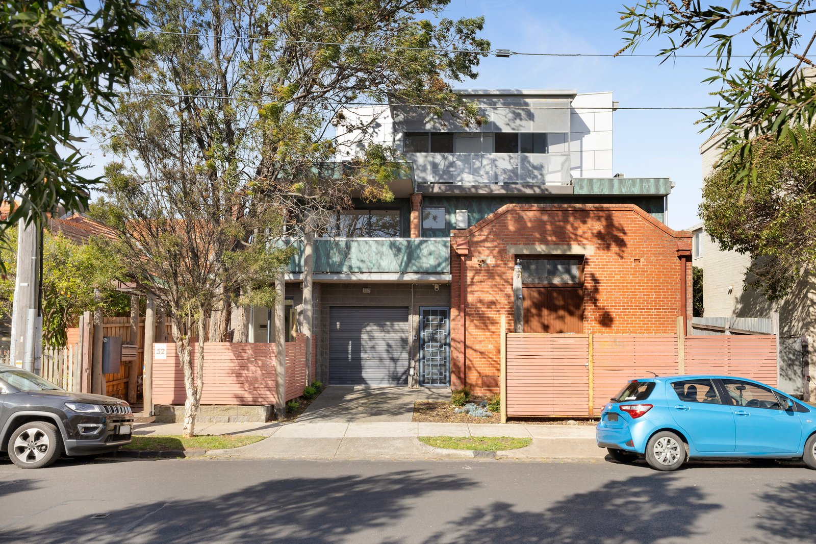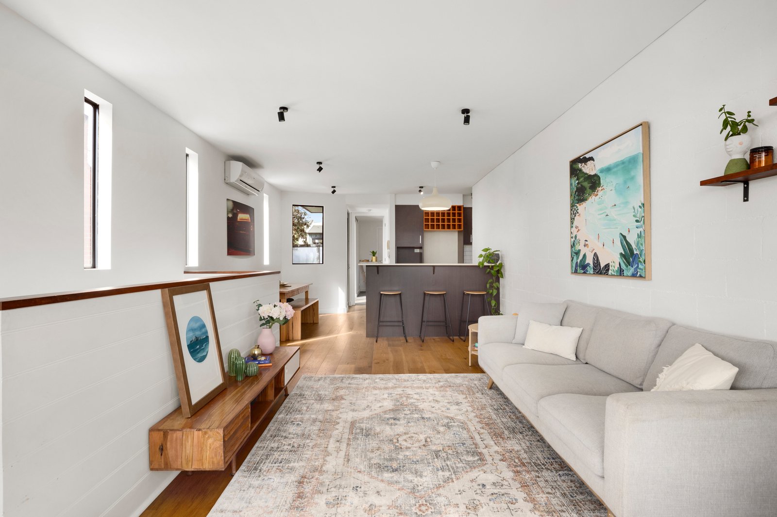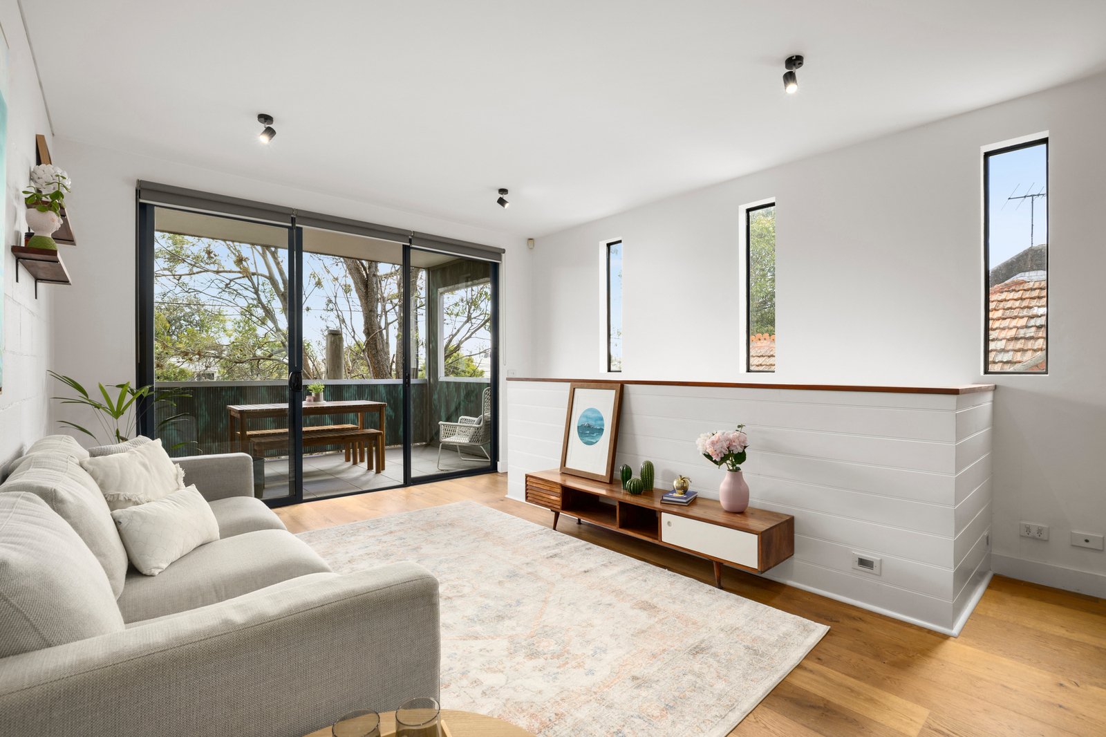 The first floor features a sun-drenched open-plan living and dining area with polished floorboards, opening to a balcony with elevated street views. A contemporary kitchen, complete with gas cooktop, dishwasher and space for a dining table, ensures both practicality and style. The main bedroom with walk-in robe adjoins a central bathroom with shower-over-bath.