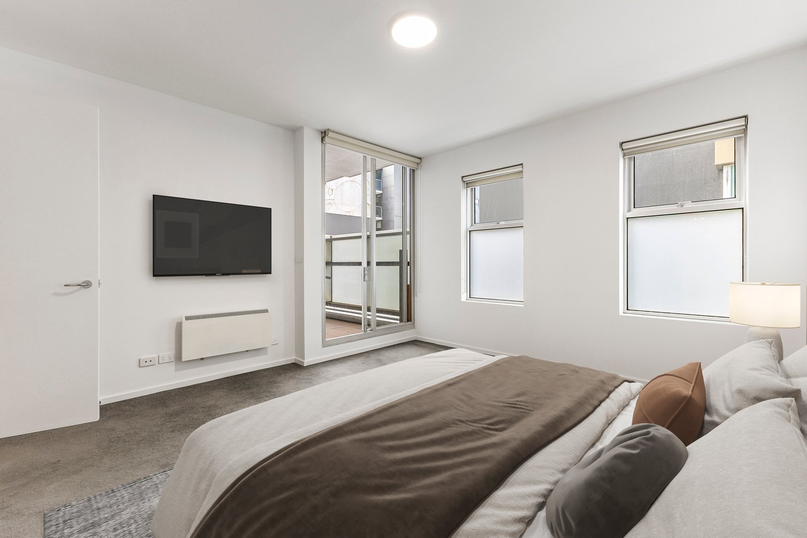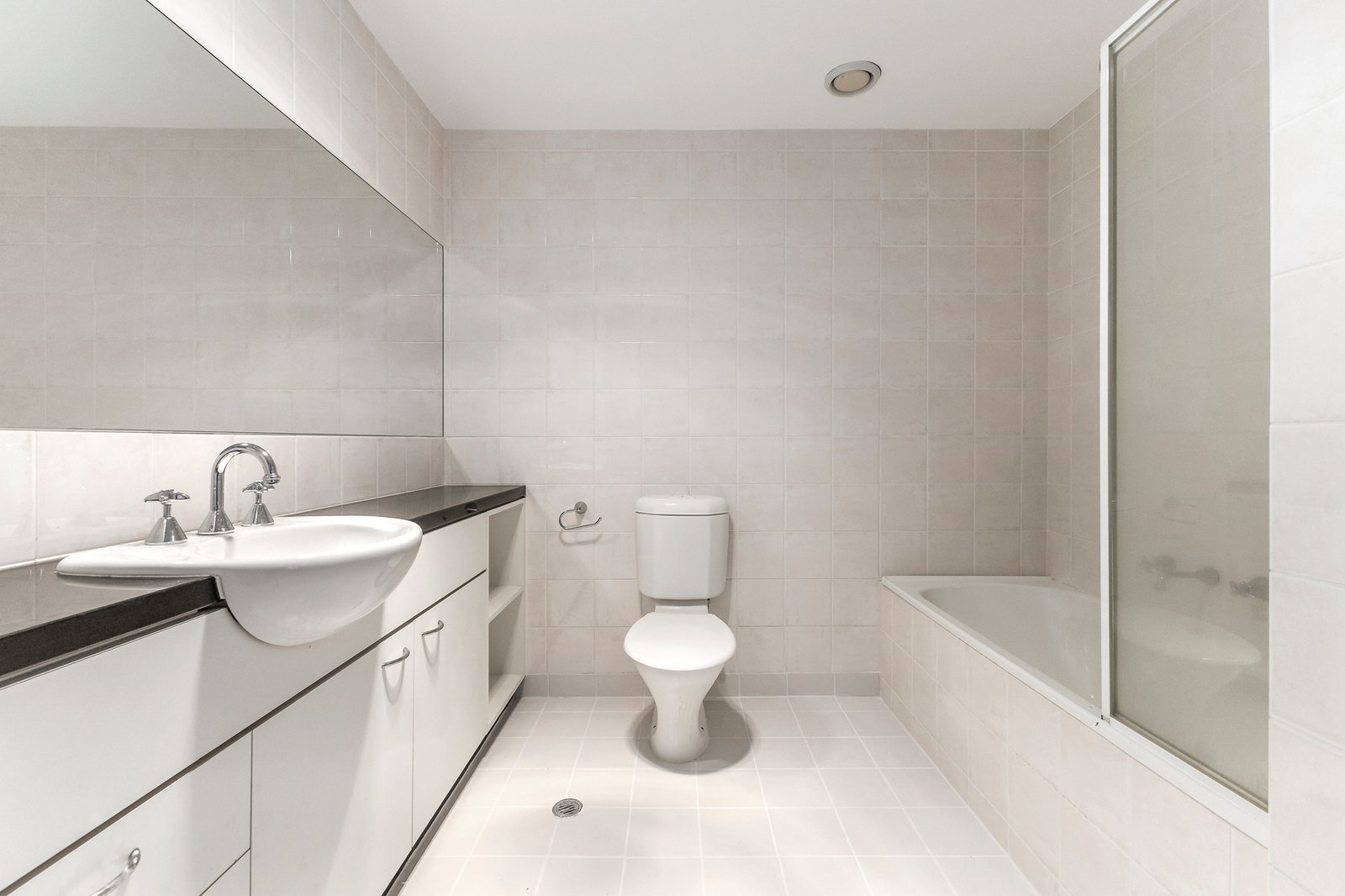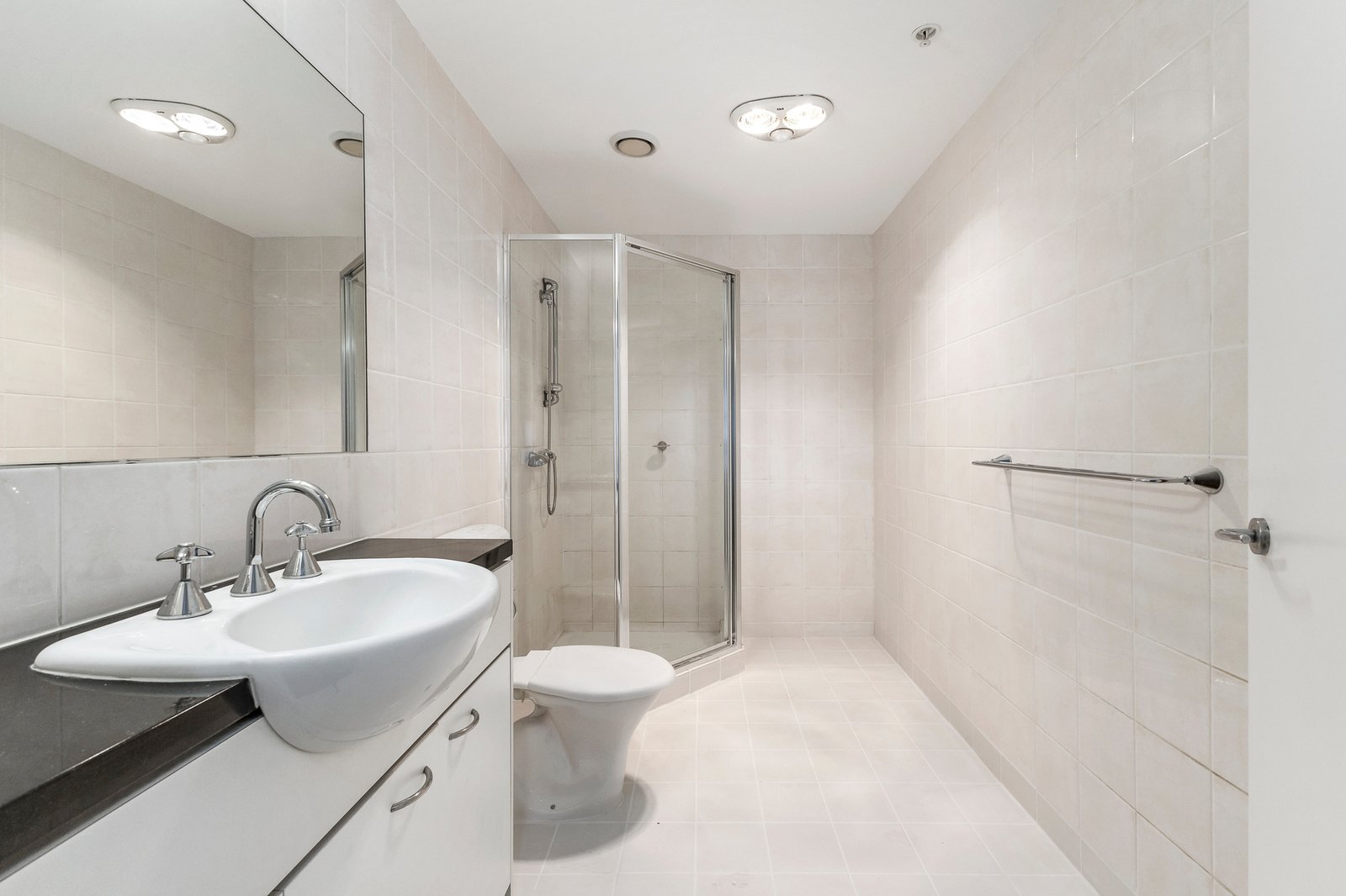A central bathroom with a bath, separate laundry with storage, and heating/cooling throughout add to the apartment’s practicality.