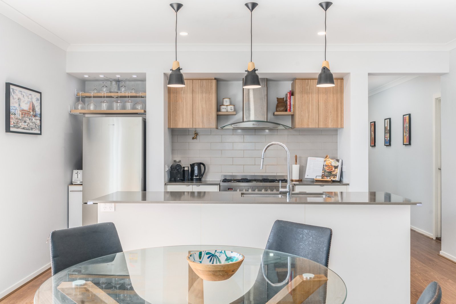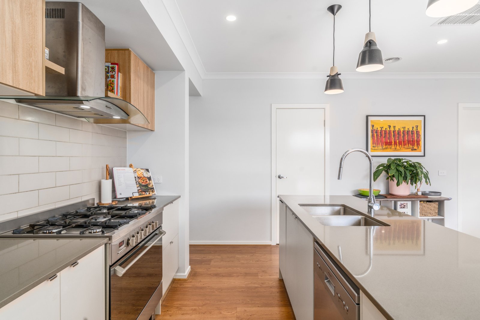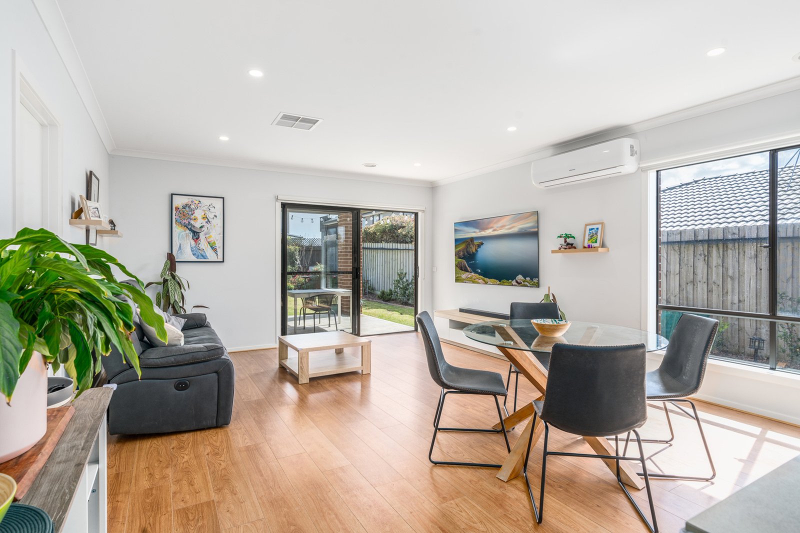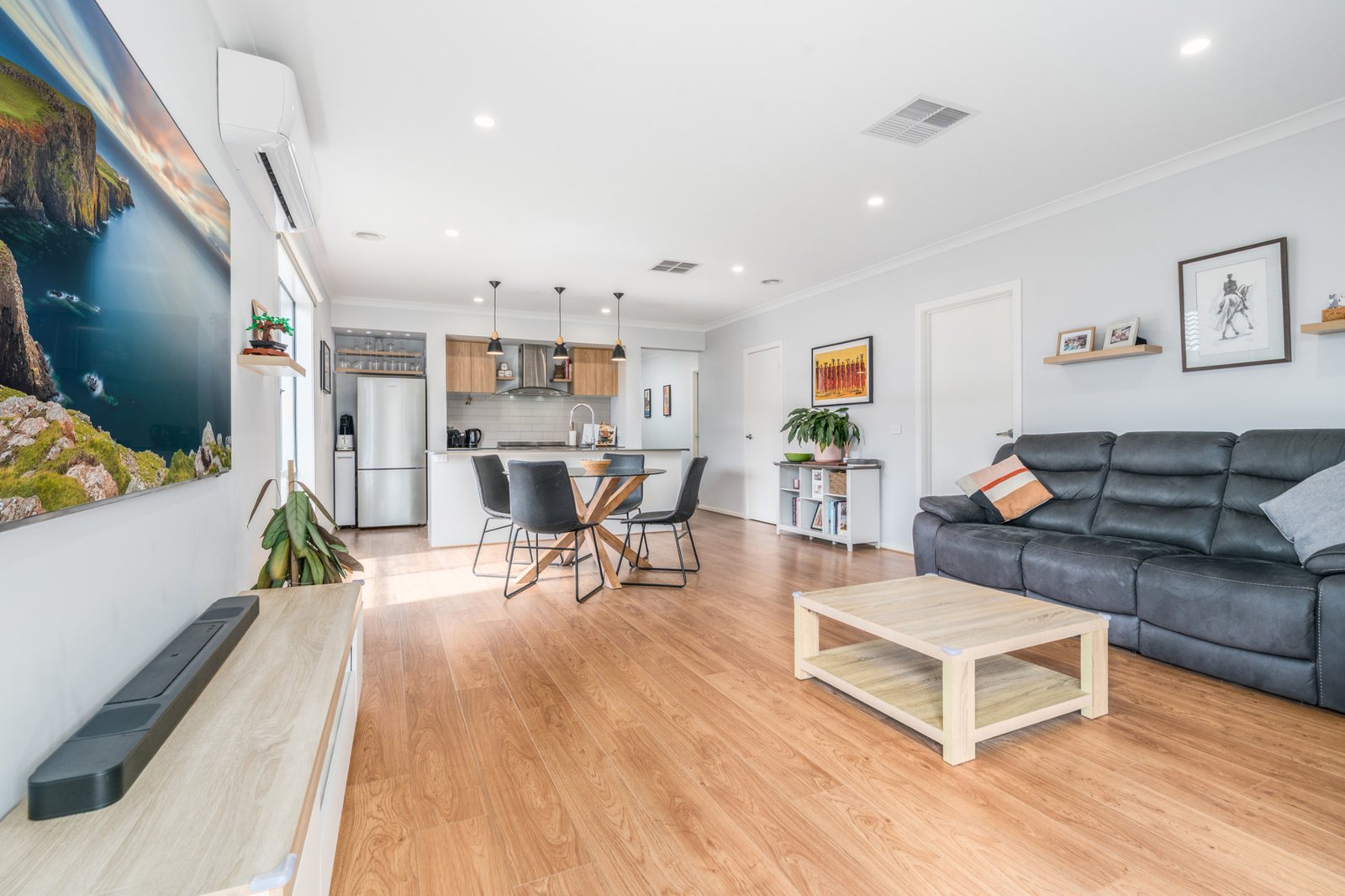 The floorplan features four spacious bedrooms, including a sunlit master retreat with walk-in robe and stylish ensuite, while the remaining three bedrooms are zoned for privacy. The open-plan kitchen, living and dining area is the heart of the home, complete with stone benchtops, hanging pendant lights, a walk-in pantry, stainless steel appliances, extra kitchen shelving, a pull-out bin system, and newly installed power points. Comfort is guaranteed year-round with gas ducted heating, evaporative cooling, and additional split system air conditioning in the main living area. Thoughtful upgrades include window blinds, smart lighting in most rooms, a screen door, floating shelves, TV wall mounts, shoe cabinets in two rooms, and garage storage shelving — every detail has been considered.