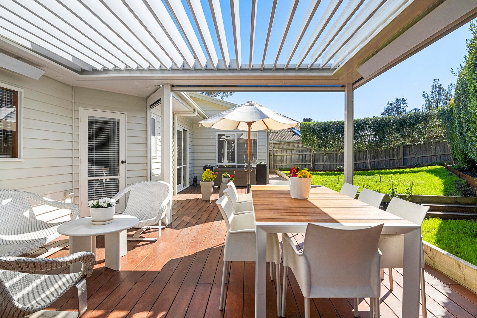 A true north orientation ensures the natural light moves throughout the day, reaching its peak across the two main living domains and the alfresco deck. Natural timber floors underscore the warmth, complementing a gas fireplace in one lounge and extending through to the broad deck, fitted with an automated Vergola for year-round enjoyment. The kitchen and meals area connect at the centre, offering excellent flow, while the garden provides a low-maintenance outlook for long afternoons outdoors. Three bedrooms are set to the rear, each with built-in robes, supported by two bathrooms, with the addition of a separate studio, which adds another dimension with scope as a fourth bedroom, office or wellness retreat.