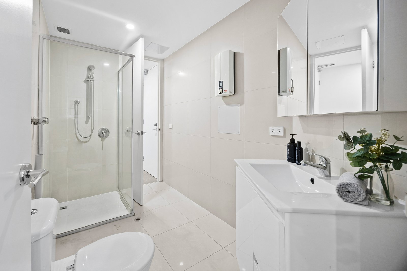 Two generous bedrooms with mirrored robes include one that opens directly to the balcony and another with semi-en-suite-style access to a stylish two-way bathroom with integrated laundry facilities.