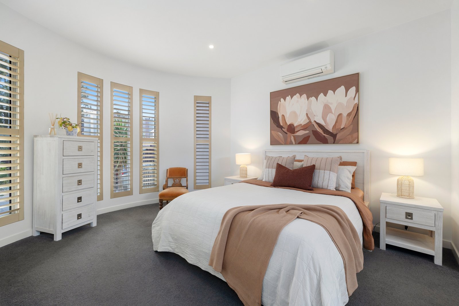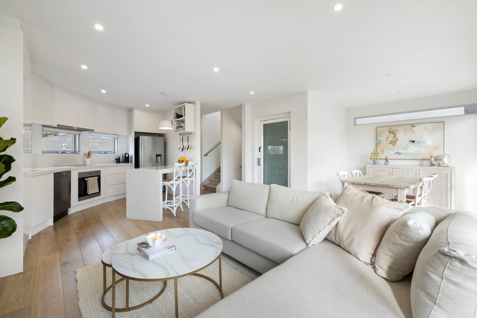 Appointed to a demanding architectural specification, the home features a sophisticated curation with a full complement of Miele appliances for the curvaceous kitchen, full-height tiling for the lush travertine bathrooms, and stone benchtops, light Oak floors and plantation-shutters for a touch of coastal cool.