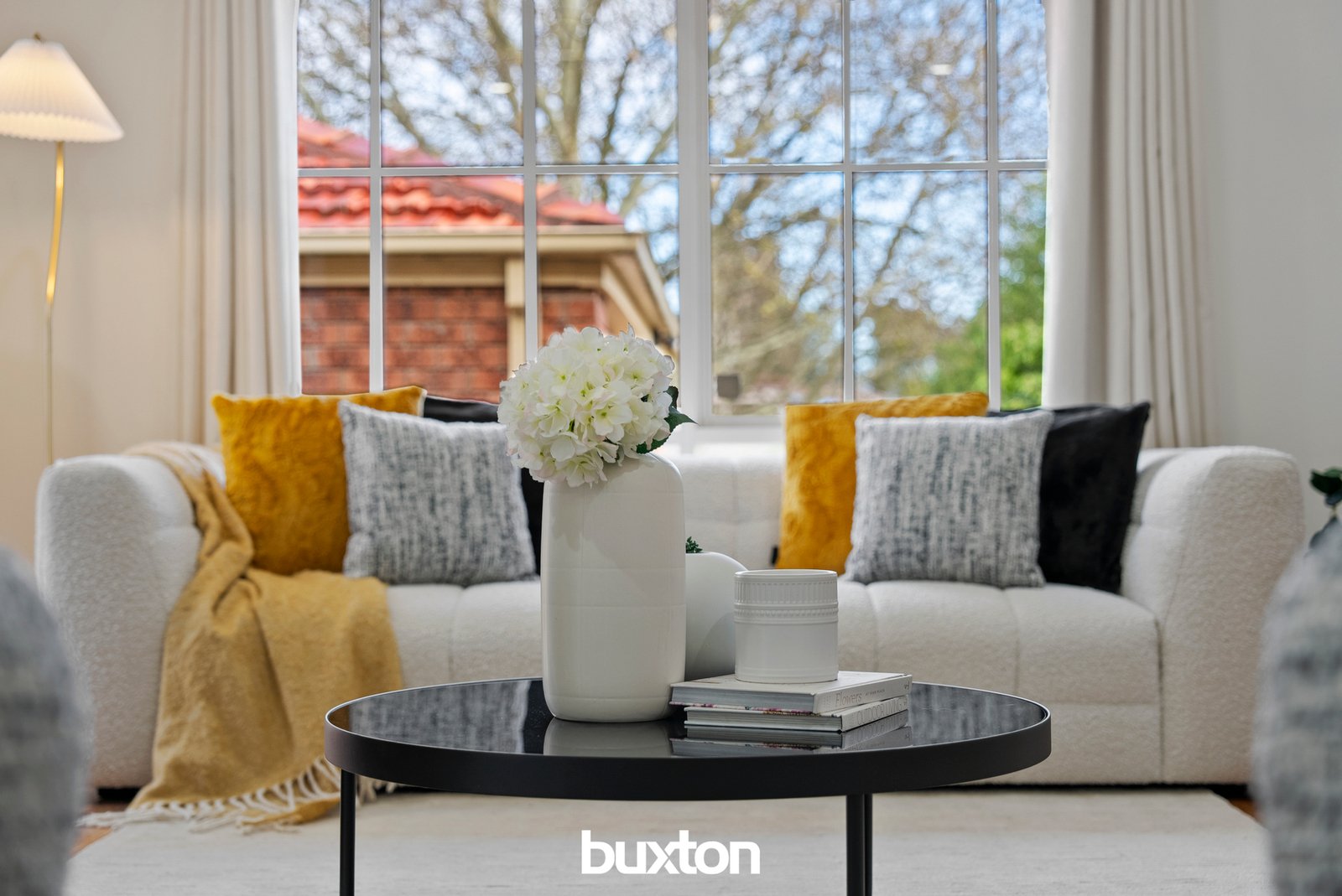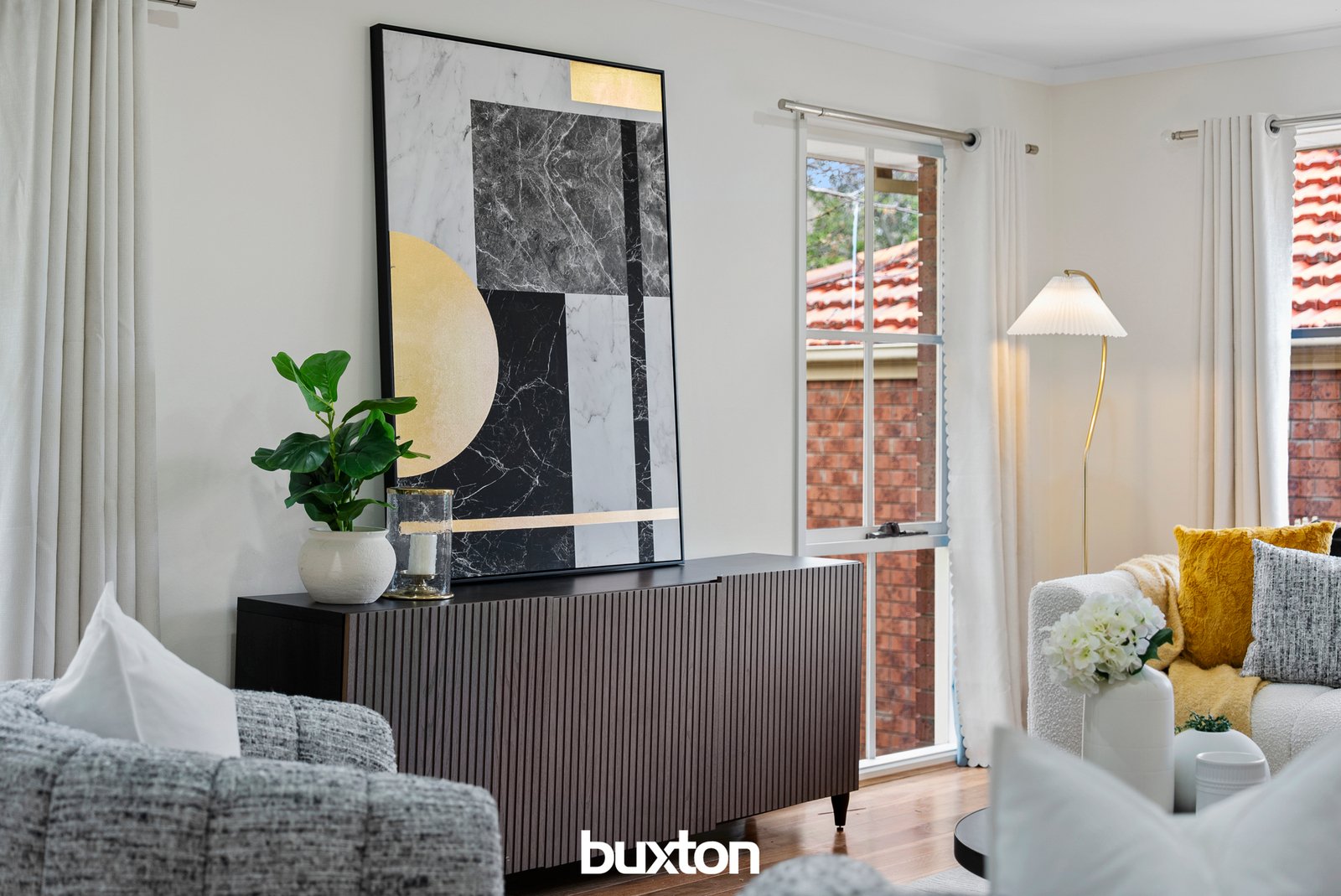 The inviting living space offers dramatic gallery style wall cut outs, and enough space to zone the area for relaxation, dining or hosting friends.
