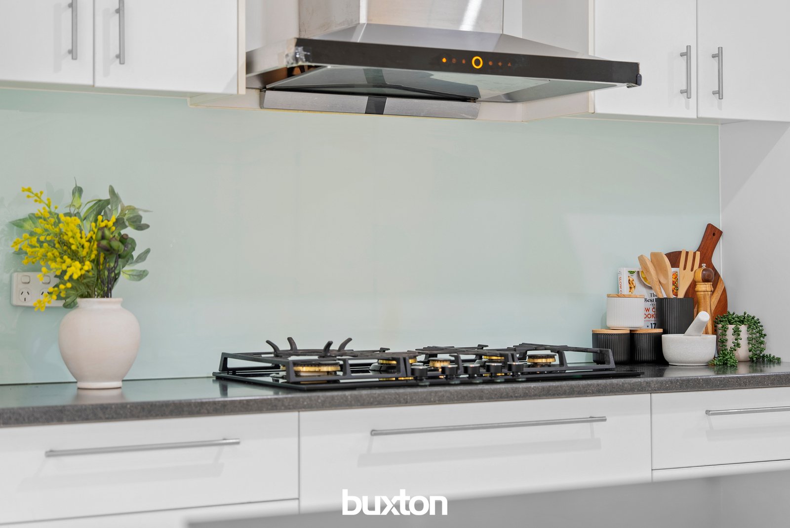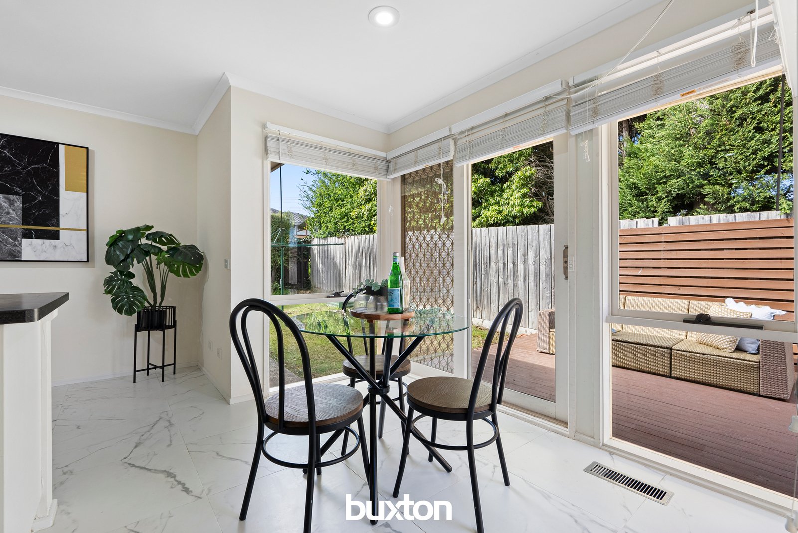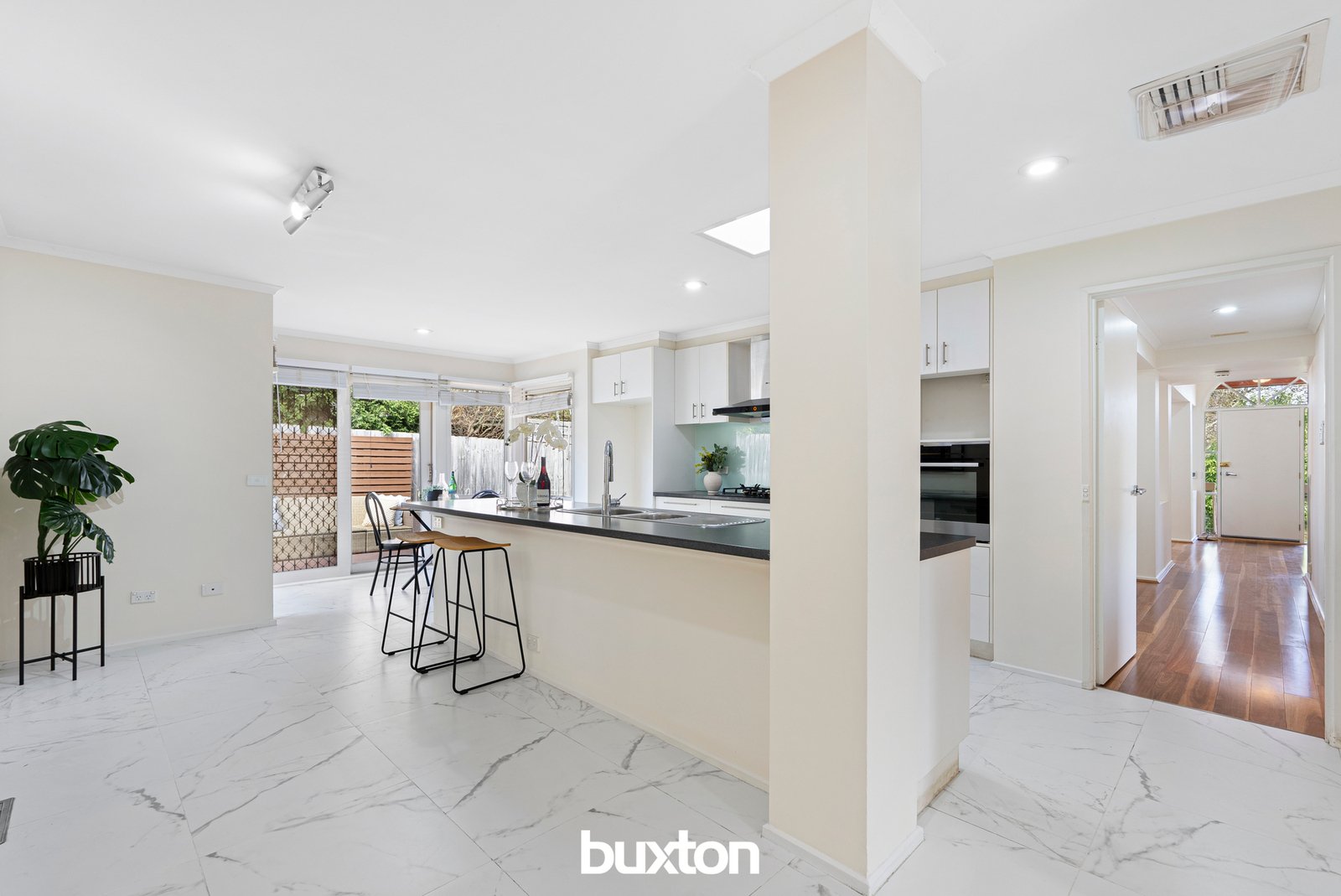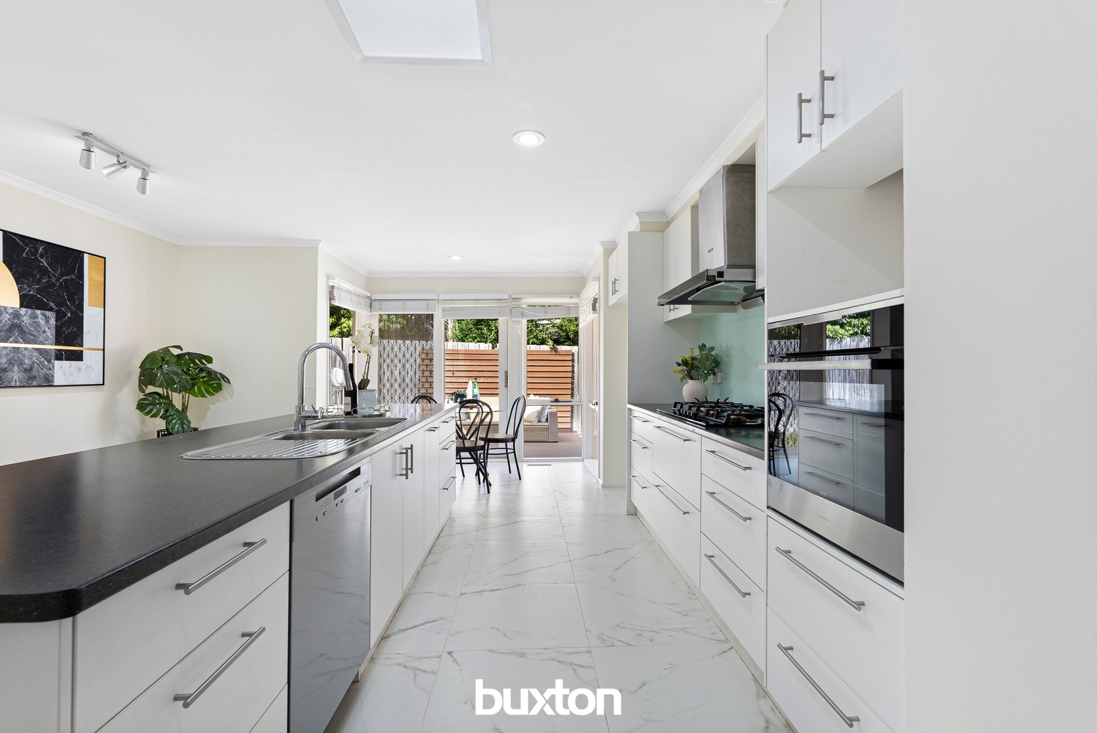 Through to the skylight bright kitchen, there’s occasion to cook with flair, with a 5-burner gas cooktop, powerful Fotile rangehood, Miele dishwasher and an oven that cleans itself to make light work of the mess. Meals are a pleasure across a sunny north facing dining area with its own private deck.