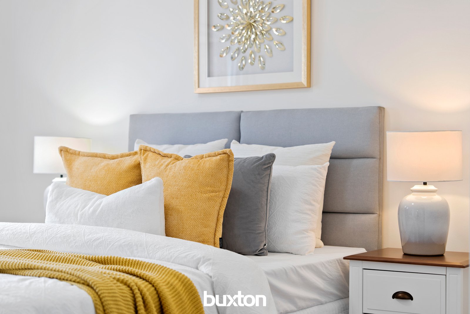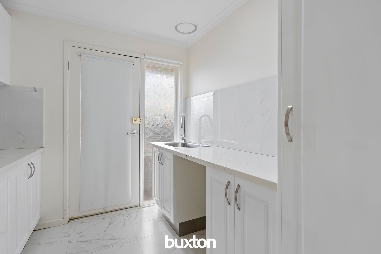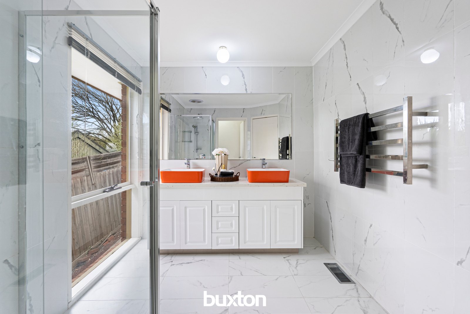 Calacatta tiling, rainfall showers and trendy orange and white basins in the ensuite brings some glamour to the daily bathing ritual.