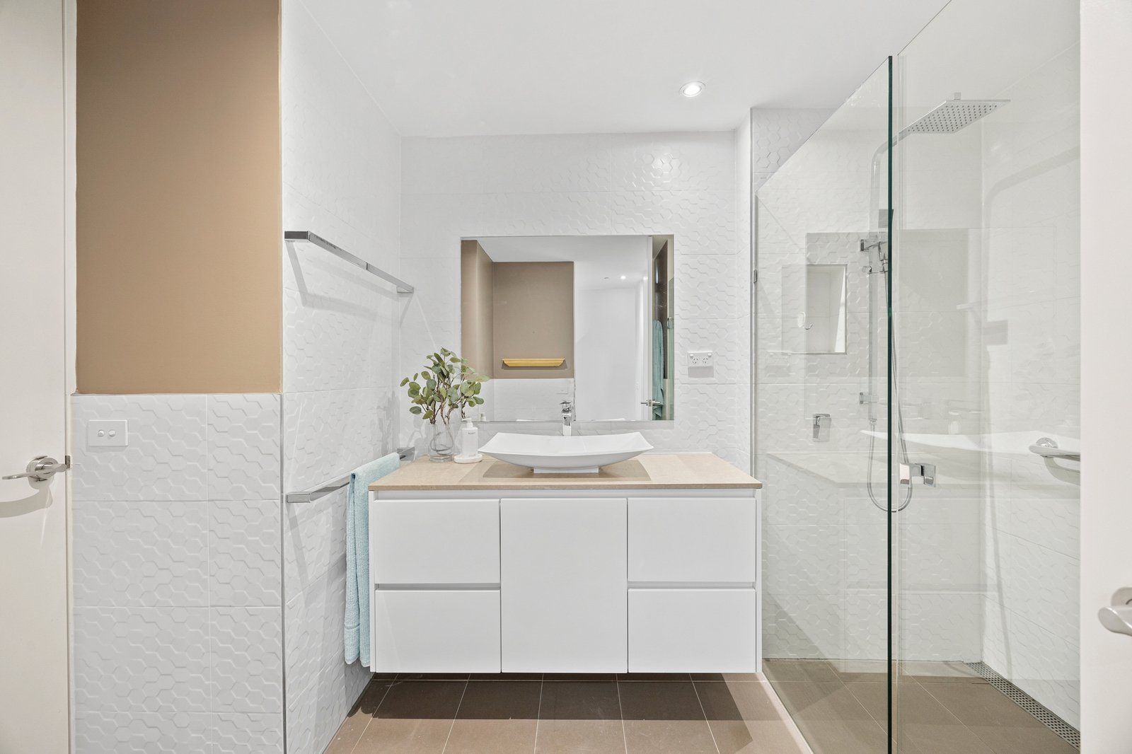 Two serene bedrooms with mirrored robes include one with semi-ensuite access to a luxe bathroom, complemented by a chic powder room.