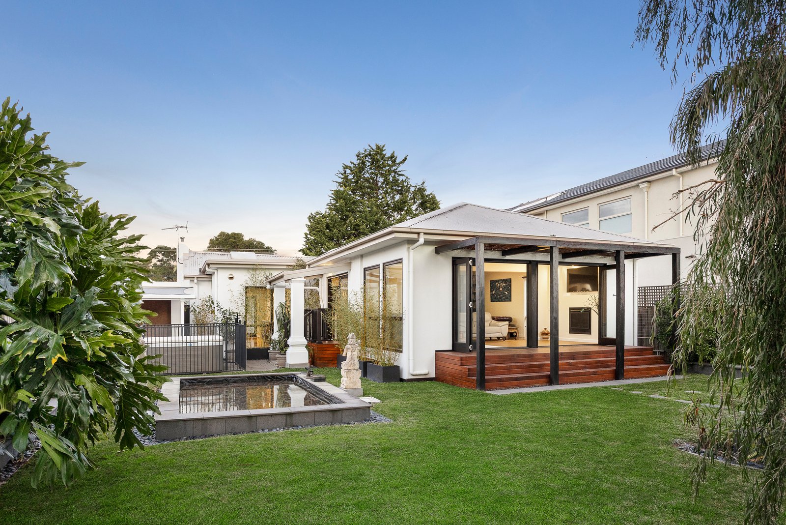 A perfect sanctuary with a garden-view bedroom and day-spa ensuite (with deep freestanding bath) secluded in their own quiet wing, this entertainers’ oasis provides space to relax by a warming open-fireplace, room to lounge and dine with a northerly aspect to a sunny spa-garden, and a space to entertain with a gorgeous gas-fire for cool winter days and dual bi-folds for warm summer nights.