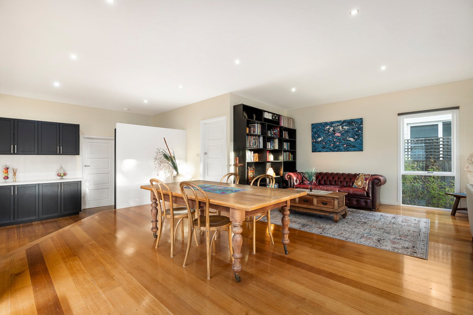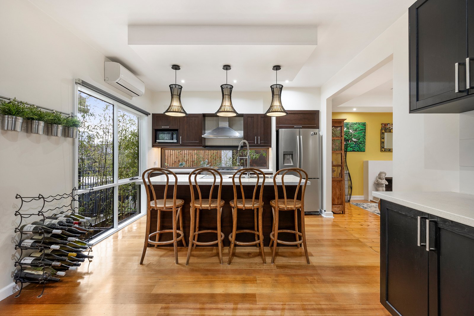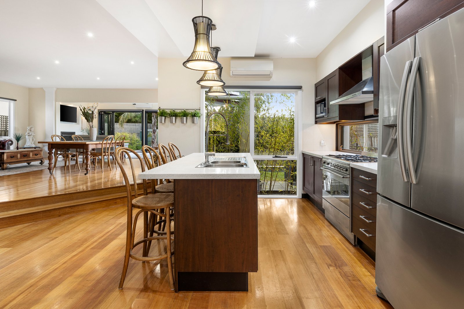 Appointed for a carefree life with a window-splash-backed stone and Smeg kitchen at the heart of the home, and bespoke bathrooms (with hand-sourced vanities) hidden away, this reverse-cycle air-conditioned home puts the focus on authenticity and tranquility with warm timber floors, sun-catching skylights and airy fan-cooling.