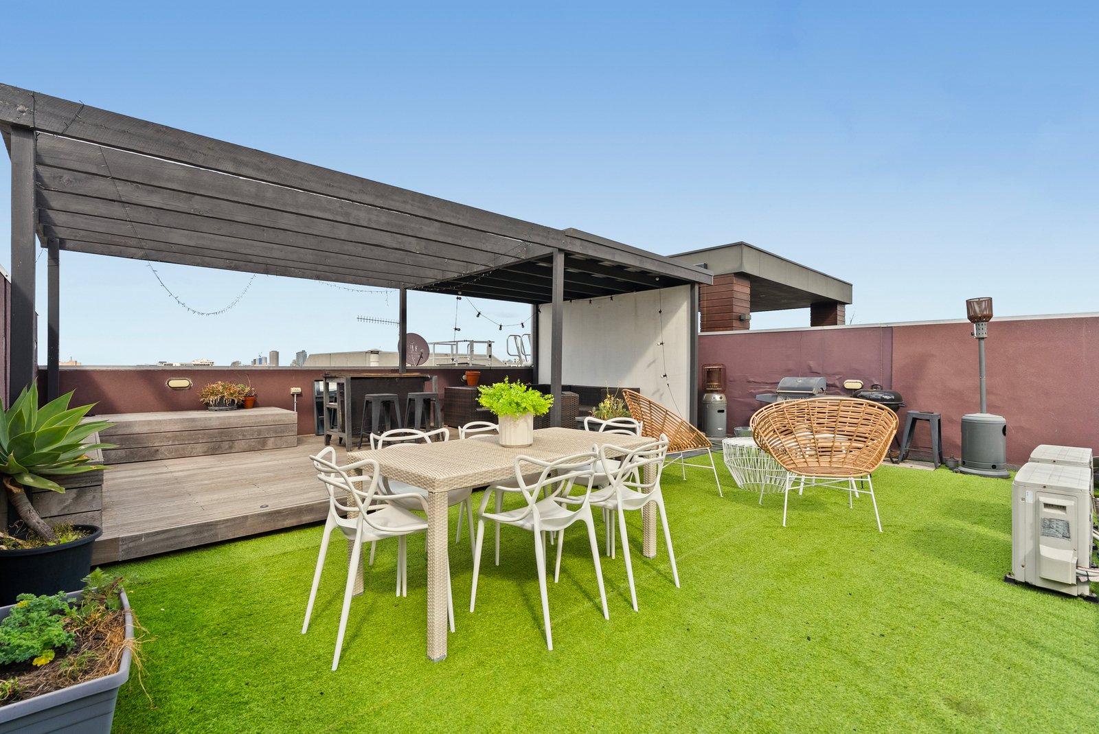 Sitting pretty on the top floor of a contemporary complex in the vibrant heart of South Yarra, this superb apartment is certain to impress. Featuring expansive open plan living, dining and kitchen, alongside two robed bedrooms, each light-filled, spacious and serviced by their own sparkling modern bathroom. The jewel in the crown of this sophisticated sanctuary is the inclusion of a balcony that leads up to a resort-style rooftop terrace, complete with astro turf, covered alfresco deck and abundant space to relax or entertain a crowd as you take in the surrounding panoramic views across the cityscape.