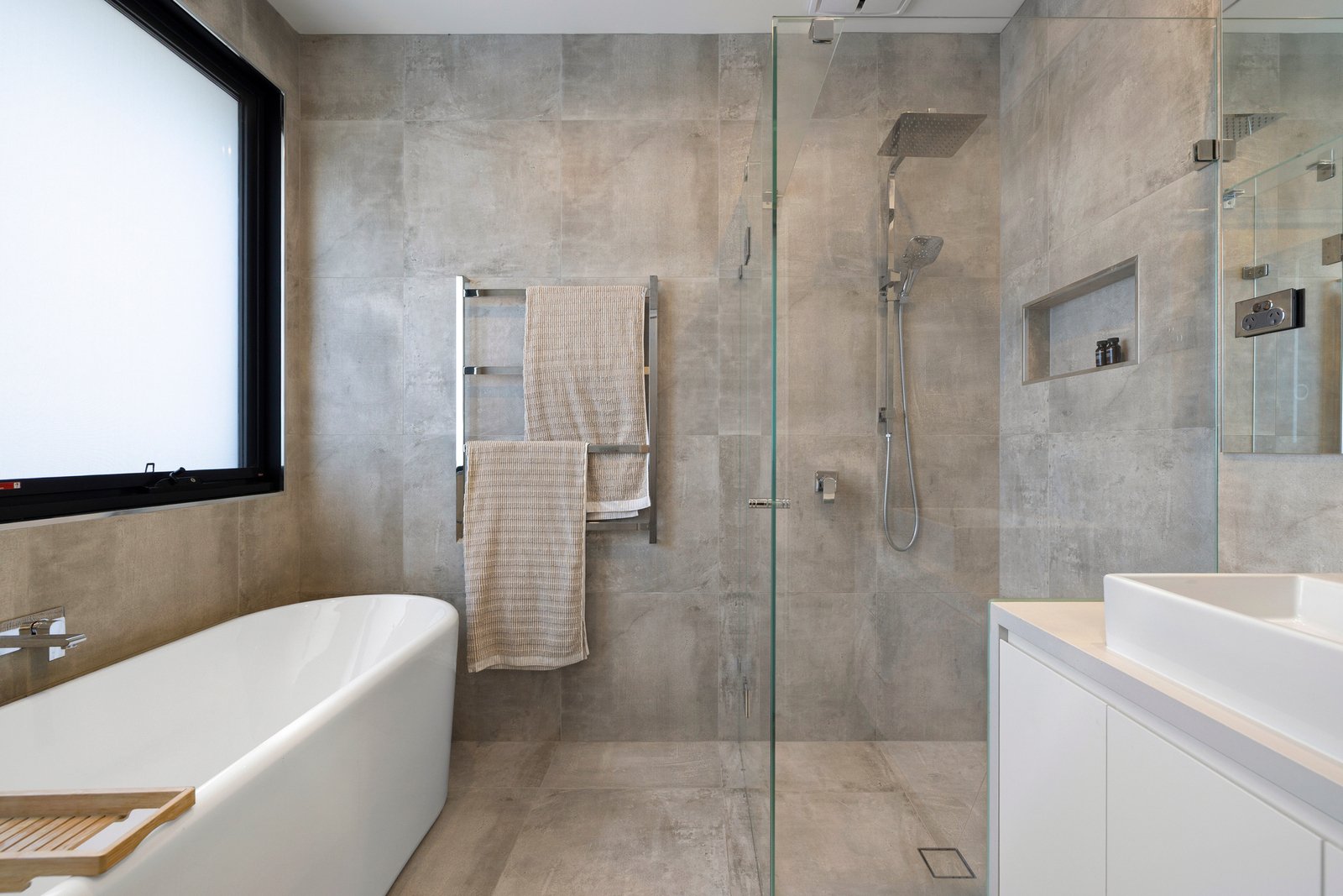Two additional bedrooms are positioned upstairs along with a genuine lounge/retreat. They share a stunning fully-tiled bathroom with sumptuous freestanding tub plus a separate powder room, while a second powder room is located downstairs for the convenience of guests.